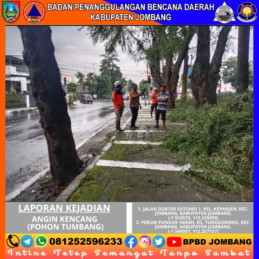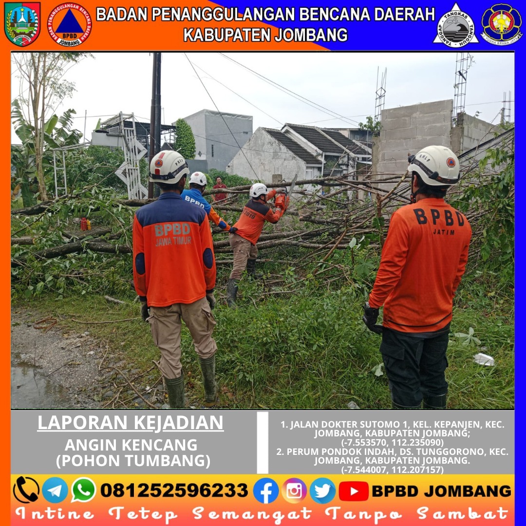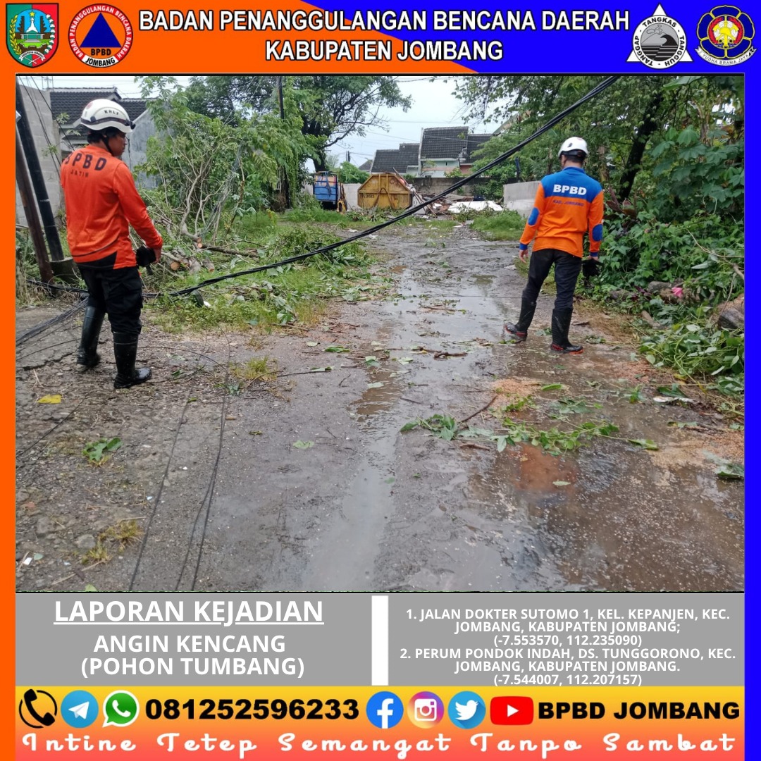 Cuaca ekstrem berupa hujan dengan intensitas tinggi yang disertai angin kencang kembali melanda wilayah Kabupaten Jombang pada Kamis, 02 April 2026 sekitar pukul 14.05 WIB. Kondisi tersebut mengakibatkan pohon tumbang di dua lokasi berbeda, yakni di Jalan Dokter Sutomo 1, Kelurahan Kepanjen, serta di kawasan Perum Pondok Indah, Desa Tunggorono, Kecamatan Jombang.