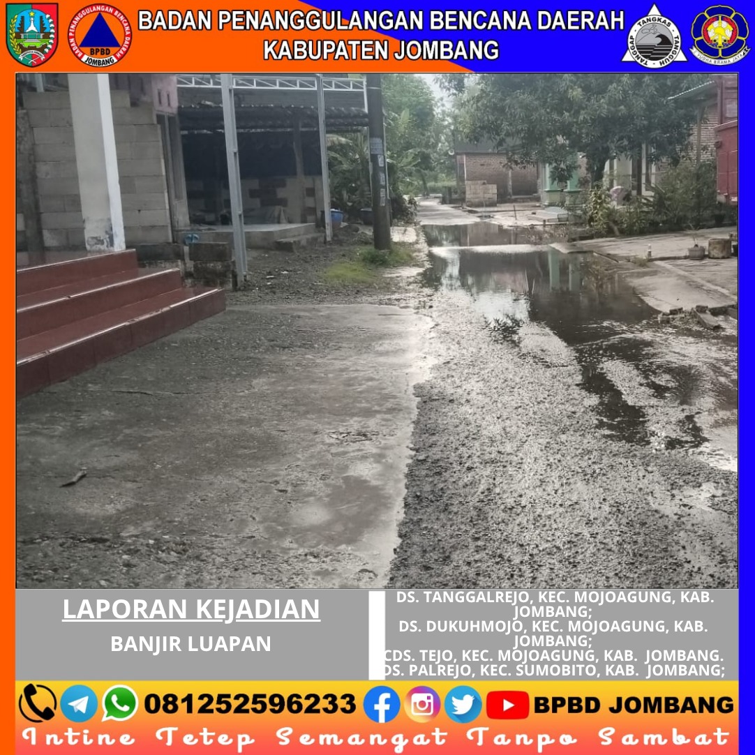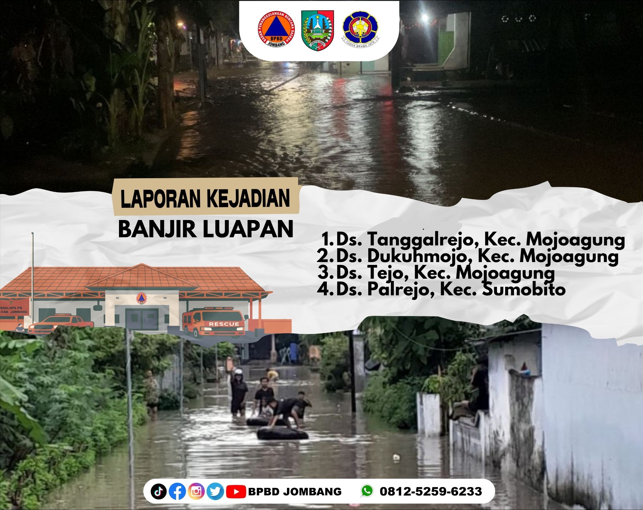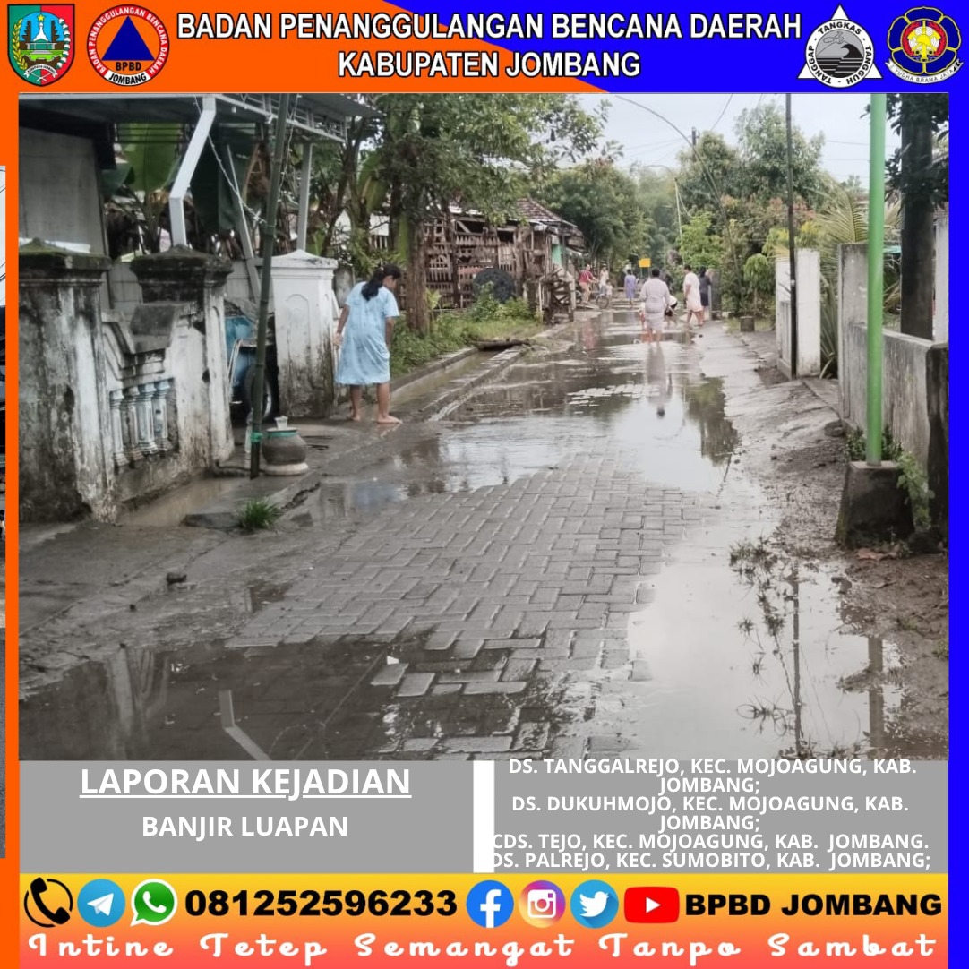 Hujan dengan intensitas tinggi yang mengguyur wilayah Kabupaten Jombang dan sekitarnya mengakibatkan terjadinya banjir luapan di beberapa titik pada Sabtu malam. Peristiwa ini berdampak pada sejumlah desa, di antaranya Dusun Kalibening Desa Tanggalrejo Kecamatan Mojoagung, Desa Dukuhmojo, Desa Tejo, serta Desa Palrejo Kecamatan Sumobito. Air meluap hingga menggenangi halaman rumah warga dan jalan desa, sehingga sempat mengganggu aktivitas masyarakat setempat.