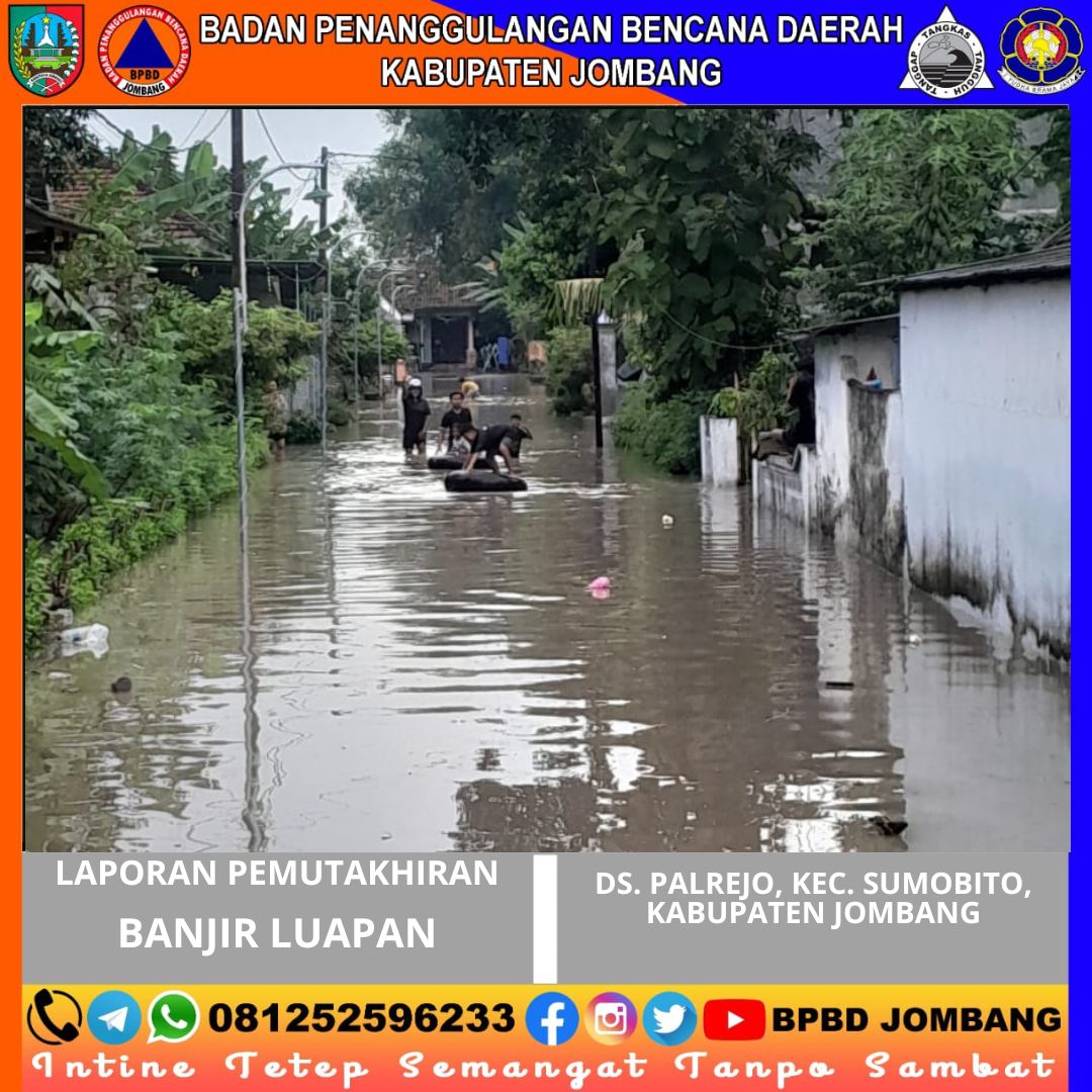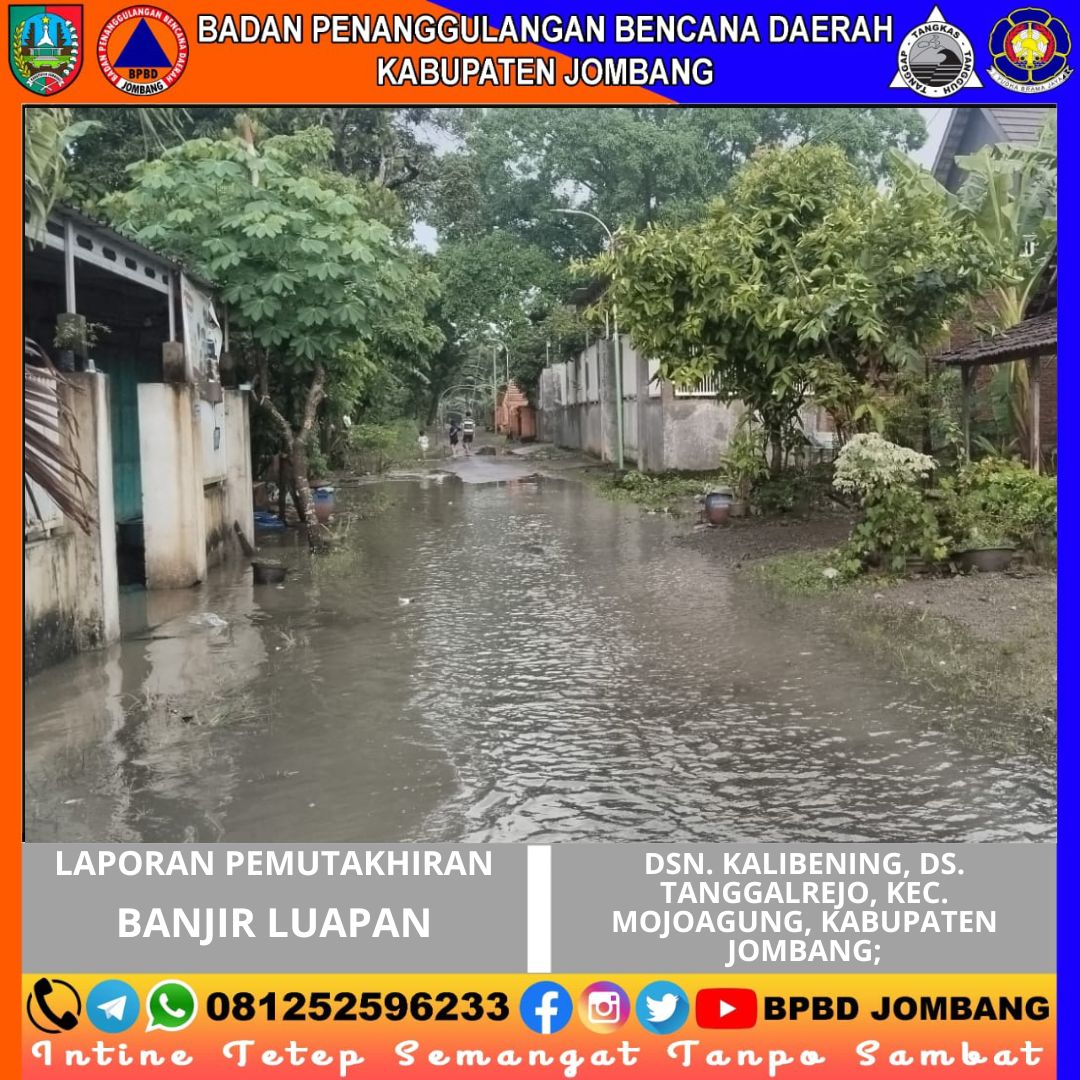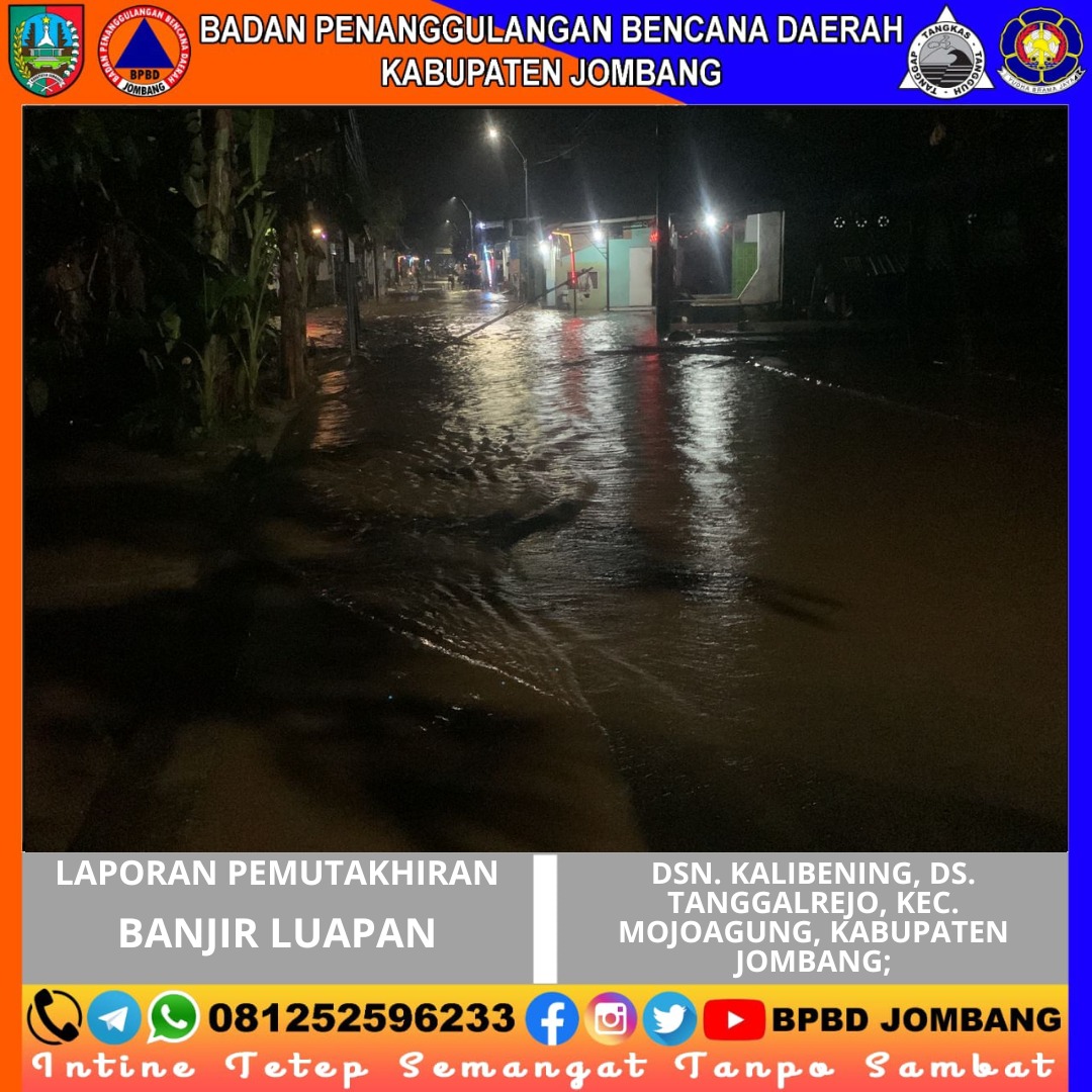 Hujan dengan intensitas tinggi yang mengguyur wilayah Kabupaten Jombang dan sekitarnya mengakibatkan terjadinya banjir luapan di beberapa titik pada Sabtu malam. Peristiwa ini berdampak pada sejumlah desa, di antaranya Dusun Kalibening Desa Tanggalrejo Kecamatan Mojoagung, Desa Dukuhmojo, Desa Tejo, serta Desa Palrejo Kecamatan Sumobito. Air meluap hingga menggenangi halaman rumah warga dan jalan desa, sehingga sempat mengganggu aktivitas masyarakat setempat.