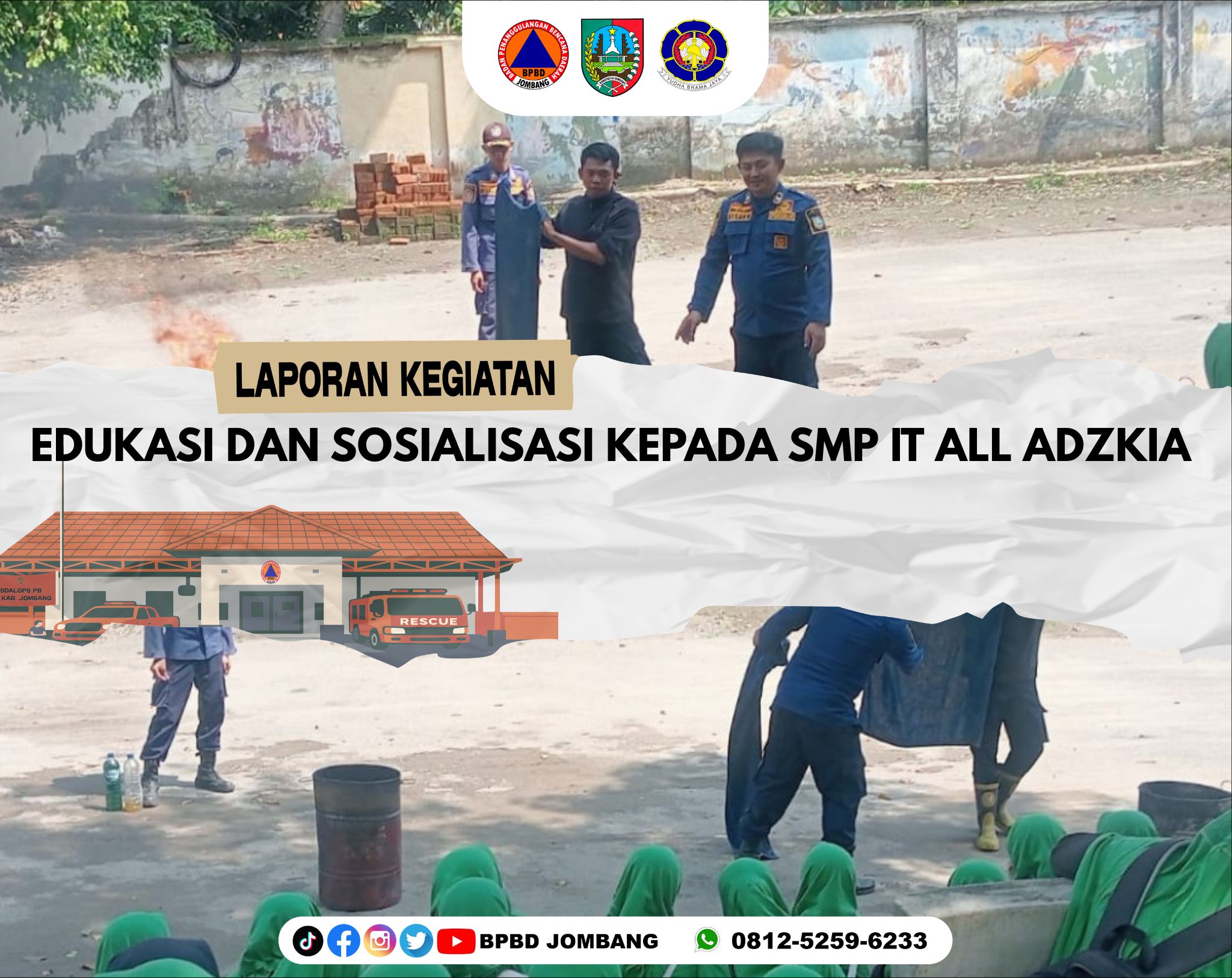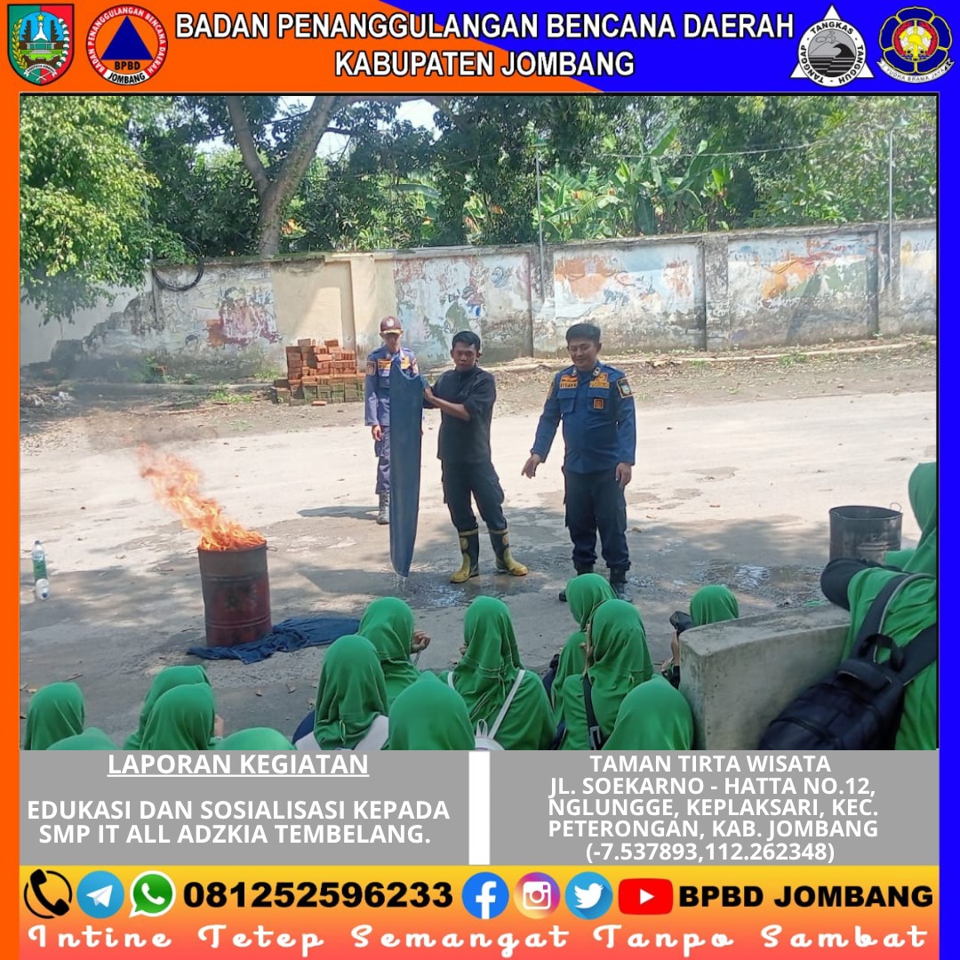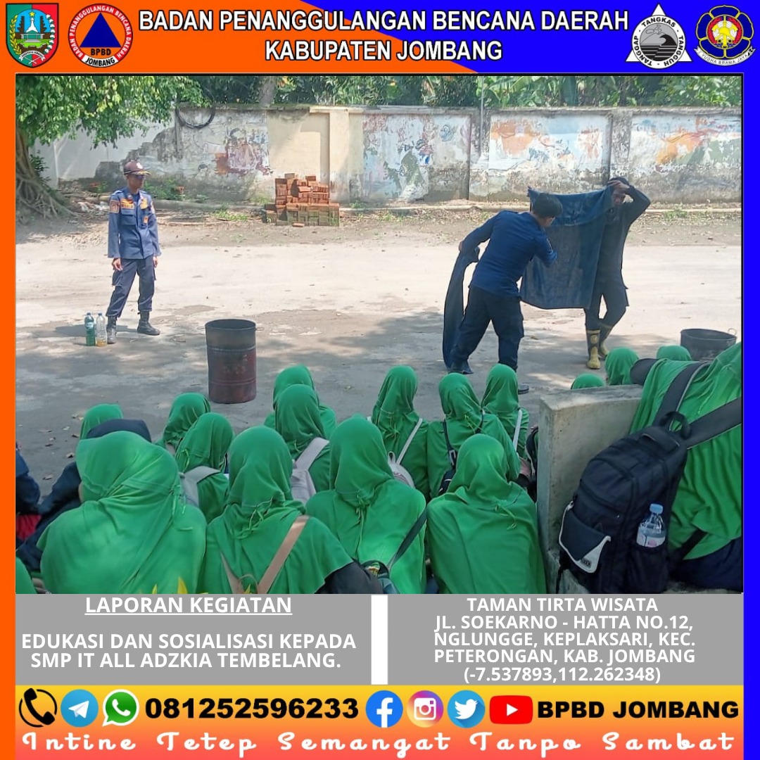 Upaya membangun kesadaran akan pentingnya kesiapsiagaan bencana terus digencarkan oleh BPBD Kabupaten Jombang melalui kegiatan edukasi dan sosialisasi kepada para pelajar. Kali ini, giliran siswa-siswi SMP IT All Adzkia Tembelang yang mendapatkan pembekalan langsung dari Tim Pemadam Kebakaran dan Penyelamatan Jombang dalam kegiatan yang berlangsung di kawasan Taman Tirta Wisata Jombang.
