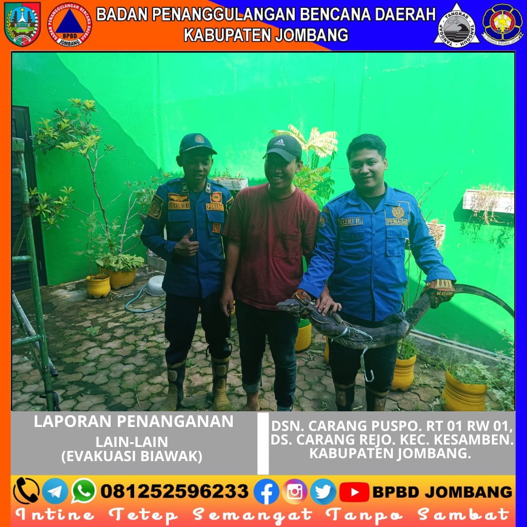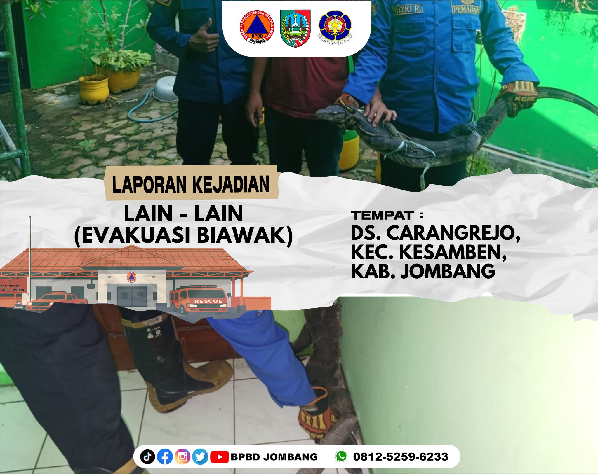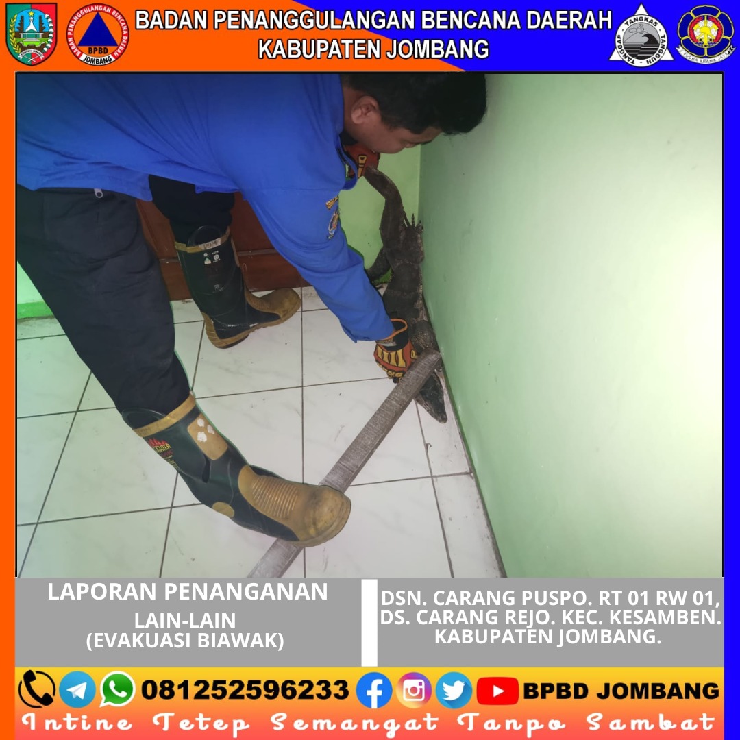 Warga Dusun Carang Puspo, Desa Carang Rejo, Kecamatan Kesamben, Kabupaten Jombang sempat dikejutkan dengan kemunculan seekor biawak di dalam rumah. Hewan tersebut ditemukan berada di area ruang makan, tepatnya di belakang lemari, sehingga menimbulkan rasa khawatir bagi penghuni rumah.