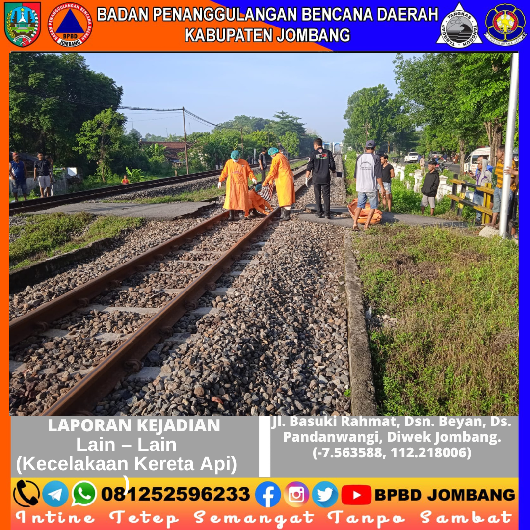 Pada kamis, 04 Januari 2024, Jam 06.30 WIB terdapat laporan dari warga bahwa telah terjadi kecelakaan kereta api yang berlokasi di Jl. Basuki Rahmat, Dsn. Beyan, Ds. Pandanwangi, Diwek Jombang (-7.563588, 112.218006).