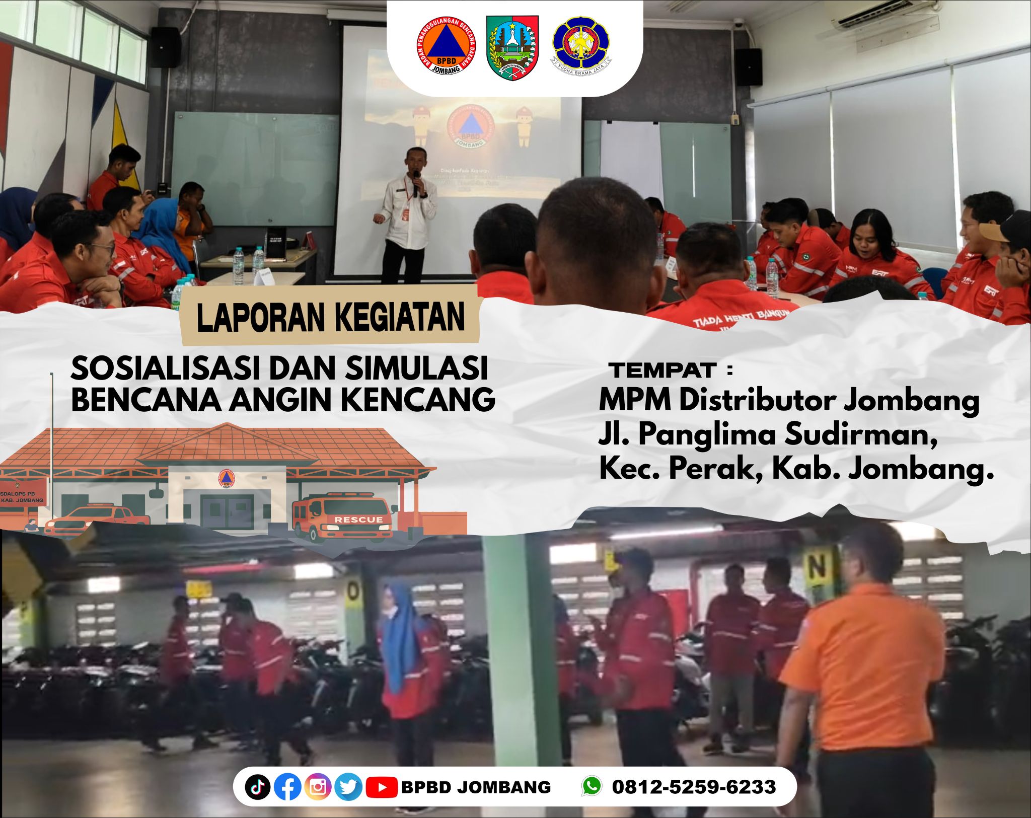 Badan Penanggulangan Bencana Daerah (BPBD) Kabupaten Jombang melalui Pusat Pengendalian Operasi Penanggulangan Bencana (Pusdalops PB) terus memperkuat upaya peningkatan kesiapsiagaan masyarakat terhadap potensi bencana hidrometeorologi. Salah satu langkah nyata tersebut diwujudkan melalui kegiatan sosialisasi dan simulasi penanggulangan bencana angin puting beliung yang dilaksanakan pada Rabu, 28 Januari 2026, bertempat di MPM Distributor Jombang, Desa Pagerwojo, Kecamatan Perak.