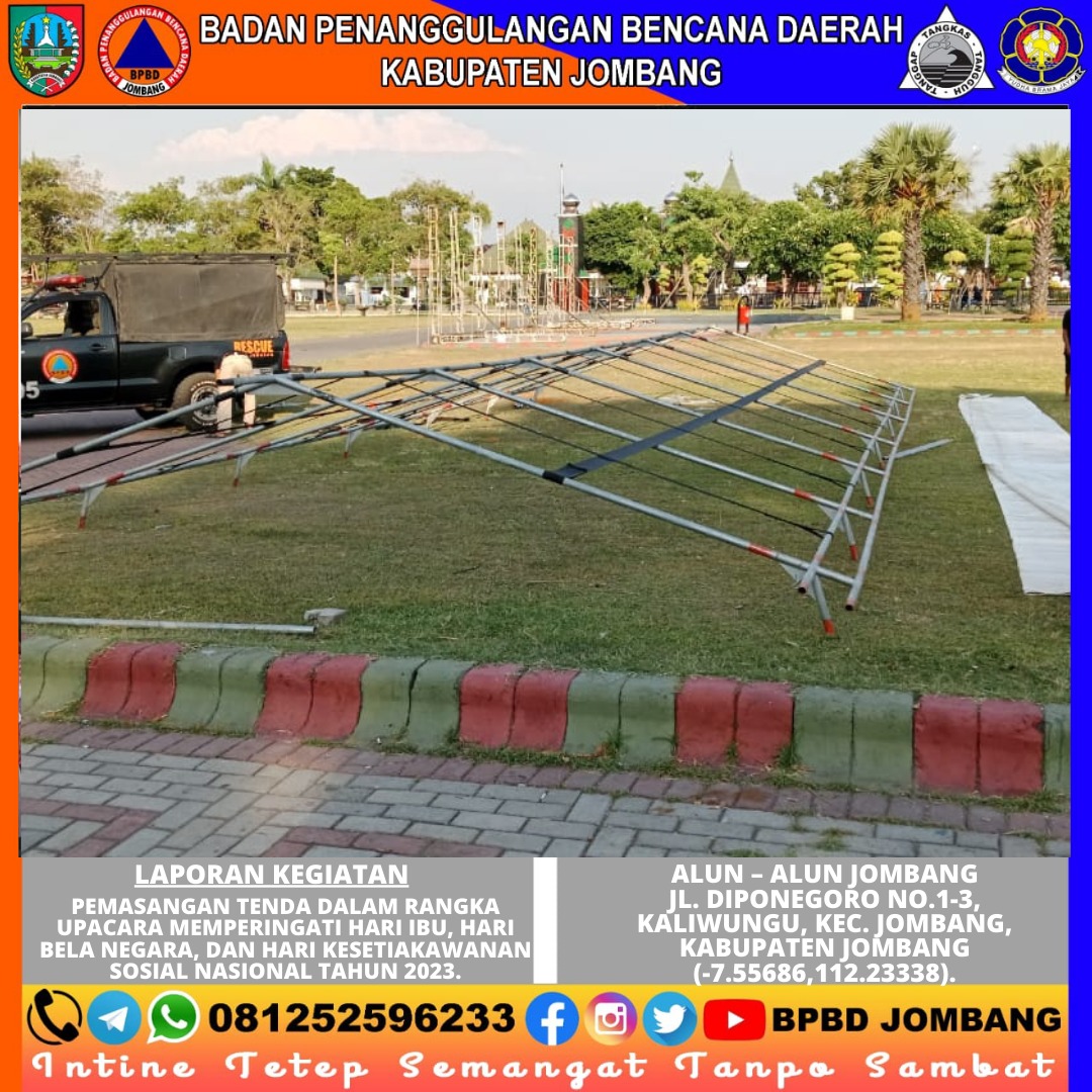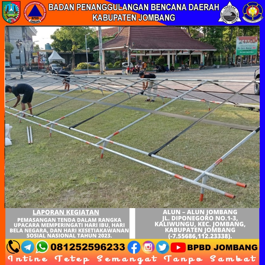 PusdalOps BPBD Kabupaten Jombang membantu Pemasangan Tenda Dalam Rangka Upacara Memperingati Hari Ibu, Hari Bela Negara, dan Hari Kesetiakawanan Sosial Nasional tahun 2023.
