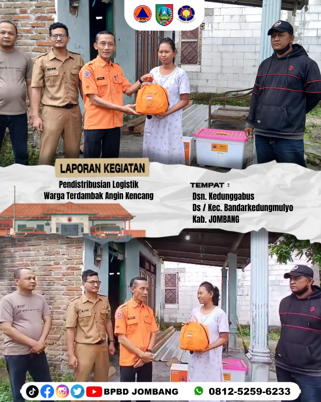 Sebagai bentuk kehadiran pemerintah daerah dalam memberikan perlindungan dan pelayanan kepada masyarakat, BPBD Kabupaten Jombang melaksanakan kegiatan pendistribusian bantuan logistik bagi warga terdampak kejadian angin kencang yang melanda Dusun Kedunggabus, Desa/Kecamatan Bandarkedungmulyo, Kabupaten Jombang. Kegiatan ini dilaksanakan pada Selasa, 27 Januari 2026, sebagai bagian dari upaya penanganan tanggap darurat bencana alam.