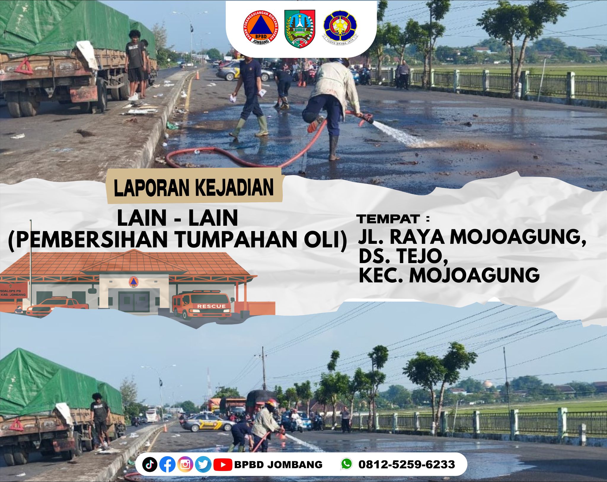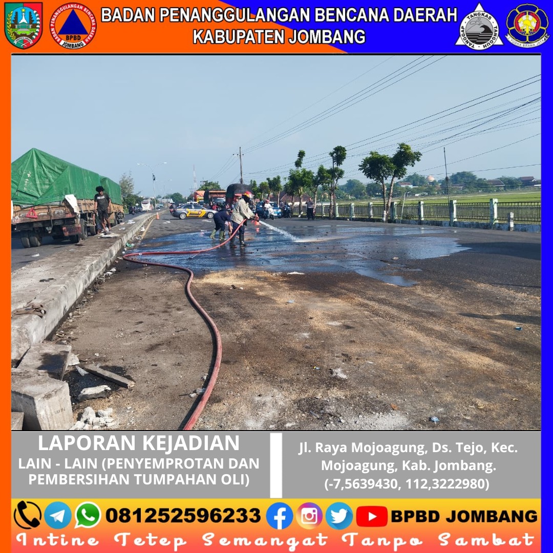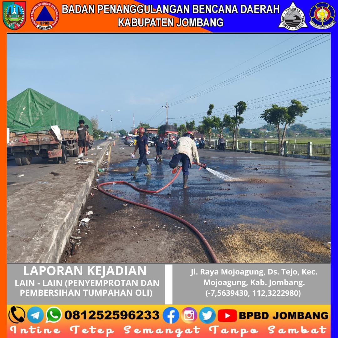 Keselamatan pengguna jalan kembali menjadi prioritas utama dalam penanganan insiden di wilayah Kabupaten Jombang. Pada Selasa pagi (28/04/2026), tim Pemadam Kebakaran dan Penyelamatan Kabupaten Jombang bergerak cepat menangani tumpahan oli di Jl. Raya Mojoagung, tepatnya di Desa Tejo, Kecamatan Mojoagung, yang berpotensi membahayakan pengendara.