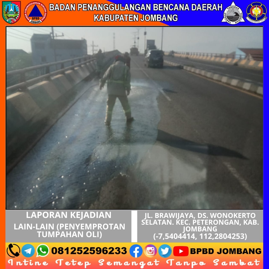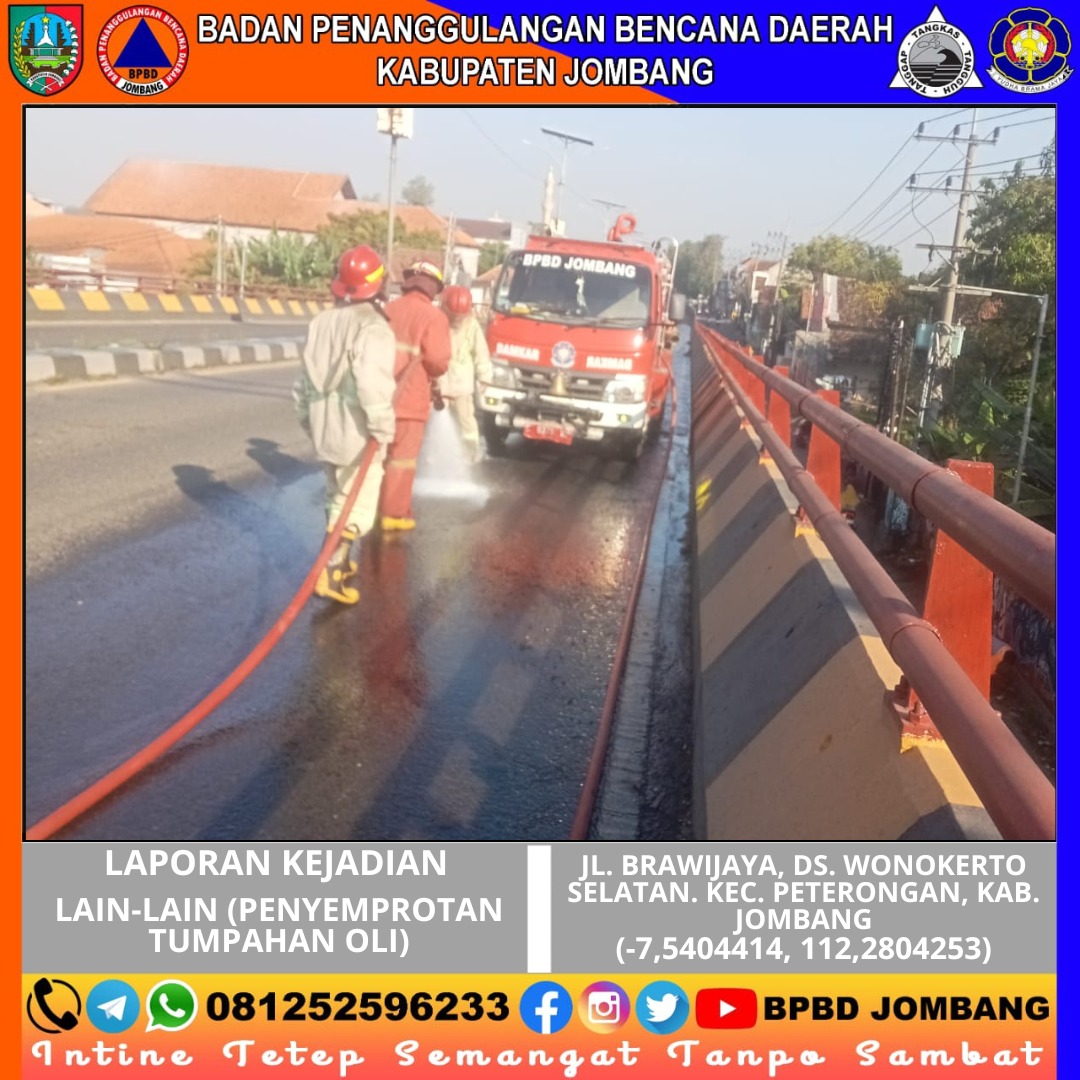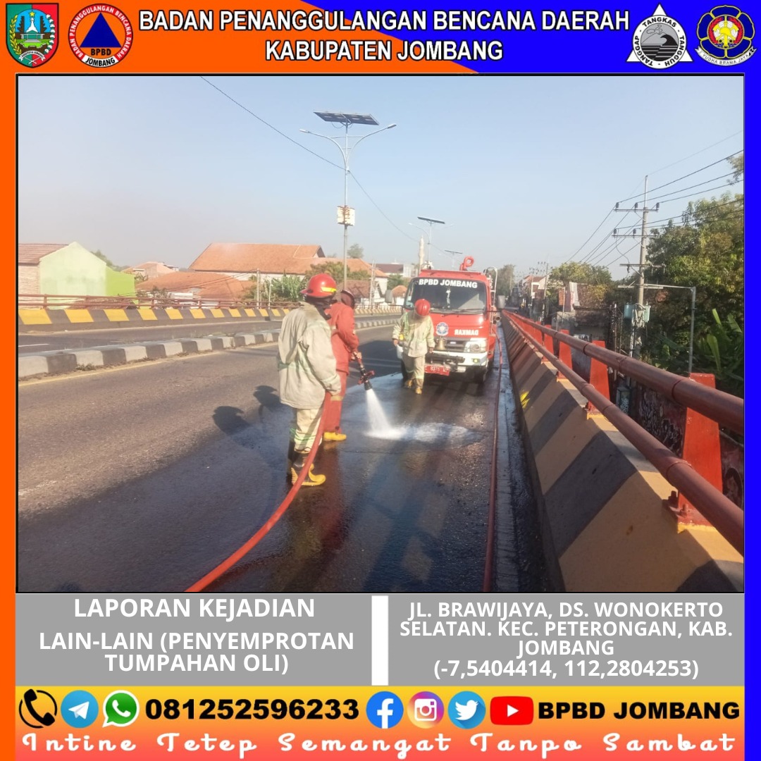 Potensi bahaya di jalan raya kembali berhasil diantisipasi dengan cepat oleh tim pemadam kebakaran dan penyelamat Kabupaten Jombang. Kali ini, penanganan dilakukan terhadap tumpahan oli yang ditemukan di ruas Jalan Brawijaya, Desa Wonokerto Selatan, Kecamatan Peterongan, yang berpotensi membahayakan pengguna jalan.