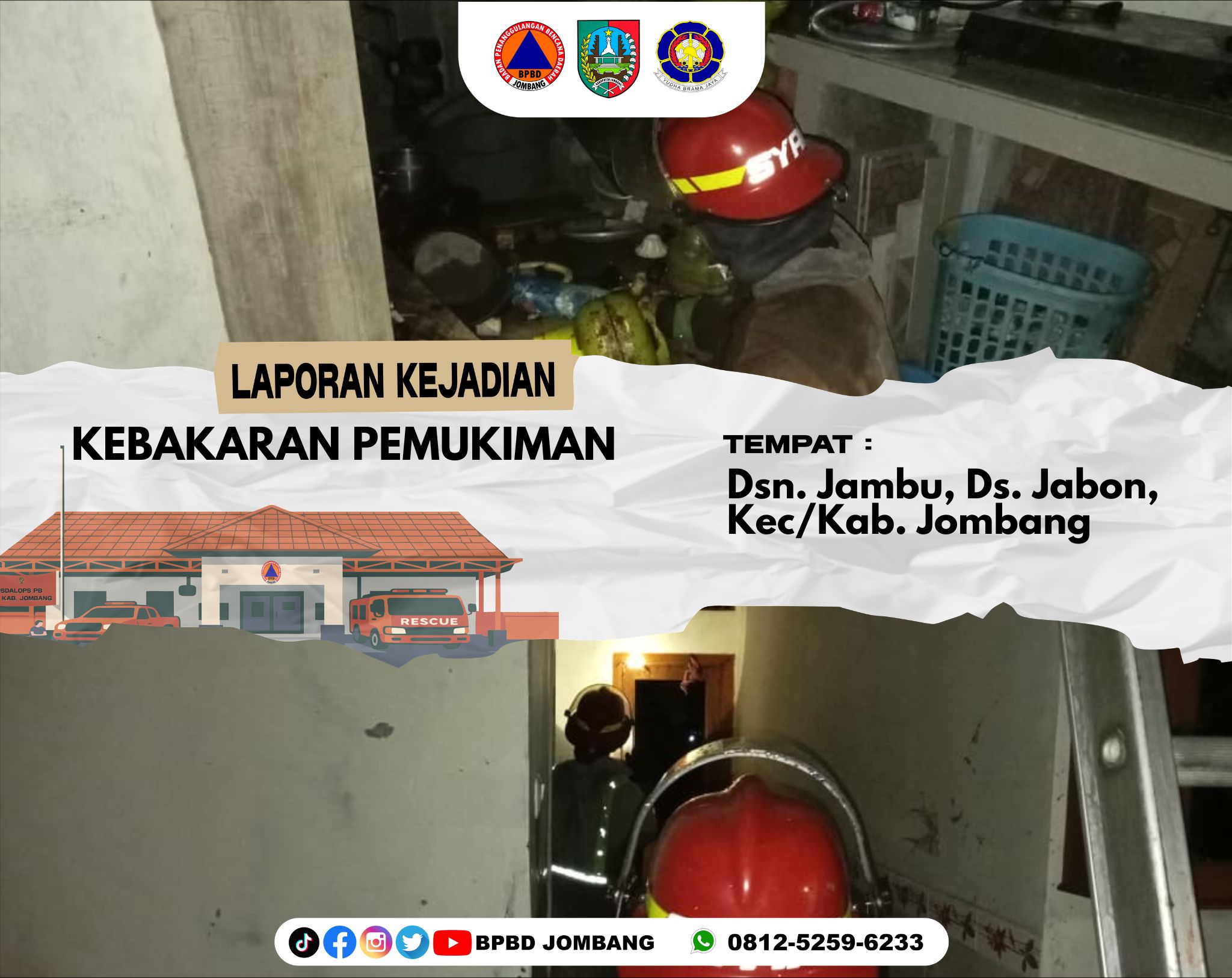 Peristiwa kebakaran pemukiman terjadi di Dusun Jambu, Desa Jabon, Kecamatan Jombang, Kabupaten Jombang pada Rabu, 18 Maret 2026. Kebakaran tersebut menghanguskan sebuah rumah kontrakan milik Bapak Hari dengan ukuran bangunan kurang lebih 8 x 18 meter persegi, serta mengakibatkan kerugian materiil yang diperkirakan mencapai ± Rp100.000.000.
