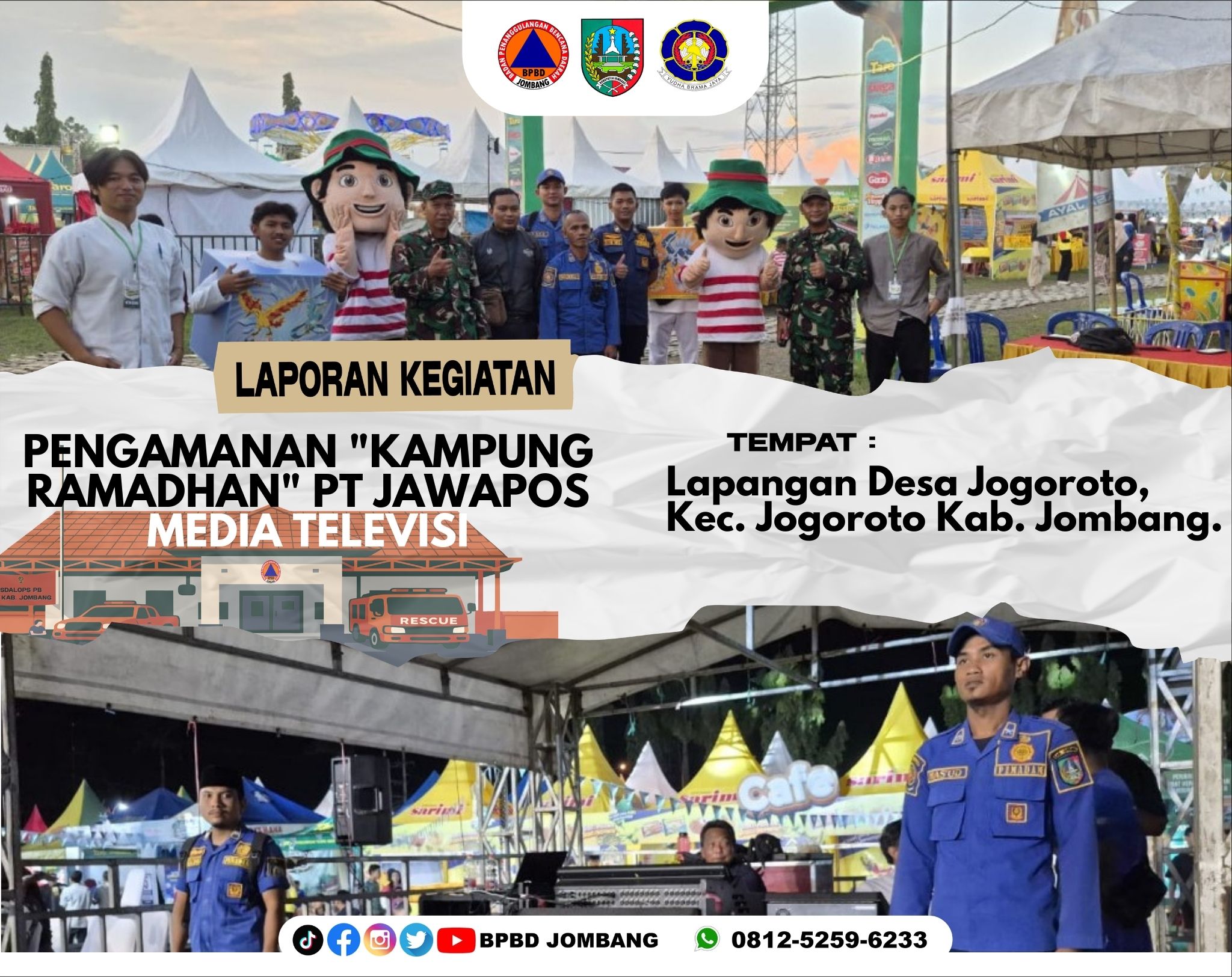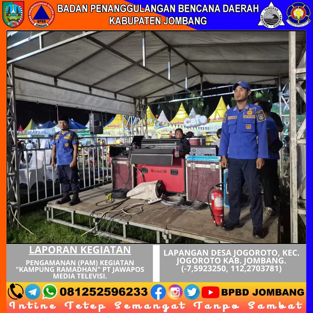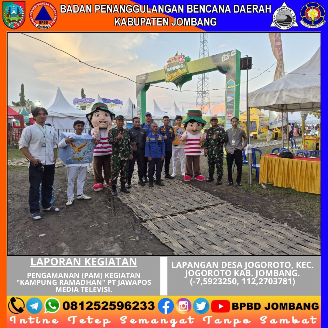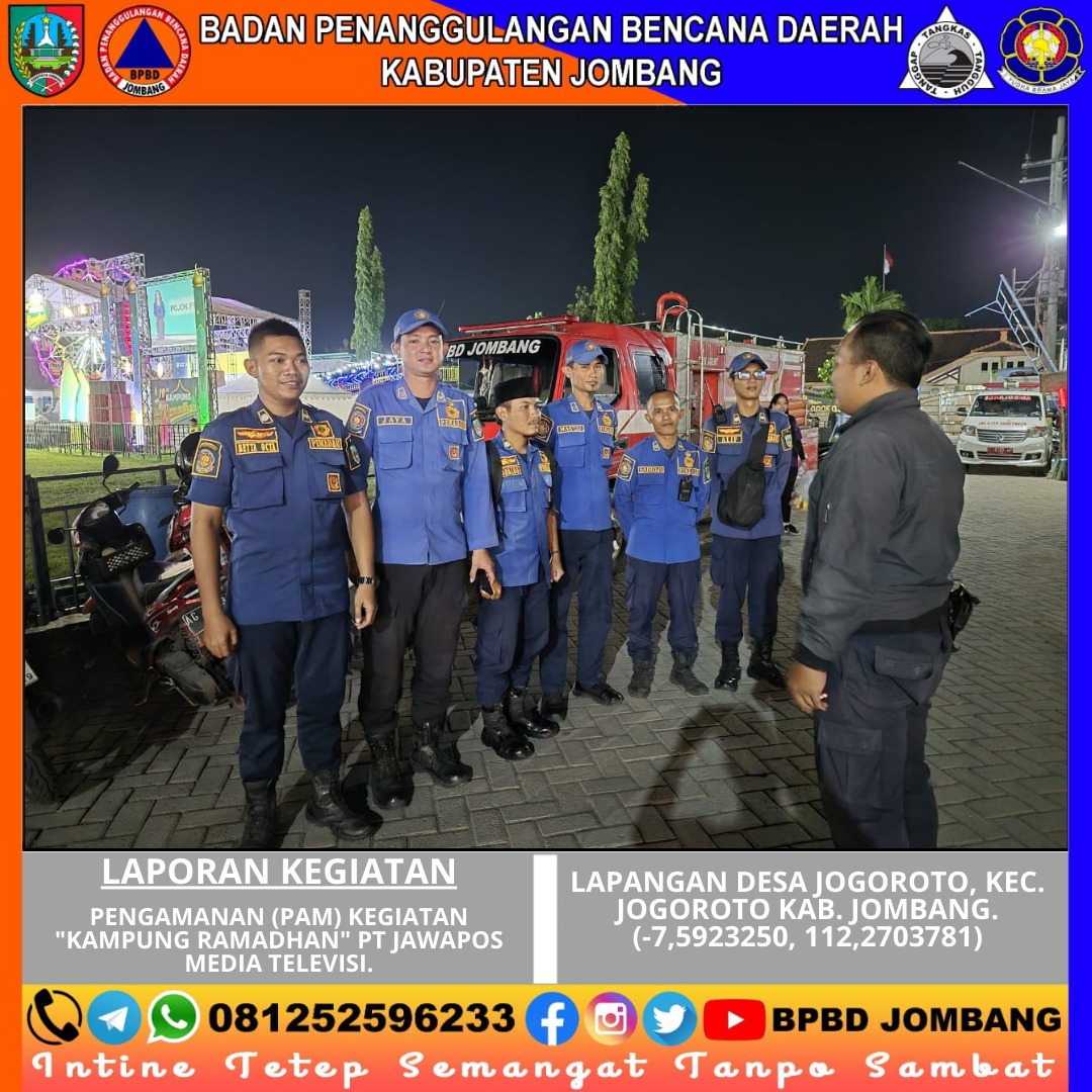 BPBD Kabupaten Jombang melalui Pos Pemadam Kebakaran Jombang melaksanakan kegiatan pengamanan (PAM) dalam rangka mendukung pelaksanaan acara “Kampung Ramadhan” yang diselenggarakan oleh PT Jawapos Media Televisi. Kegiatan tersebut berlangsung di Lapangan Desa Jogoroto, Kecamatan Jogoroto, Kabupaten Jombang pada Rabu, 11 Maret 2026 mulai pukul 17.00 WIB.