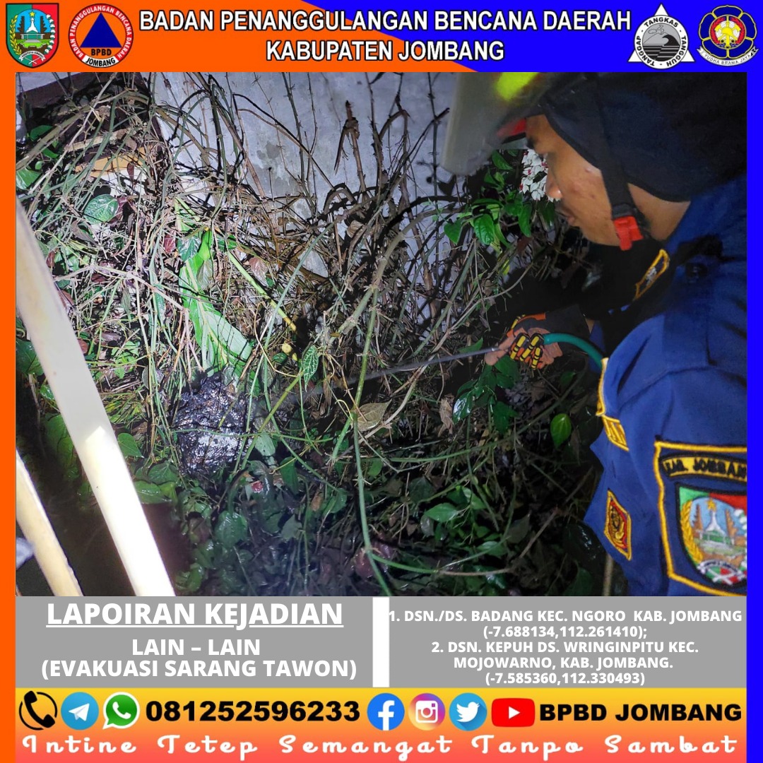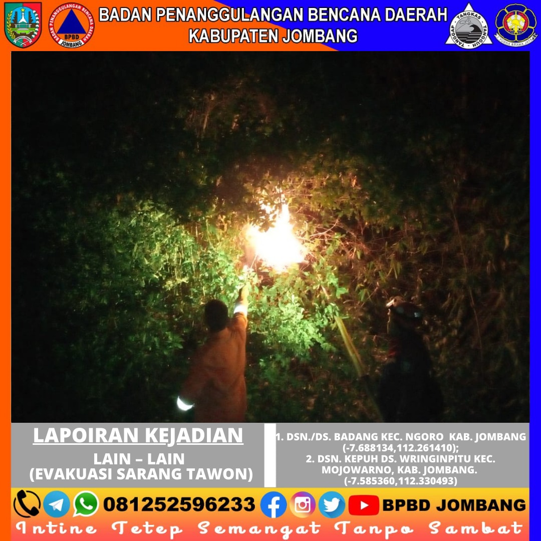 Senin, 05 Agustus 2024 Terdapat laporan masuk dari warga tentang adanya sarang tawon yang membuat warga resah, di khawatirkan sarang tawon tersebut berdampak pada sengatan kepada warga yang rumahnya sekitar lokasi tersebut. Lokasi yang terdampak ada 2 (dua) tempat yakni 1. Dsn./Ds. Badang Kec. Ngoro Kab. Jombang (-7.688134,112.261410) dan Dsn. Kepuh Ds. Wringinpitu Kec. Mojowarno, Kab. Jombang. (-7.585360,112.330493).