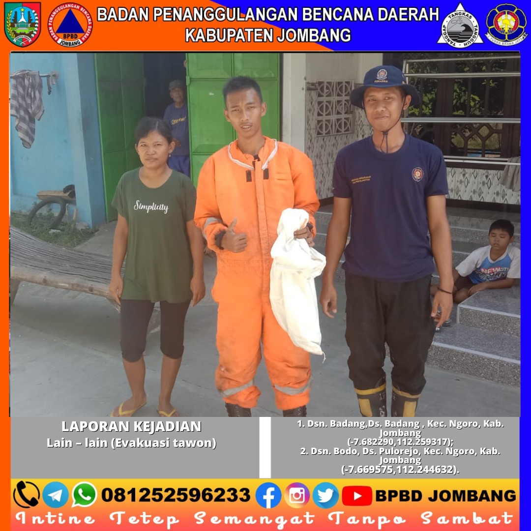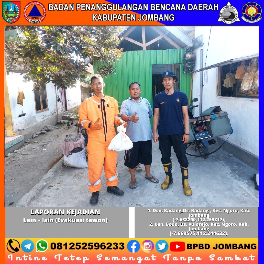 Pemadam kebakaran Kabupaten Jombang melakukan penanganan evakuasi sarang tawon di 2 tempat yakni Dsn. Badang,Ds. Badang , Kec. Ngoro, Kab. Jombang (-7.682290,112.259317) dan Dsn. Bodo, Ds. Pulorejo, Kec. Ngoro, Kab. Jombang (-7.669575,112.244632).