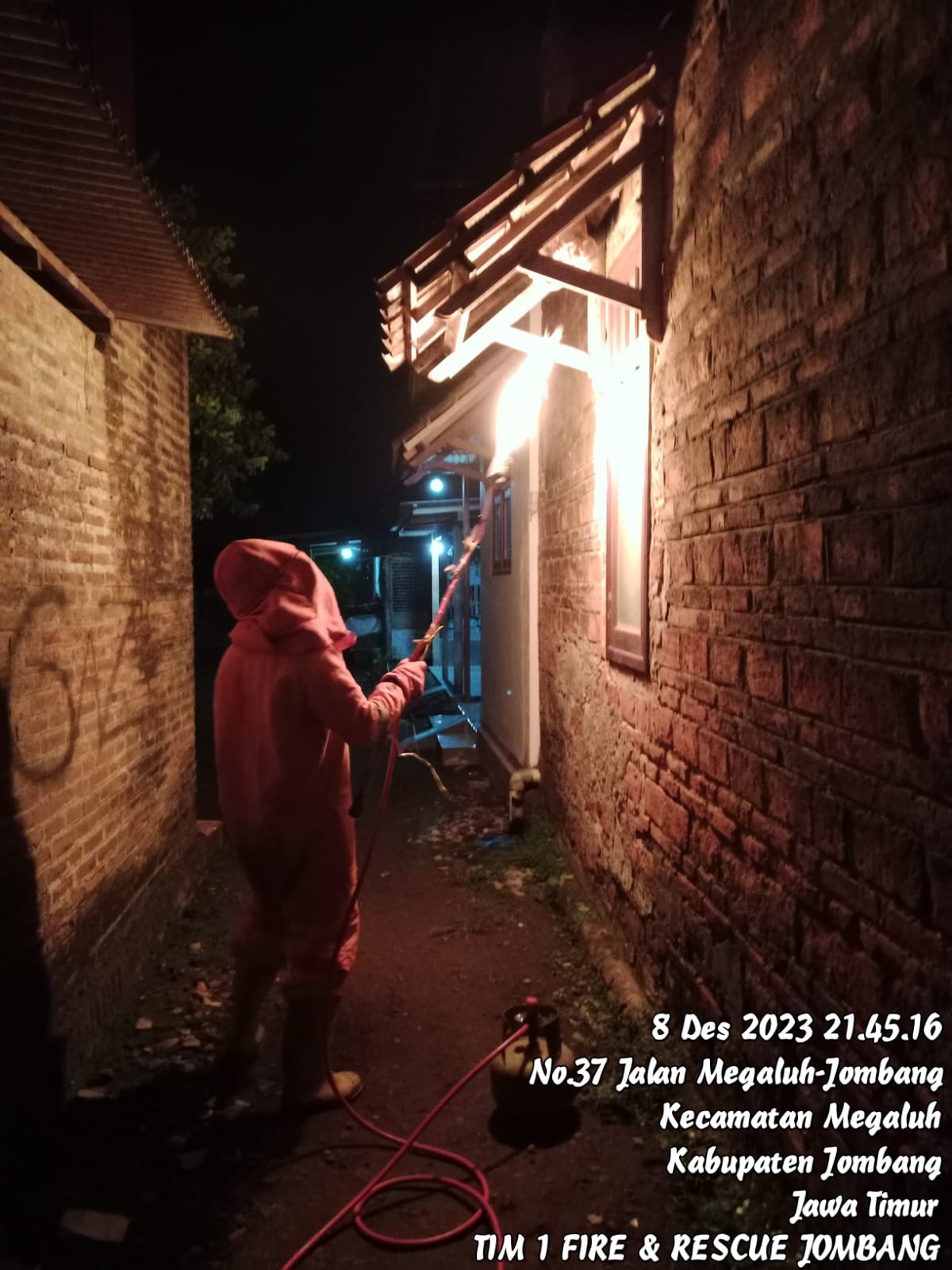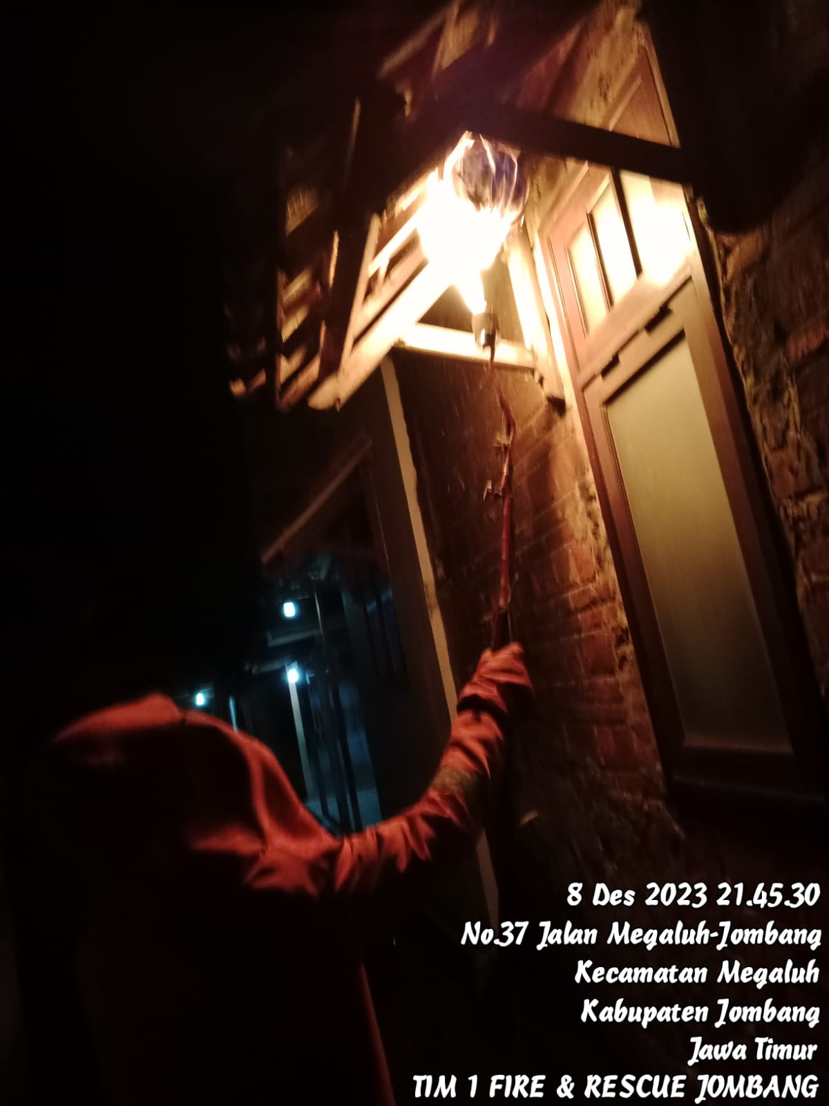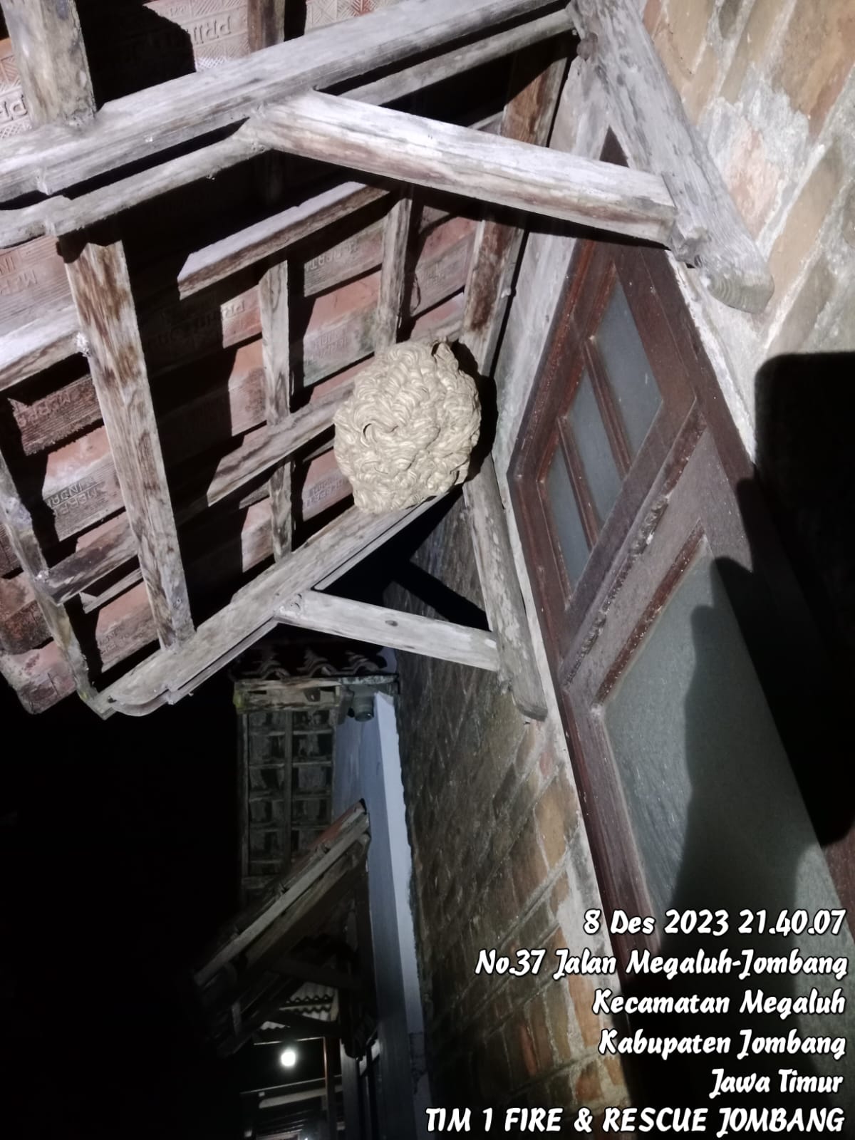 Pemadam kebakaran Kabupaten Jombang melakukan penanganan evakuasi sarang tawon di Dsn. Kedungtimongo, RT/RW: 009/001, Ds. Megaluh, Kec. Megaluh, Kab. Jombang pada Jumat, 08 Desember 2023.