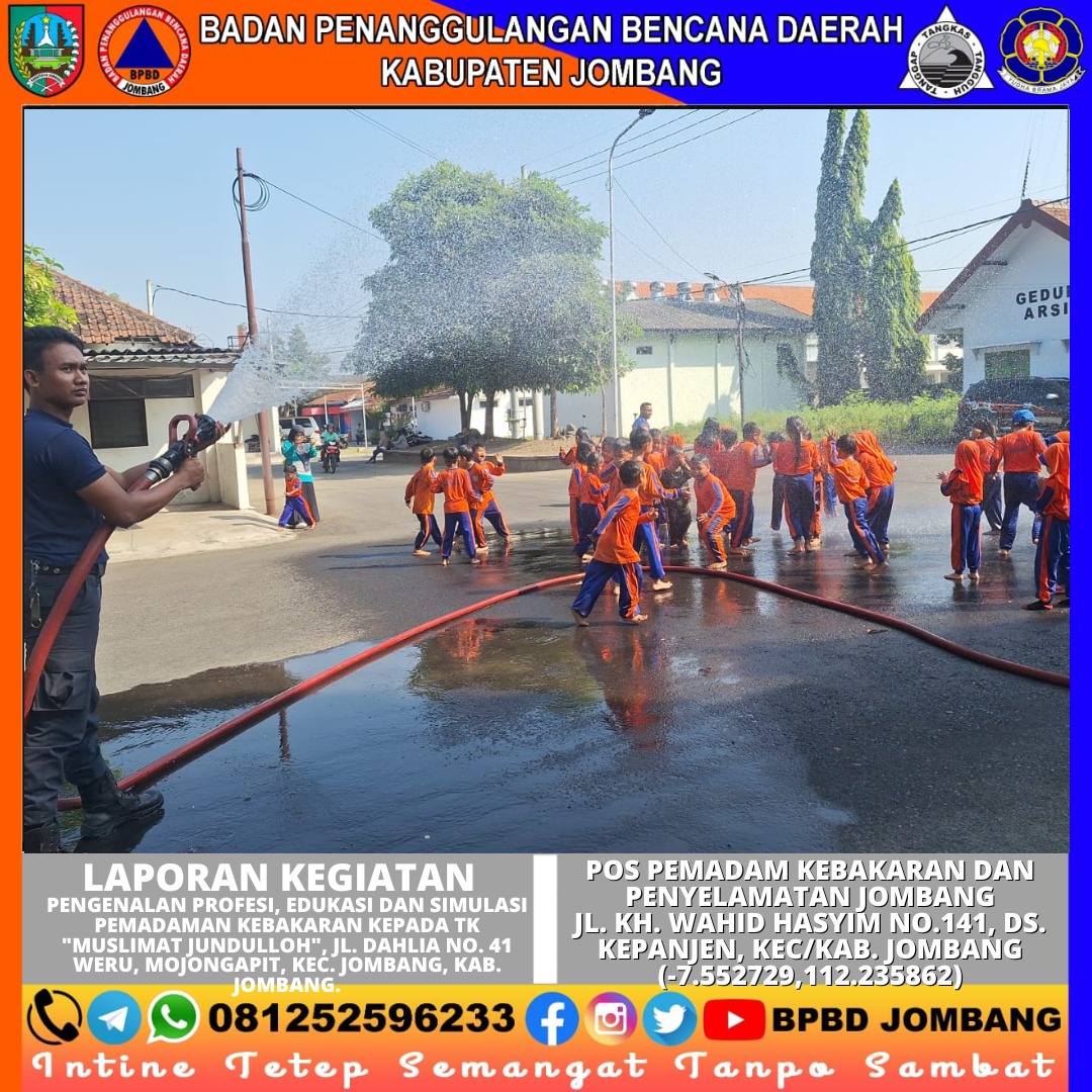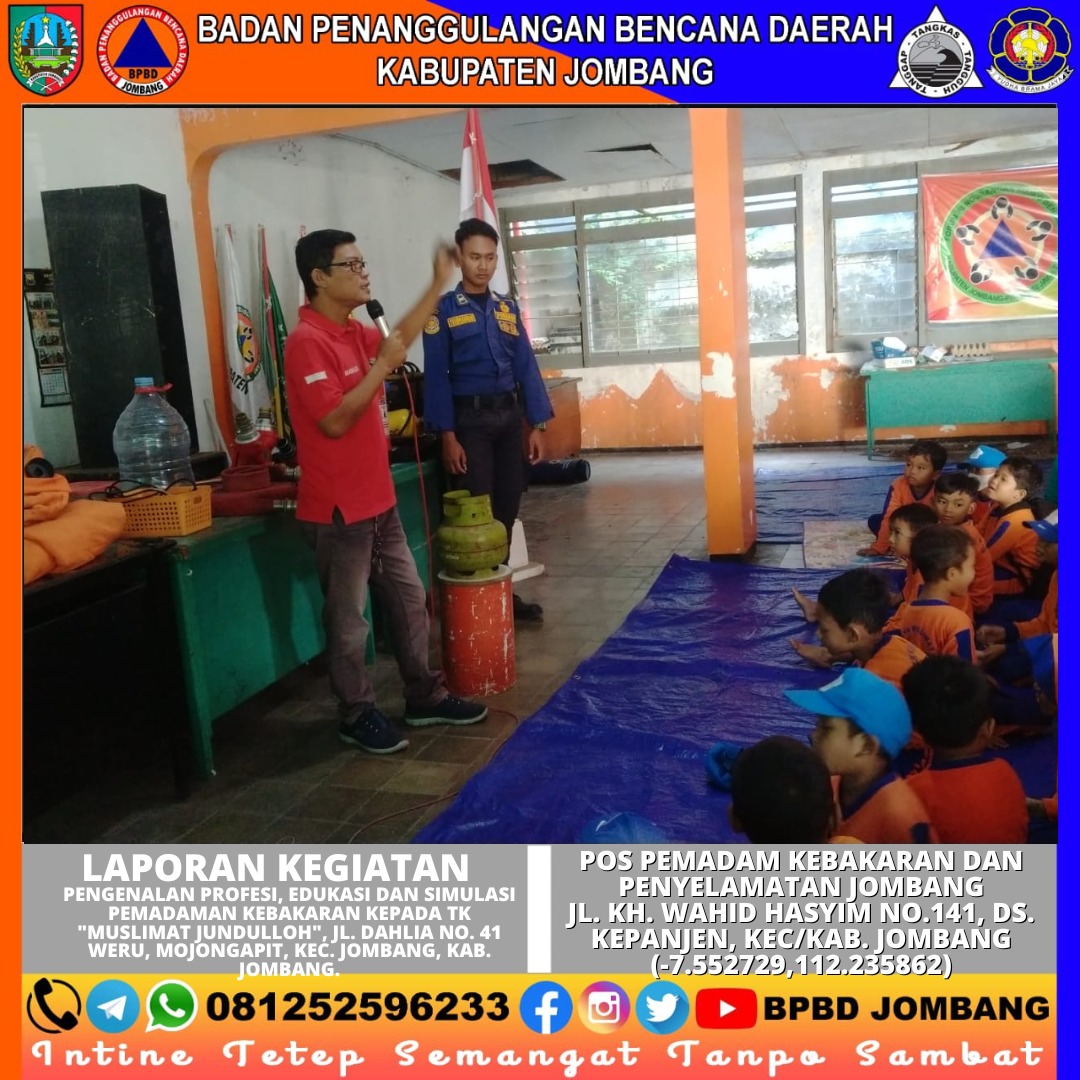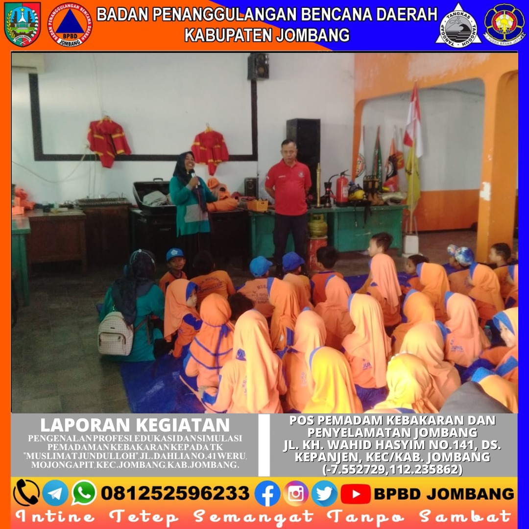 Pada Jumat, 31 Mei 2024, Pukul 07.30 - 09.00 WIB, TK "Muslimat Jundulloh", Jl. Dahlia No. 41 Dsn. Weru, Ds. Mojongapit. Mengikuti pengenalan profesi pemadam kebakaran yang dilakukan oleh Pemadam Kebakaran Jombang yang berlokasi di Jl. KH. Wahid Hasyim No.141, Ds. Kepanjen, Kec/kab. Jombang. (-7.552729,112.235862). Pengenalan ini dilaksanakan untuk memperkenalkan siswa TK Muslimat Jundulloh, Ds. Mojongapit dengan profesi pemadam kebakaran dan melengkapi ketahuannya tentang upaya penanggulangan kebakaran di sekitar mereka.