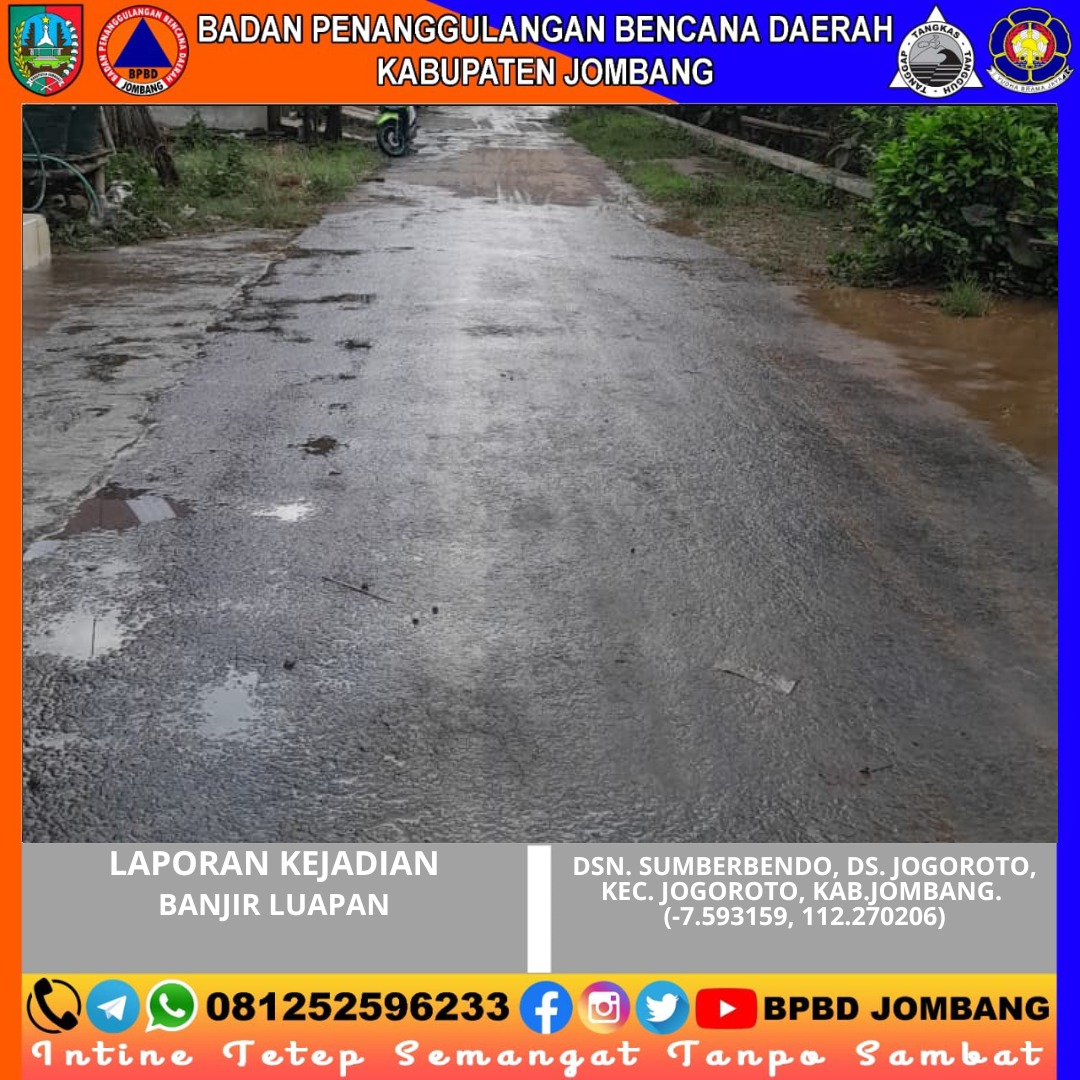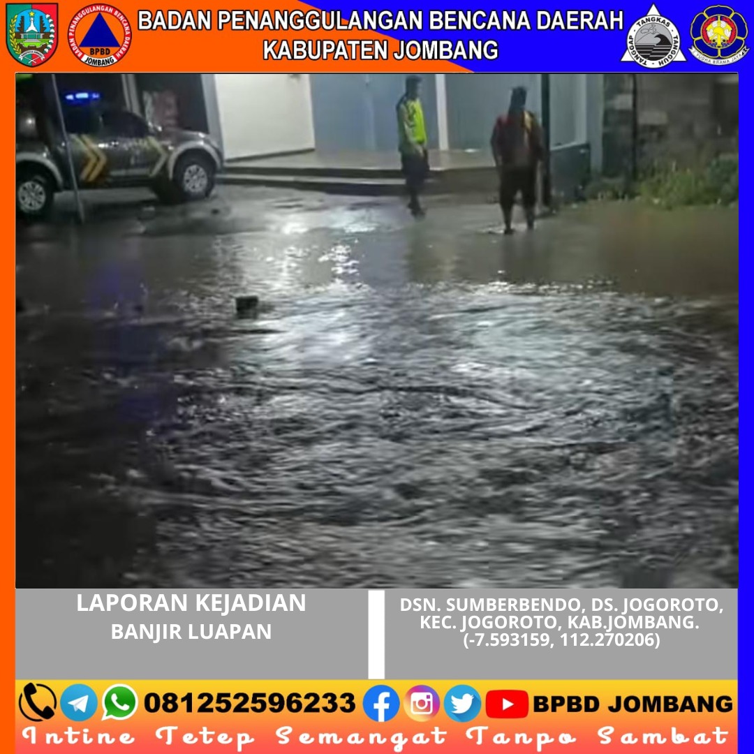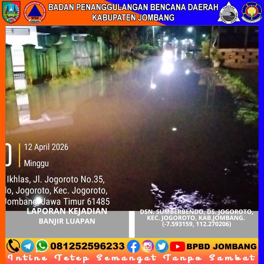 Curah hujan dengan intensitas sangat tinggi yang melanda wilayah Kabupaten Jombang mengakibatkan terjadinya banjir luapan di Dusun Sumberbendo, Desa Jogoroto, Kecamatan Jogoroto pada Minggu malam (12/4/2026) sekitar pukul 23.15 WIB. Meningkatnya debit air sungai secara signifikan menyebabkan air meluap dan menggenangi jalan desa serta pekarangan rumah warga.