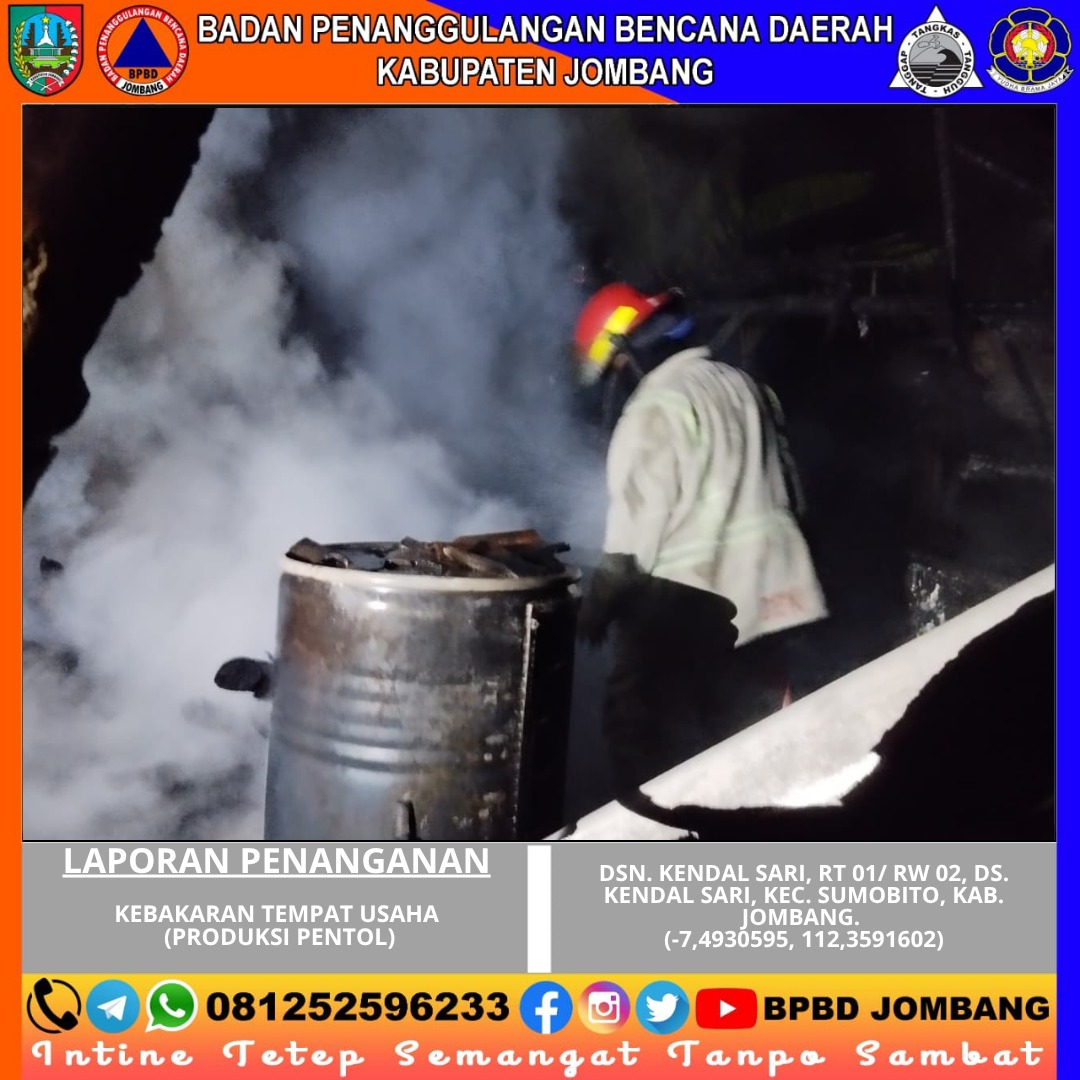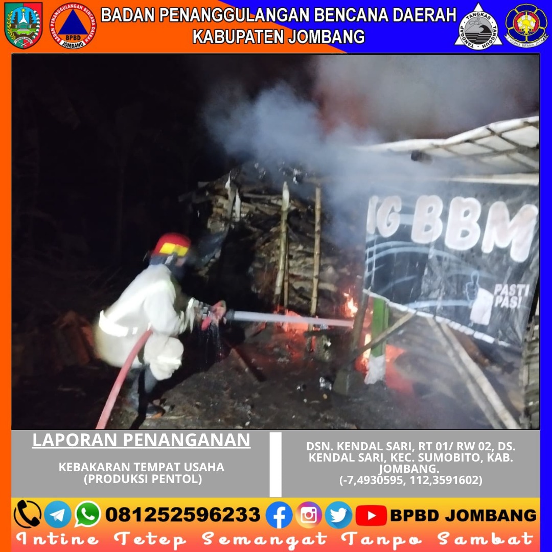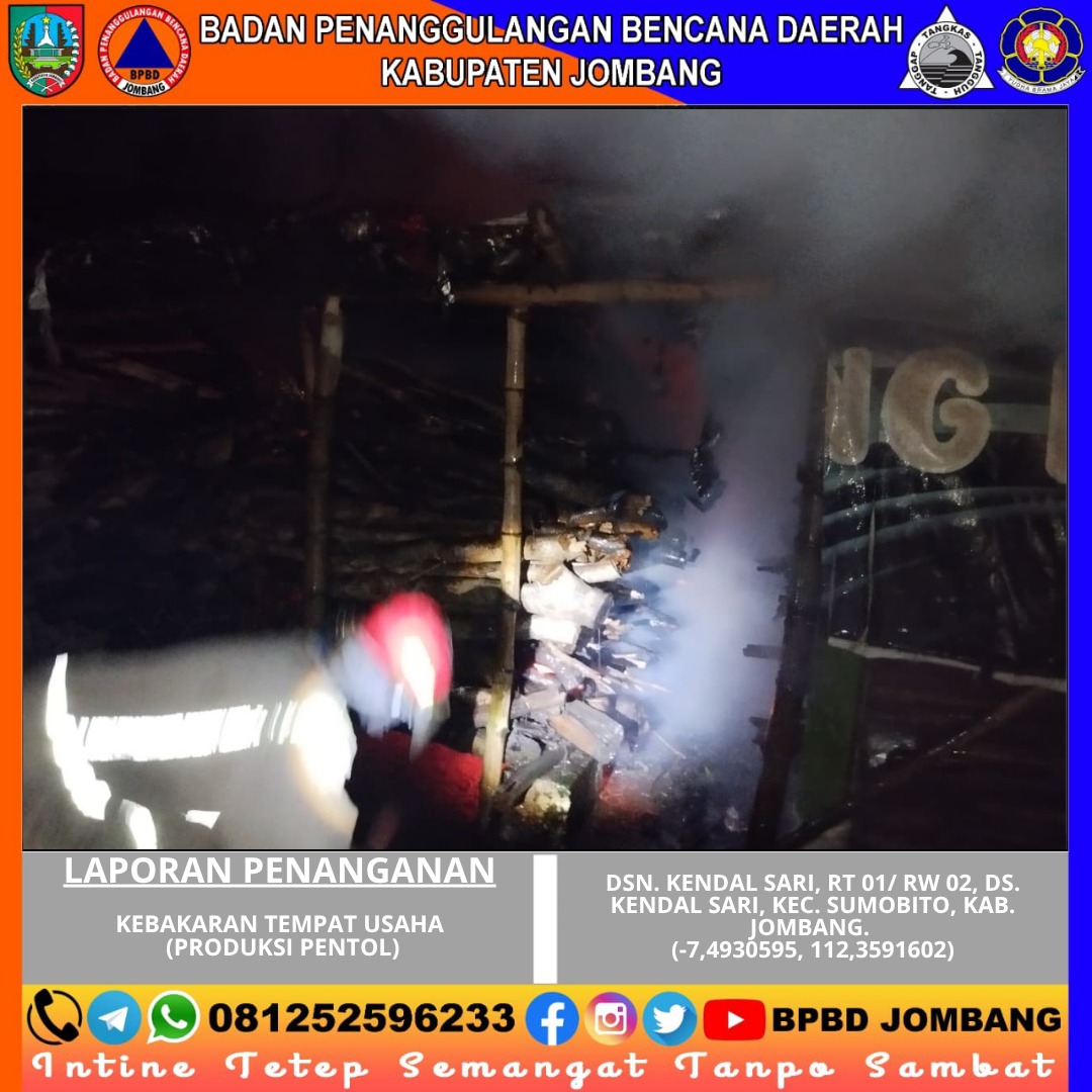 Kebakaran terjadi pada sebuah tempat usaha produksi pentol yang berada di Dusun Kendalsari, Desa Kendalsari, Kecamatan Sumobito, Kabupaten Jombang. Peristiwa yang terjadi pada dini hari ini mengejutkan warga sekitar dan sempat menimbulkan kepanikan karena api dengan cepat membesar di area gudang produksi.