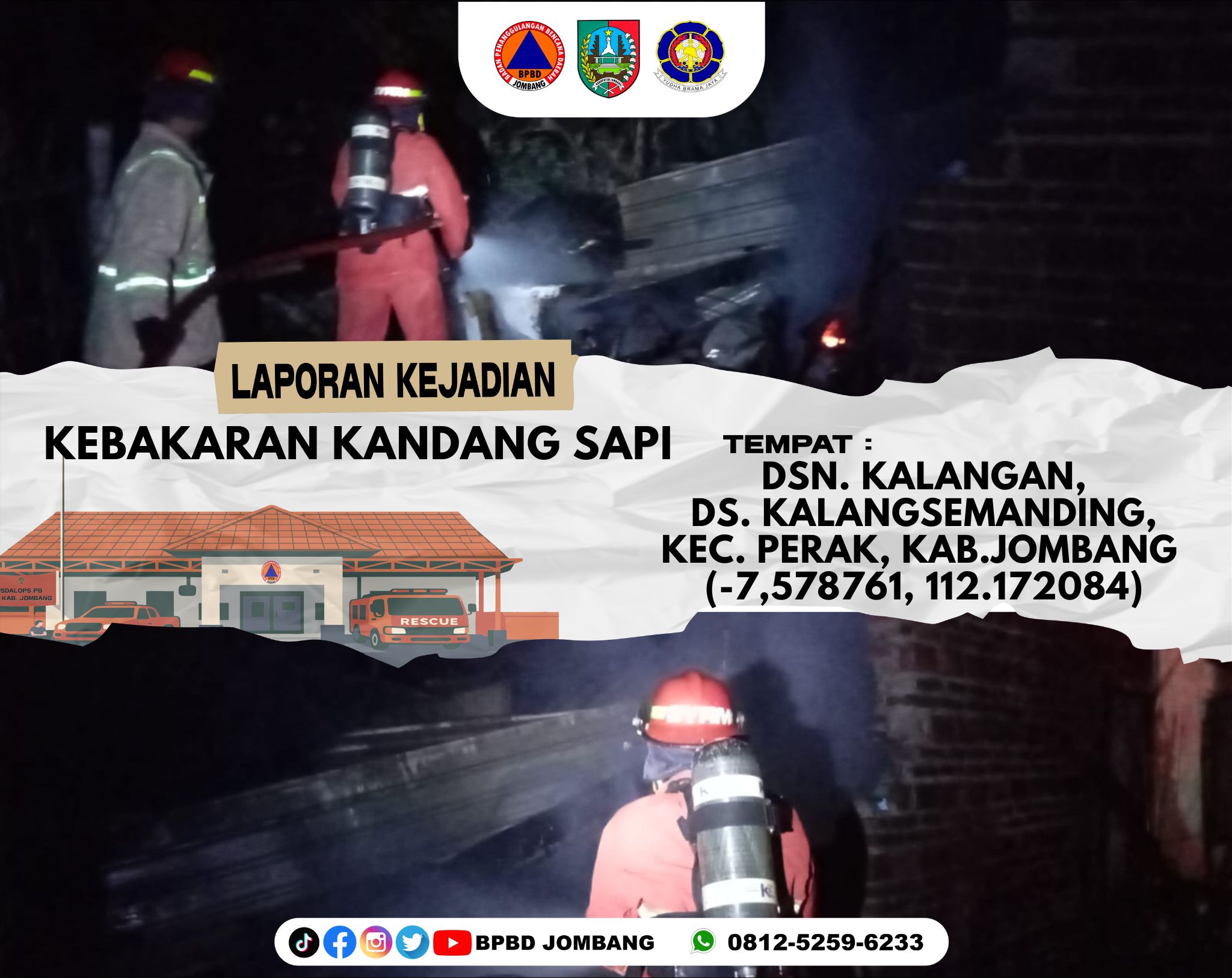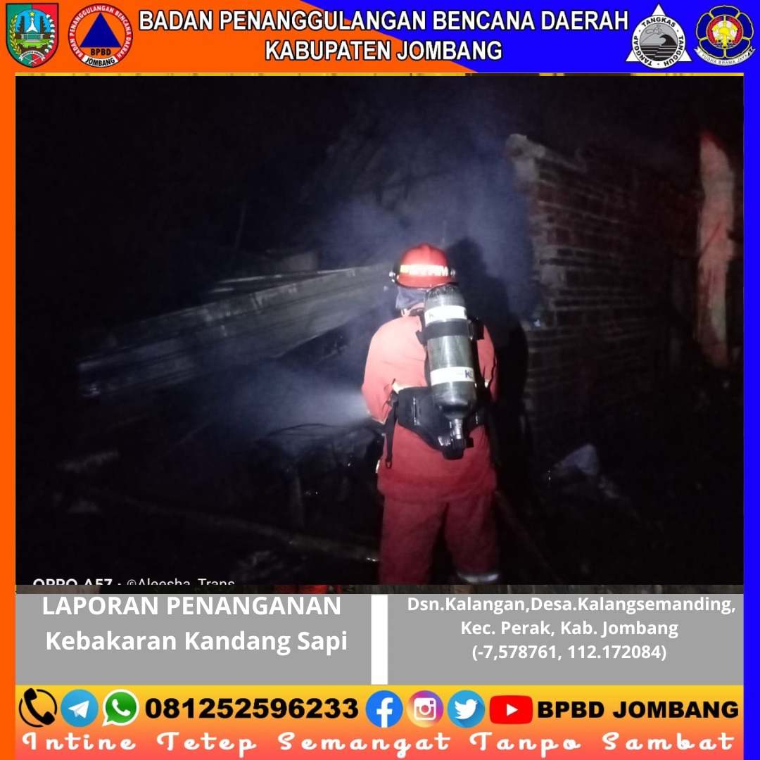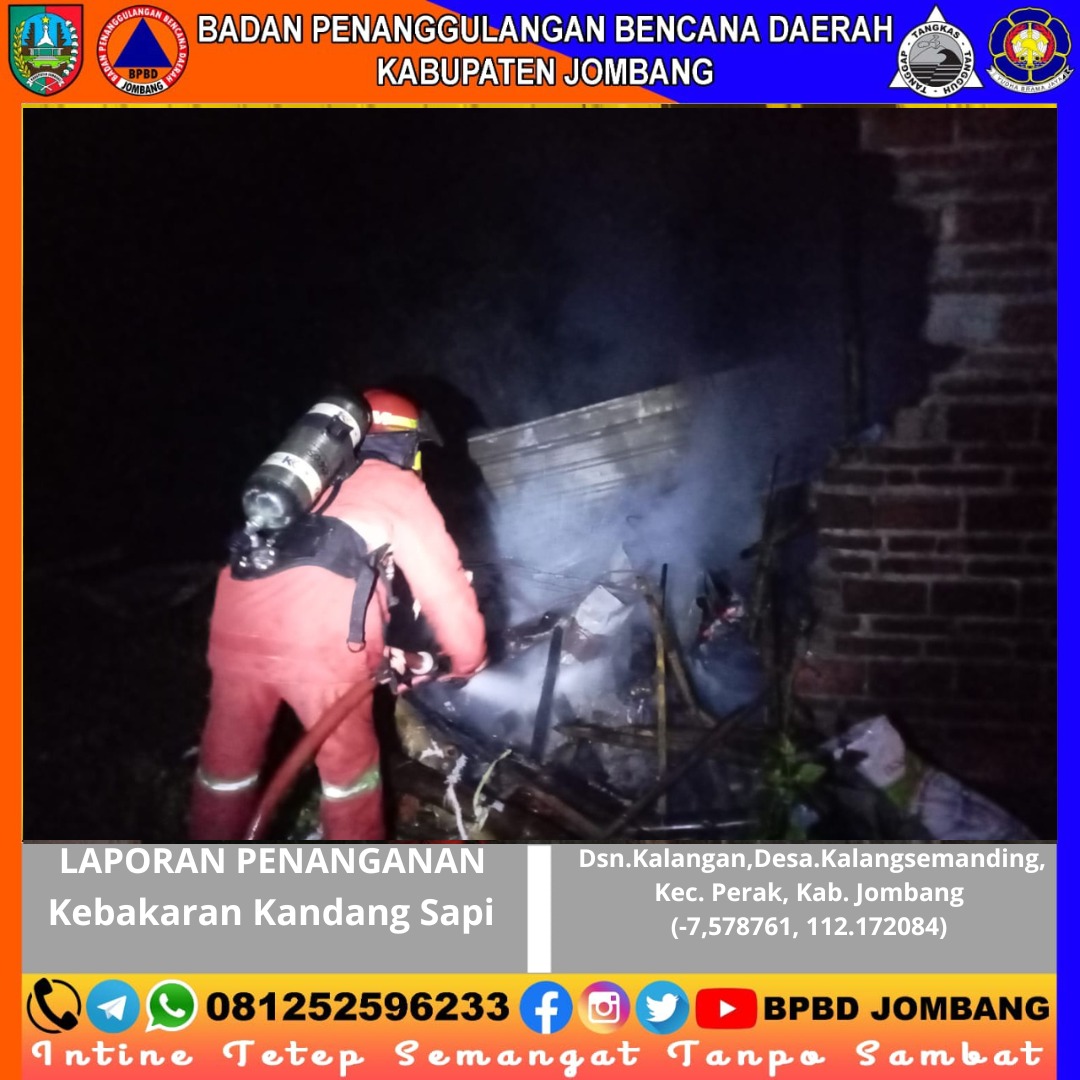 Peristiwa kebakaran kandang sapi terjadi pada Senin dini hari (27/04/2026) di Dusun Kalangan, Desa Kalangsemanding, Kecamatan Perak, Kabupaten Jombang. Kejadian bermula sekitar pukul 01.30 WIB saat warga melihat kepulan asap yang disusul kobaran api dari kandang milik salah satu warga. Upaya pemadaman secara mandiri sempat dilakukan, namun api terus membesar dan sulit dikendalikan.