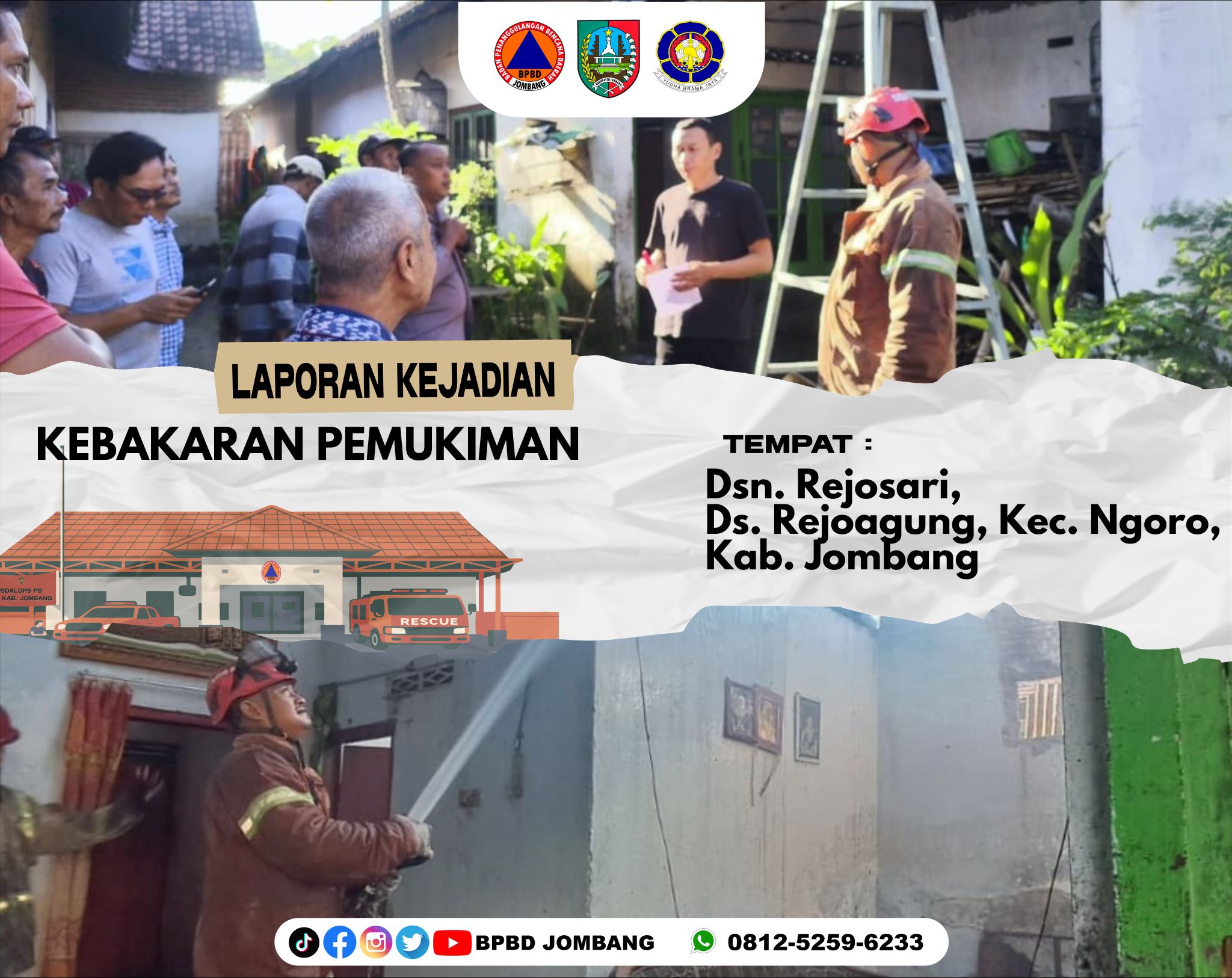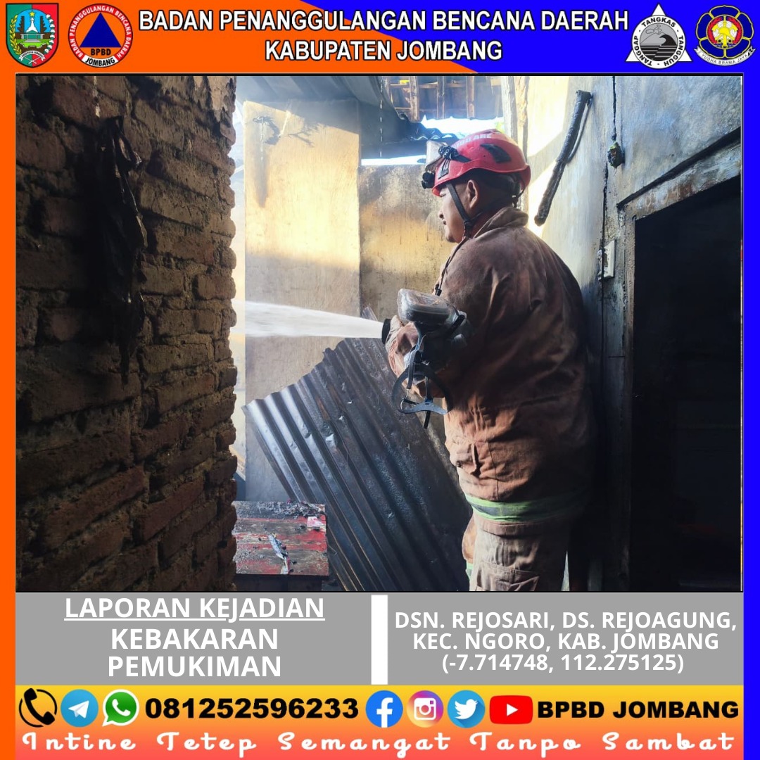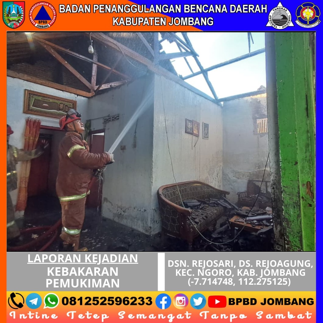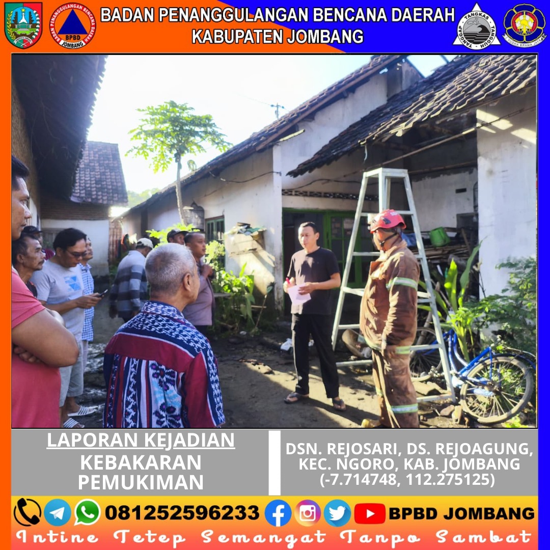 Kebakaran pemukiman terjadi di Dusun Rejosari, Desa Rejoagung, Kecamatan Ngoro, Kabupaten Jombang pada Jumat, 13 Maret 2026. Peristiwa tersebut mengakibatkan sebagian bangunan rumah milik seorang warga bernama Ibu Mutiah mengalami kerusakan akibat terbakar. Area bangunan yang terdampak meliputi ruang dapur, kamar tidur, dan ruang tamu dengan total luas kurang lebih 72 meter persegi.