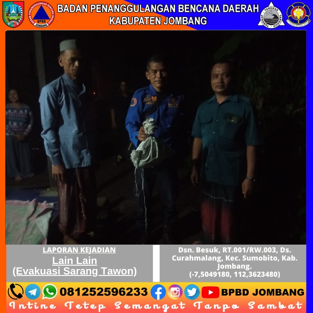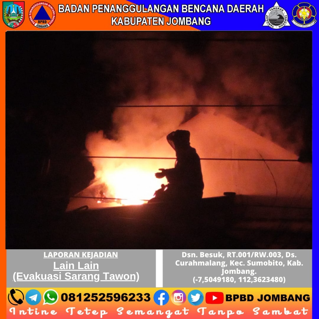 Pemadam kebakaran Kabupaten Jombang melakukan penanganan evakuasi sarang tawon di 2 tempat yakni Dsn. Tegalan, RT.001/RW.003, Ds. Curahmalang, Kec. Sumobito, Kab. Jombang (-7,5127130, 112,3698270) dan Dsn. Besuk, RT.001/RW.003, Ds. Curahmalang, Kec. Sumobito, Kab. Jombang. (-7,5049180, 112,3623480)