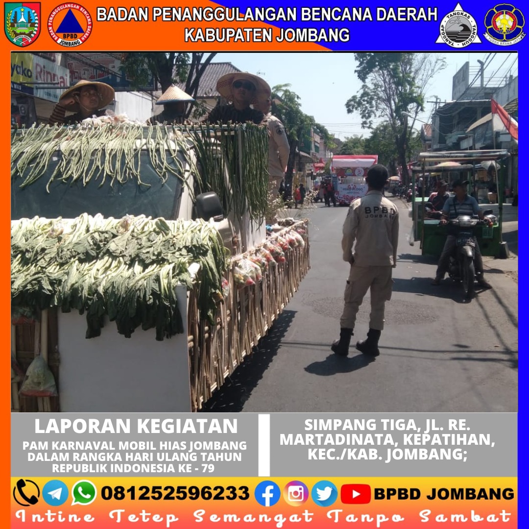 Sabtu, 31 Agustus 2024 Personil Pusdalops BPBD Kabupaten Jombang melakukan PAM Karnaval dalam rangka HUT Republik Indonesia ke-79. Tidak hanya melakukan PAM saja, beberapa personil Pusdalops BPBD juga turut andil dalam memeriahkan kegiatan tersebut dengan cara membagikan sayuran dan berkolaborasi dengan dinas lain.