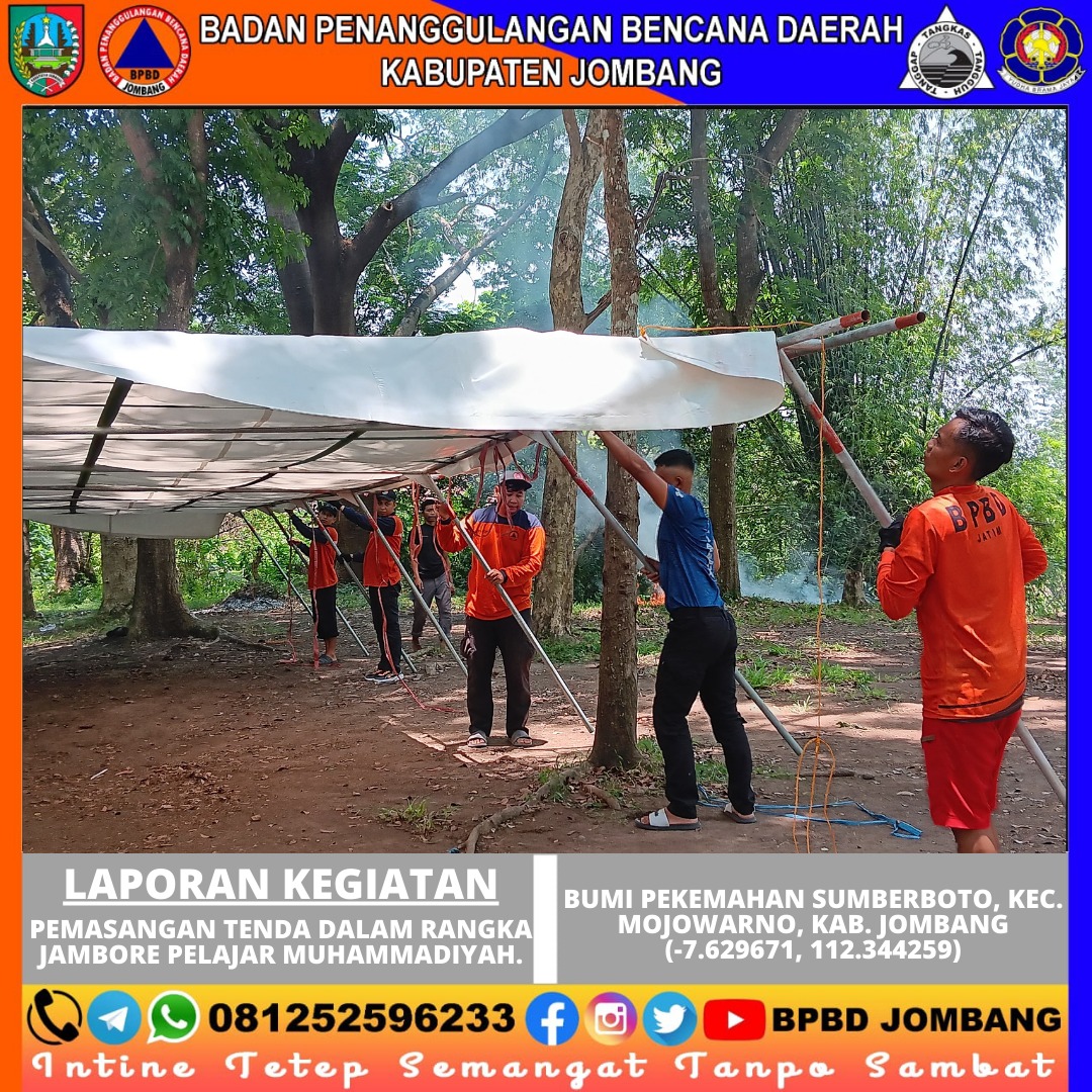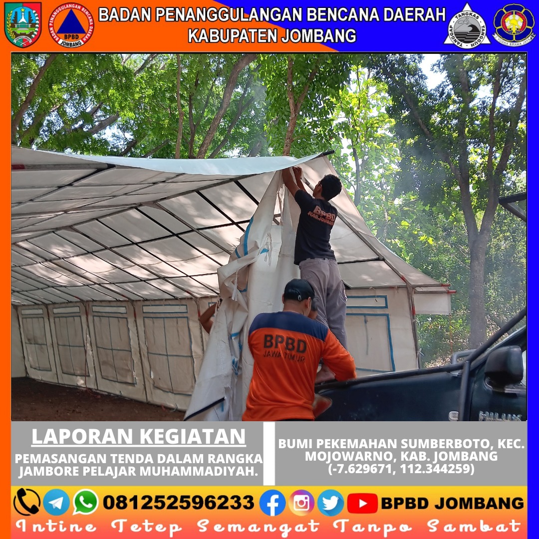 Jombang, 17 Oktober 2024 – Dalam rangka menyambut kegiatan Jambore Pelajar Muhammadiyah, tim Pusdalops BPBD Kabupaten Jombang melaksanakan pemasangan tenda pada hari Kamis, 17 Oktober 2024, dari pukul 08.00 hingga 14.00 WIB. Kegiatan ini dilaksanakan di Bumi Perkemahan Lembah Giri, Desa Wonosalam, Kecamatan Wonosalam.