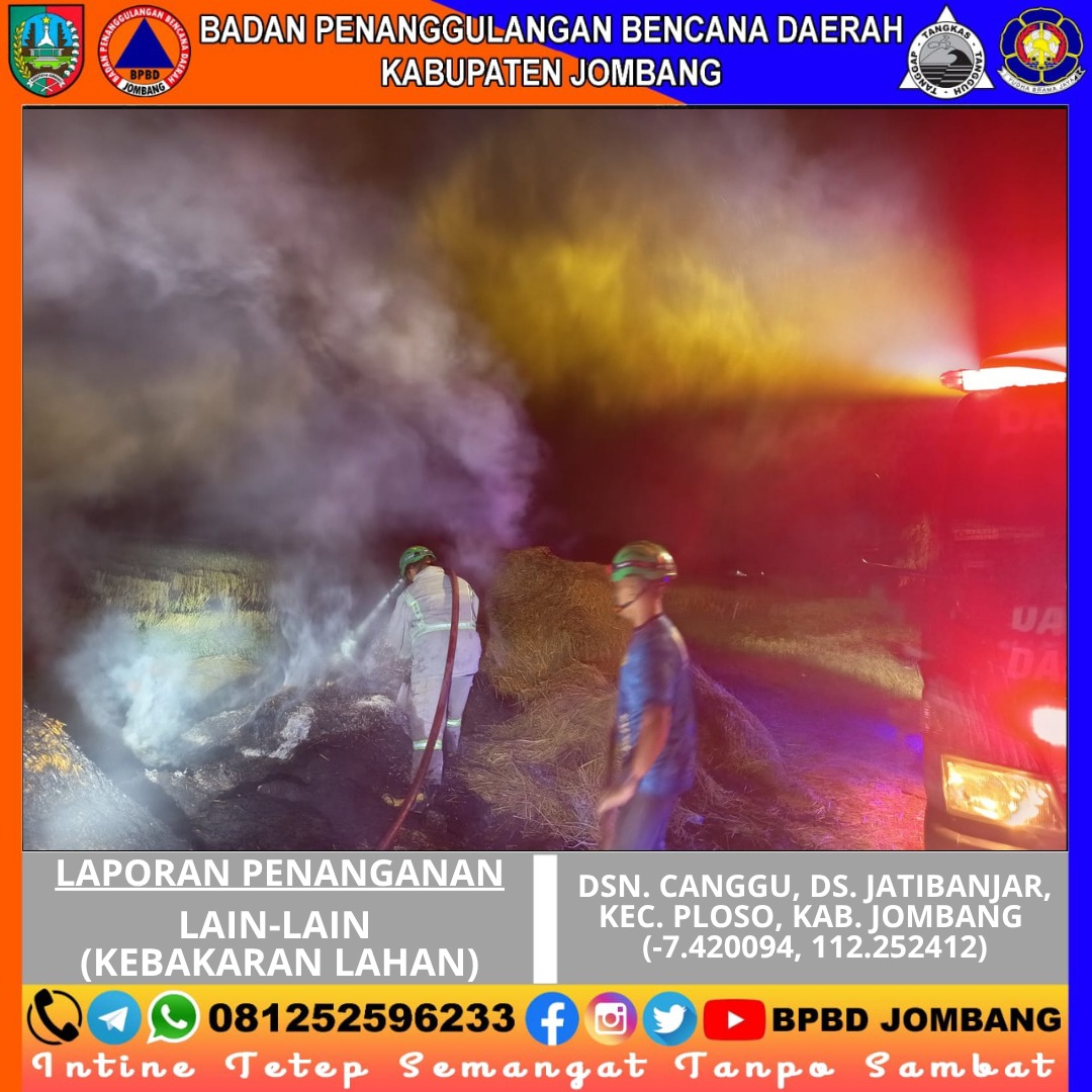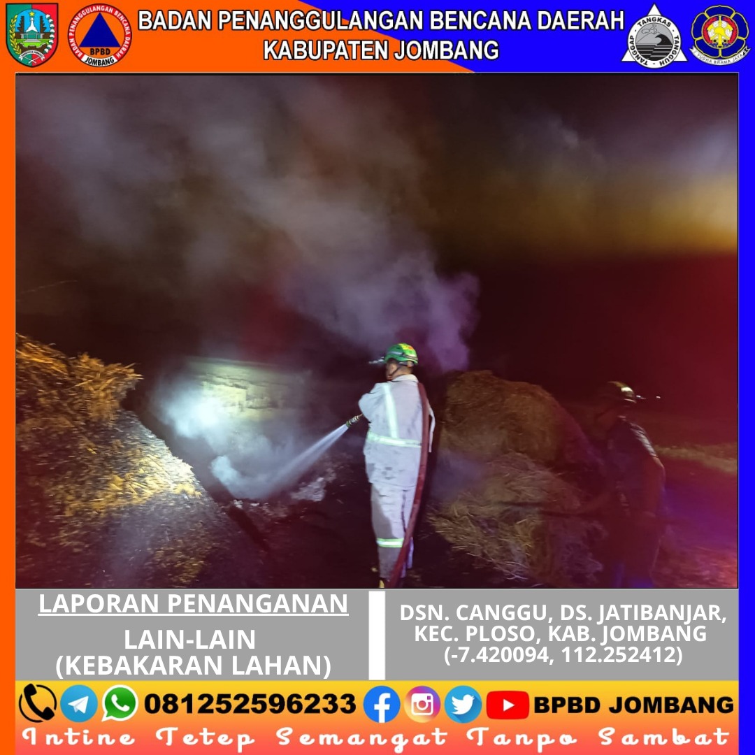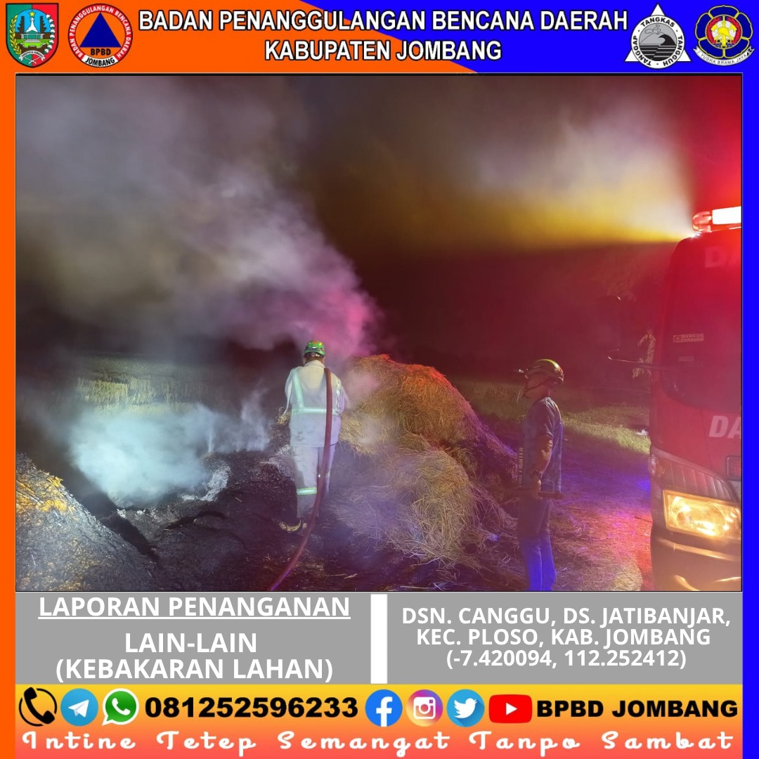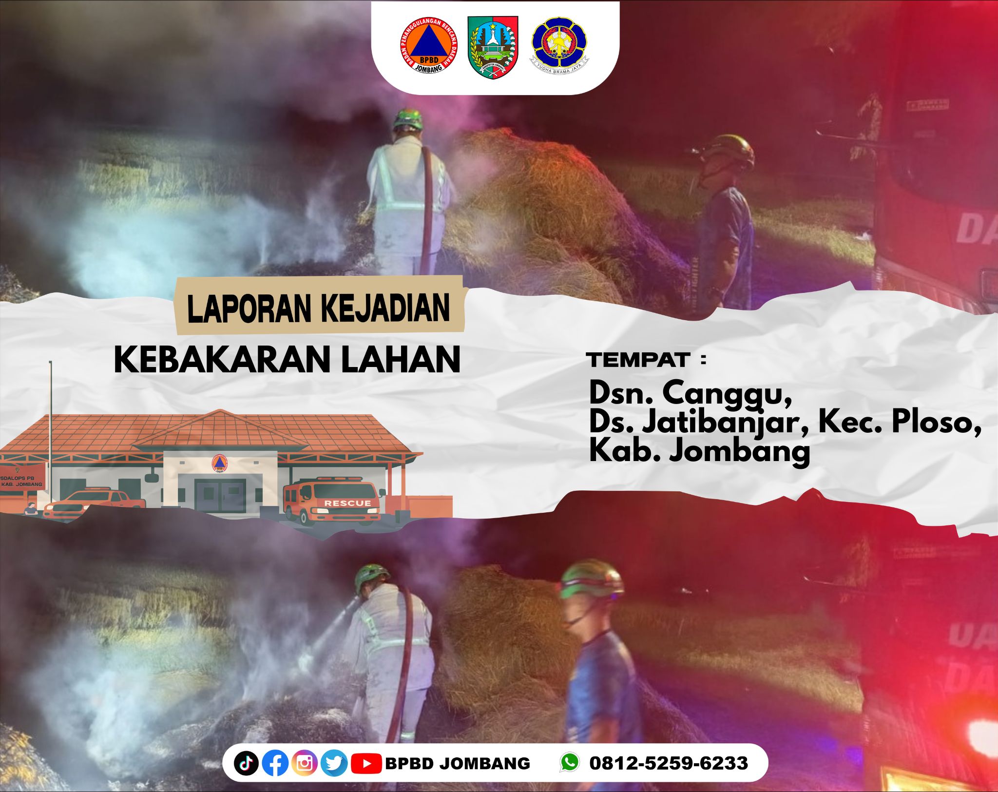 Peristiwa kebakaran lahan terjadi di Dusun Canggu, Desa Jatibanjar, Kecamatan Ploso, Kabupaten Jombang pada Jumat, 20 Maret 2026. Kebakaran ini dipicu oleh aktivitas pembakaran jerami sisa panen yang kemudian tidak terkendali akibat tiupan angin kencang, sehingga menimbulkan asap tebal yang berdampak hingga ke permukiman warga.