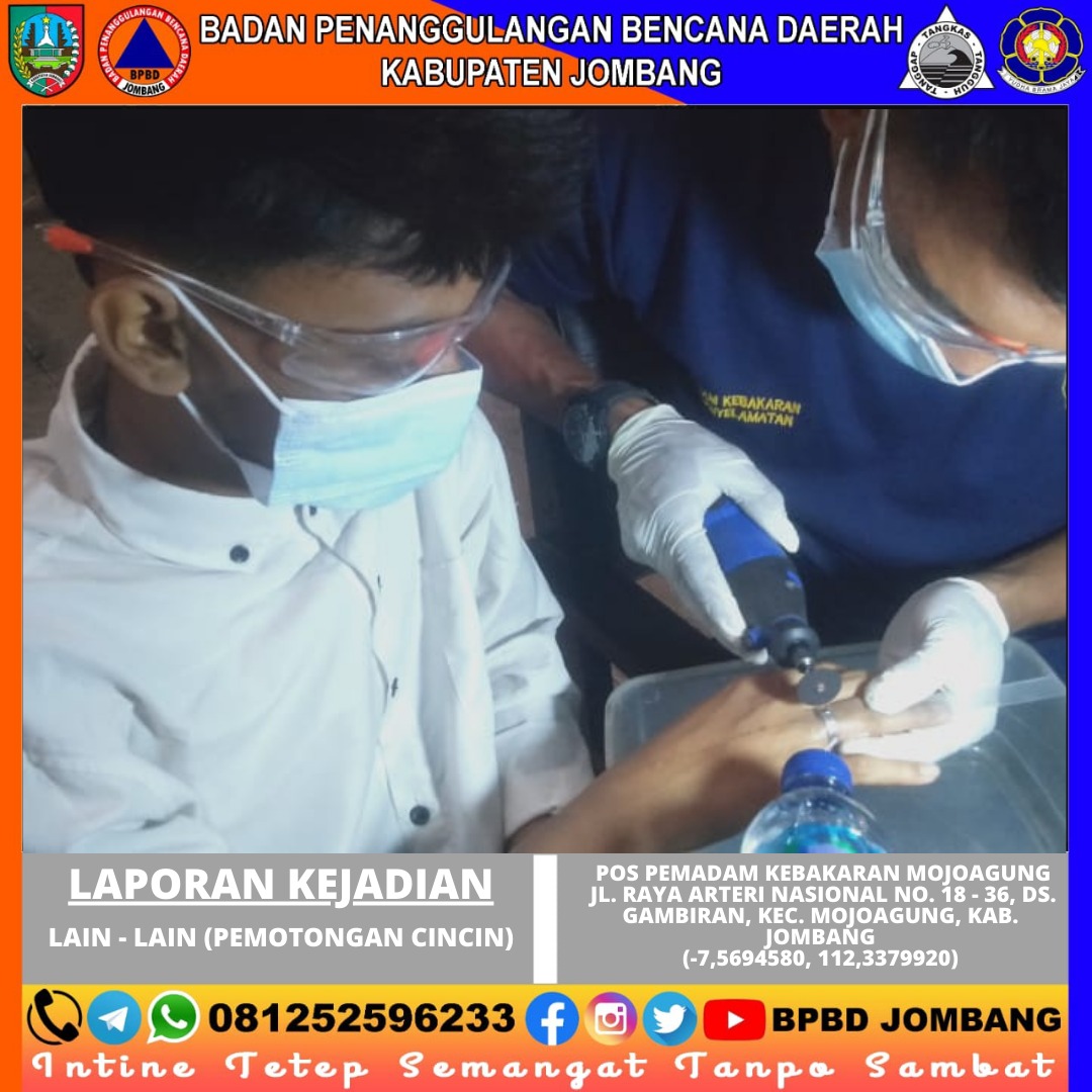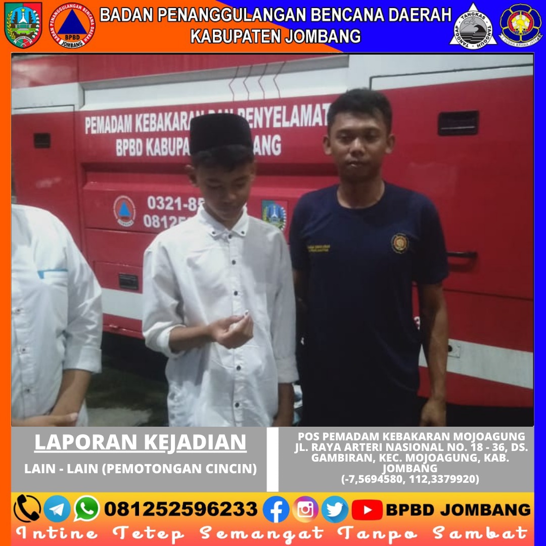 Jombang, 17 Oktober 2024 – Pada Kamis malam, tanggal 17 Oktober 2024, sekitar pukul 20.54 WIB, Pos Pemadam Kebakaran Mojoagung menerima laporan mengenai seorang remaja yang mengalami kesulitan untuk melepaskan cincin yang terpasang di jarinya. Kejadian ini berlangsung di Jl. Raya Arteri Nasional No. 18 - 36, Desa Gambiran, Kecamatan Mojoagung, Kabupaten Jombang.