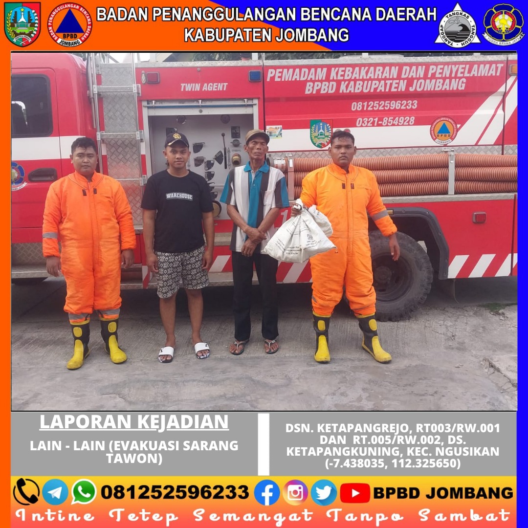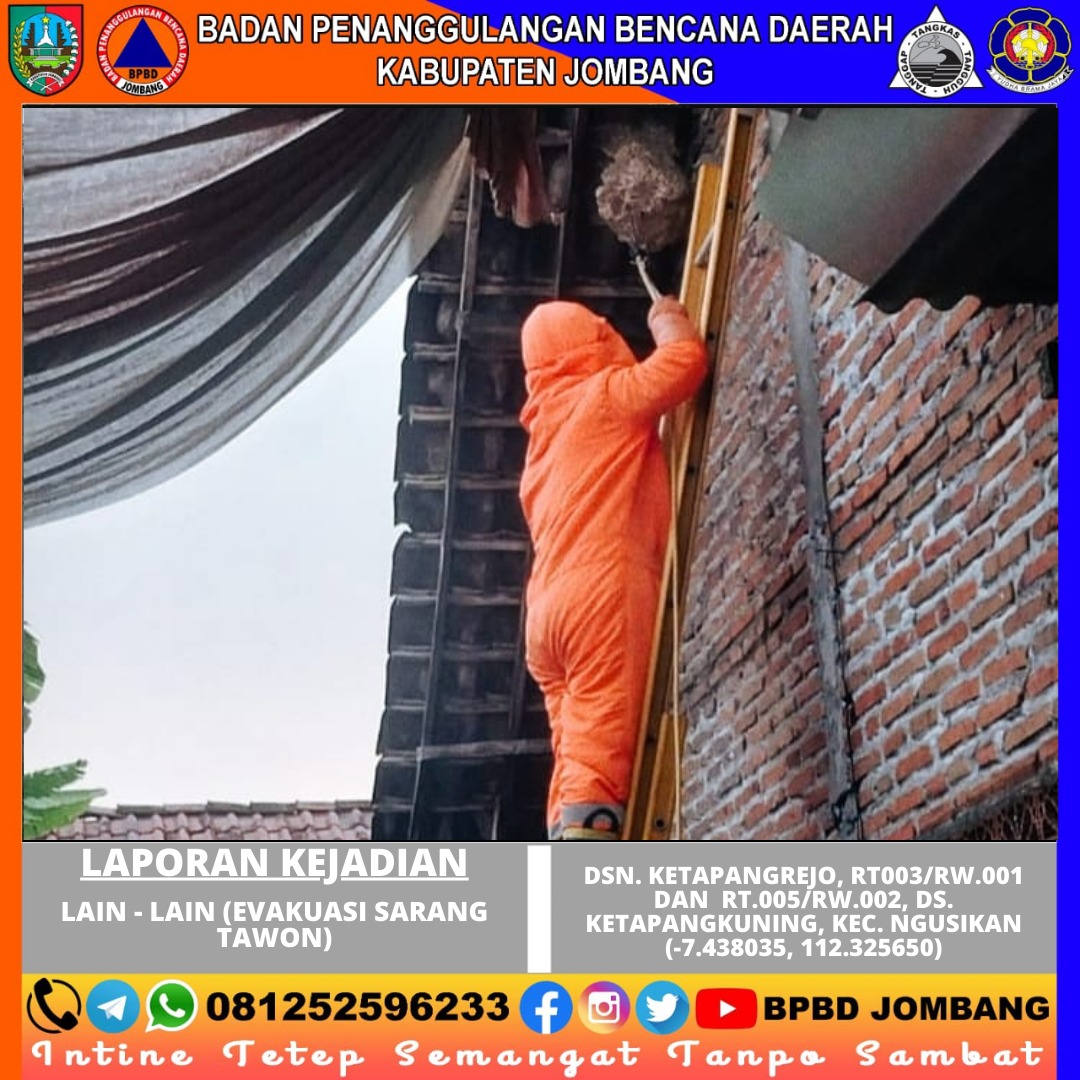 Pukul 08.40 Wib Pos Damkar menerima laporan tersebut dan meneruskan ke pimpinan yang bertugas. Setelah mendapatkan arahan, Pemadam Kebakaran Kabupaten Jombang memberangkatkan personilnya di Dsn. Ketapangrejo, RT003/RW.001 dan RT.005/RW.002, Ds. Ketapangkuning, Kec. Ngusikan, Kab. Jombang; (-7.438035, 112.325650) untuk melakukan Pengambilan dan Penanganan sarang tawon.