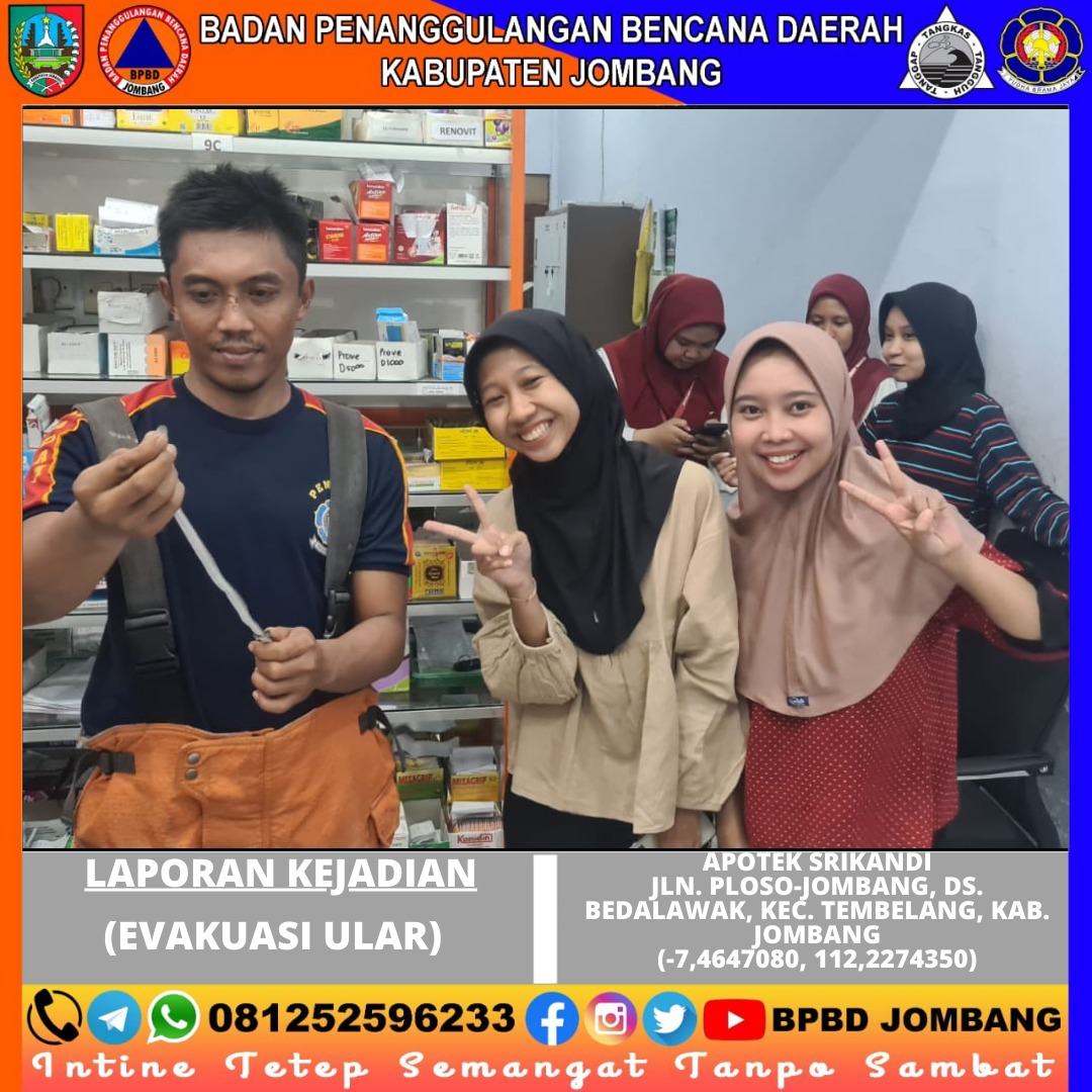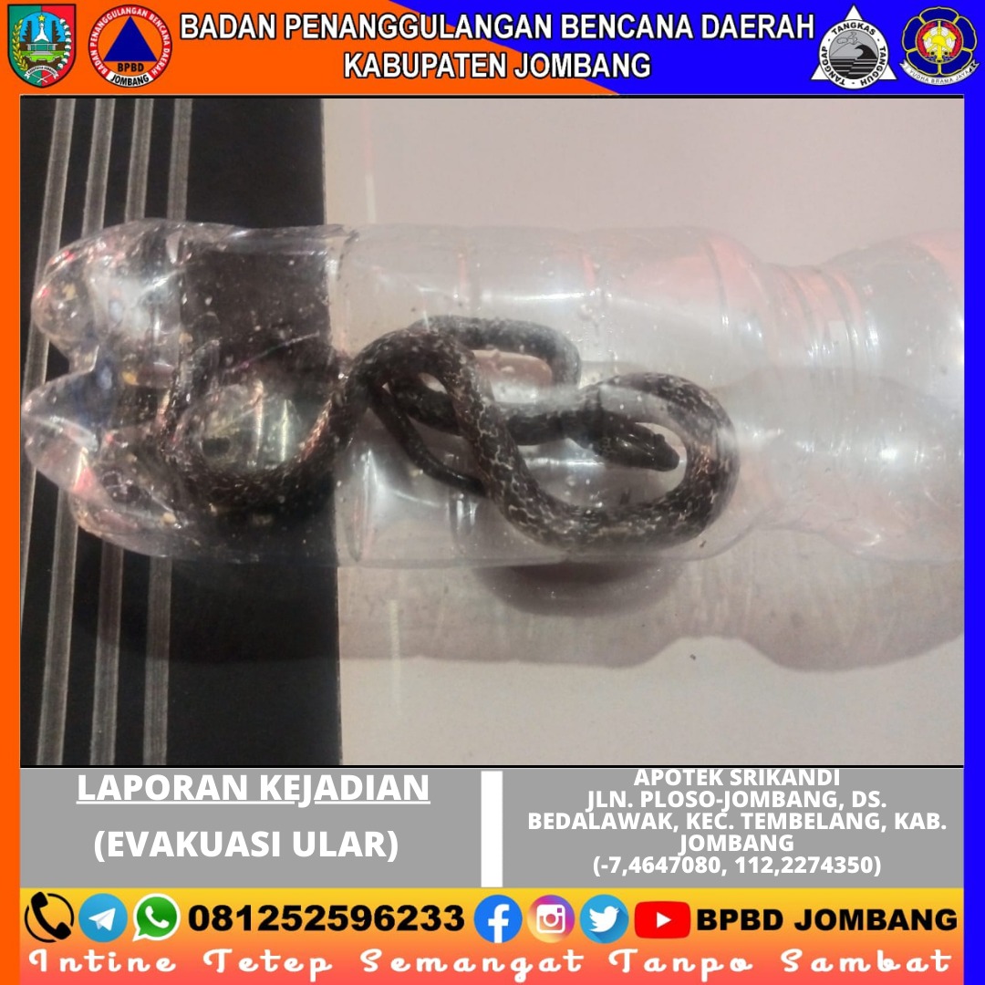 Senin, 30 September 2024, Terdapat laporan masuk kepada tim Pemadam Kebakaran Kabupaten Jombang tentang adanya seekor ular yang bersembunyi di almari obat Apotek Srikandi, di khawatirkan bisa membahayakan, akhirnya warga tersebut melaporkan kejadian ini ke Pemadam Kebakaran Kabupaten Jombang.