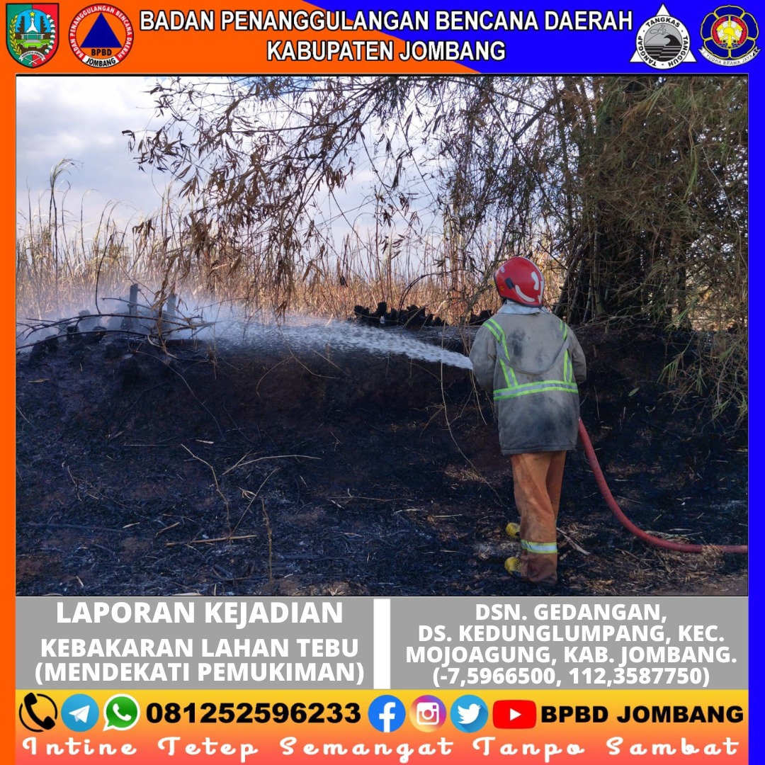 Tim Pemadam Kebakaran Kabupaten Jombang melakukan Penanganan dan Pembasahan Kebakaran Lahan Tebu yang mendekati pemukiman.