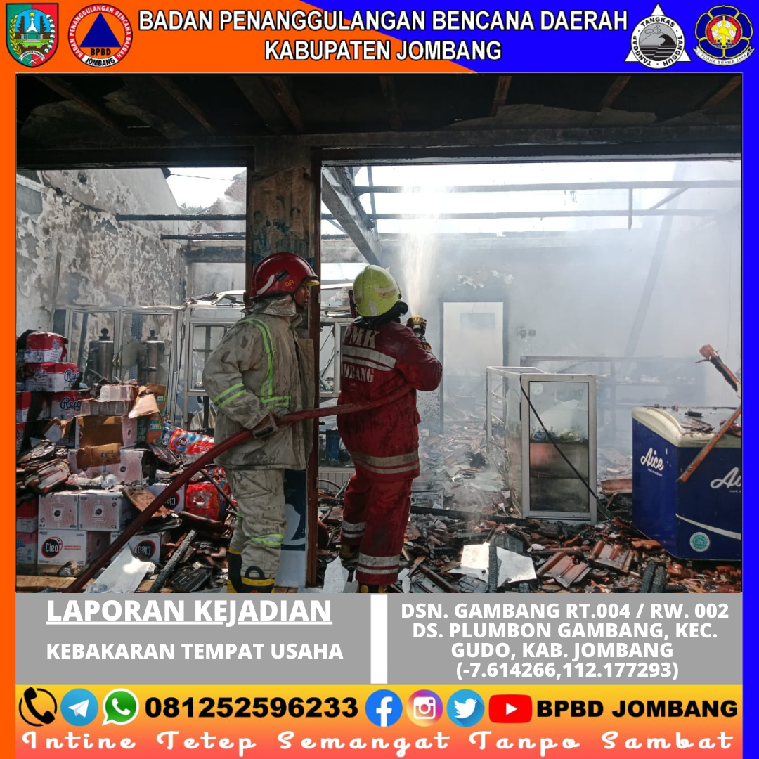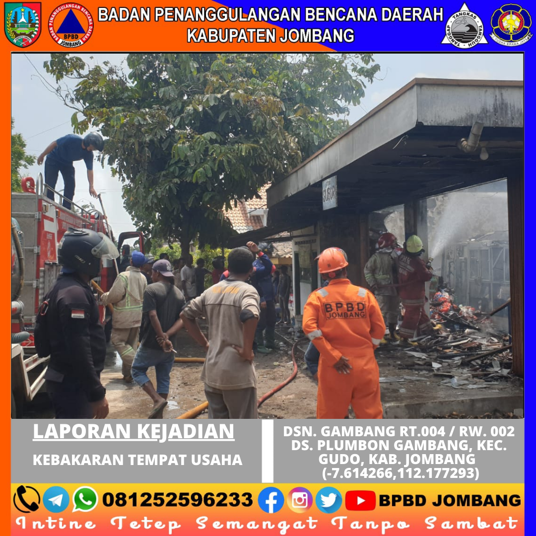 Tim Pemadam Kebakaran Kabupaten Jombang melakukan Penanganan dan Pembasahan Kebakaran Tempat Usaha milik warga.