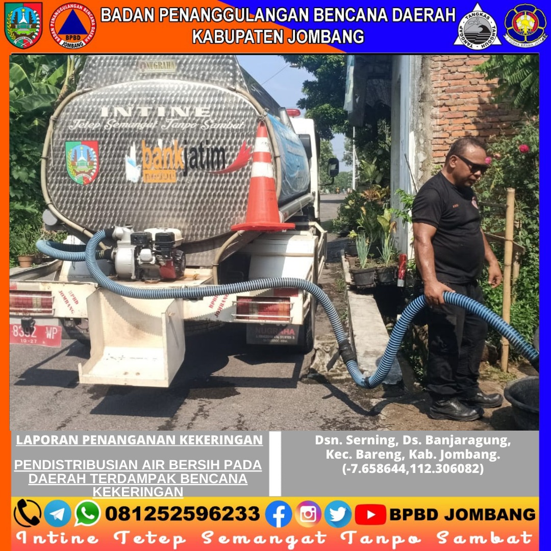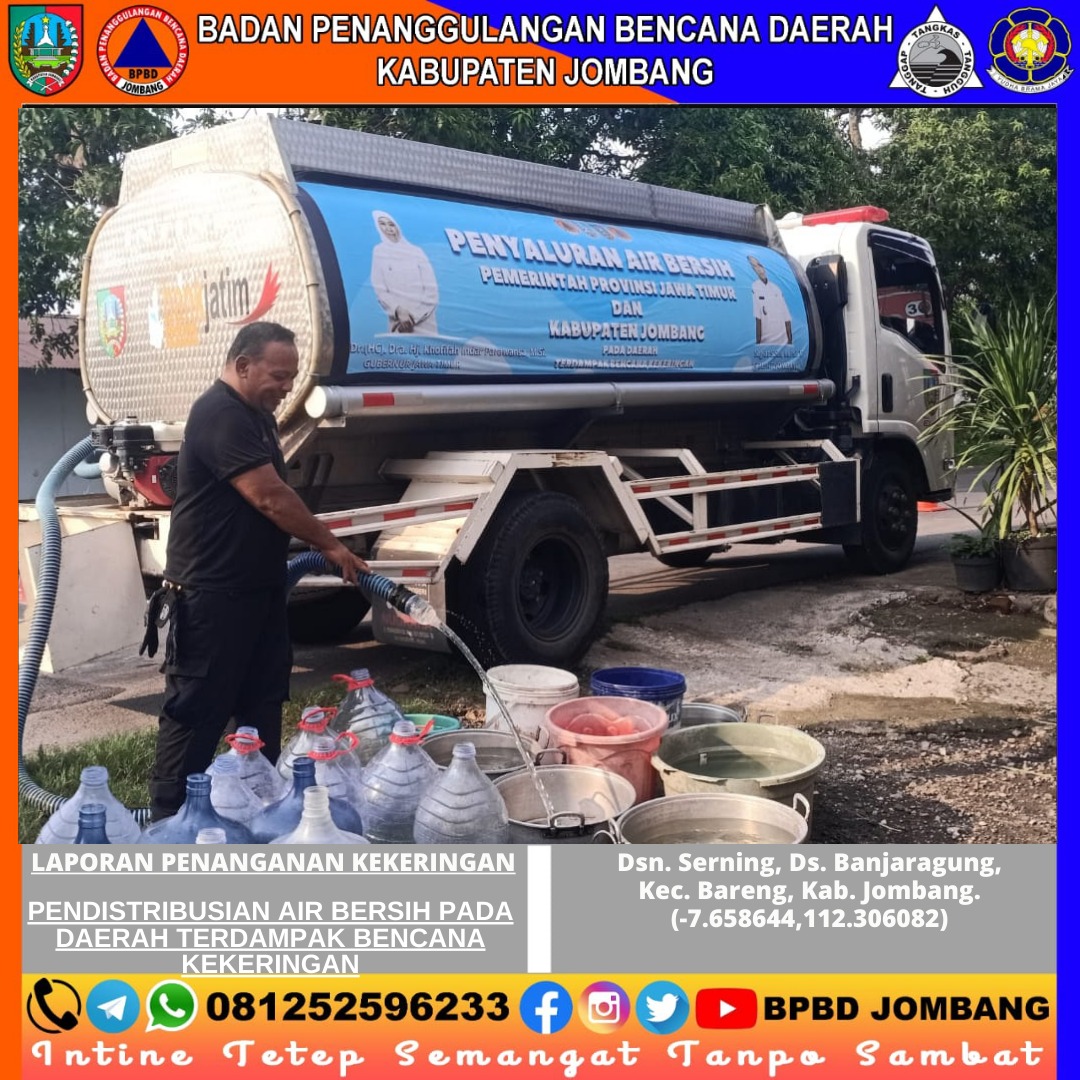 PusdalOps BPBD Kabupaten Jombang melakukan pendistribusian air bersih untuk masyarakat terdampak kekeringan di Dsn. Serning, Ds. Banjaragung, Kec. Bareng, Kab. Jombang. Pendistribusian air bersih ini dilaksanakan pada Jum’at, 29 Desember 2023, Pukul 08.00 – 13.50 WIB.