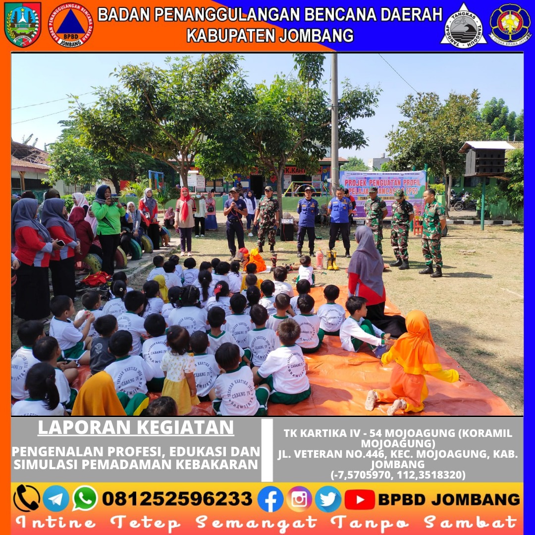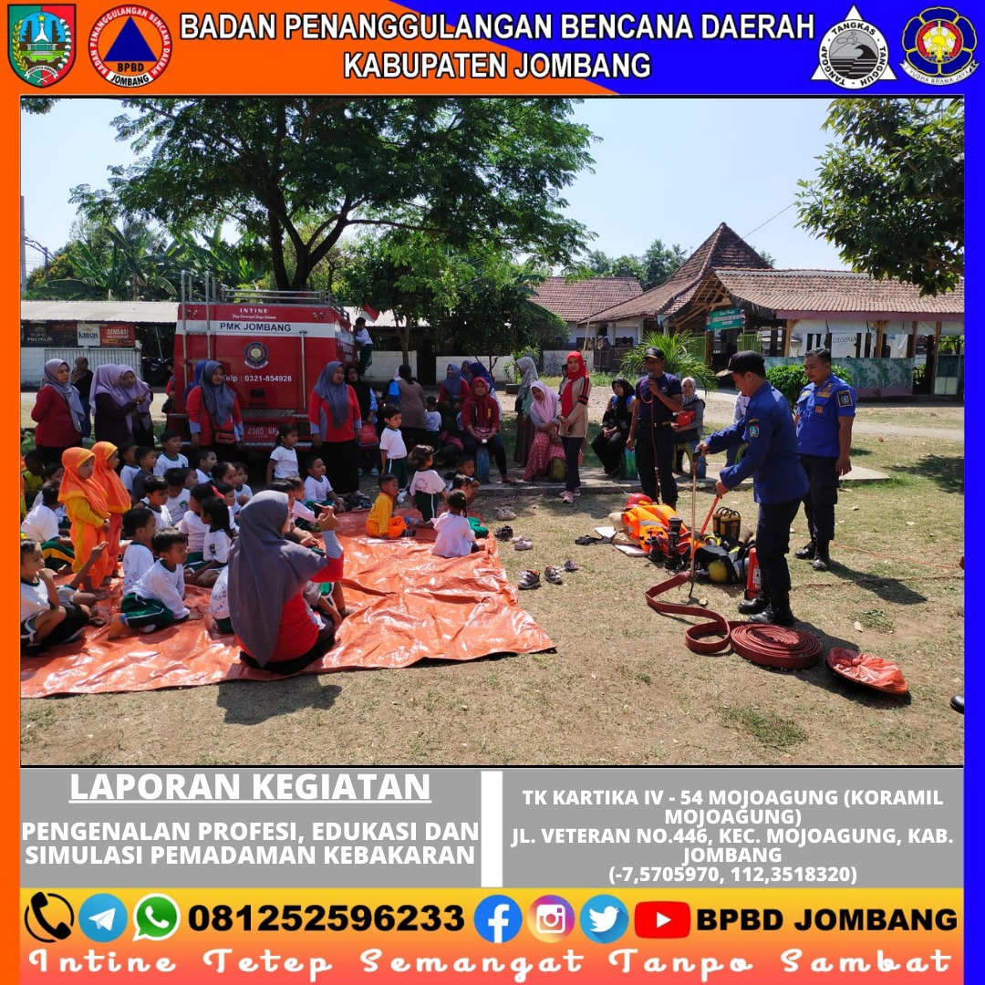 Jombang, Kamis 10 Oktober 2024, kegiatan Pengenalan Profesi, Edukasi dan Simulasi Pemadaman Kebakaran dilaksanakan di Jl. Veteran No.446, Kecamatan Mojoagung, Kabupaten Jombang. Kegiatan ini diadakan mulai pukul 08.30 hingga 10.30 WIB dan diikuti oleh siswa-siswi TK Kartika, KB Harapan Bangsa, dan KB Mutiara Bunda.