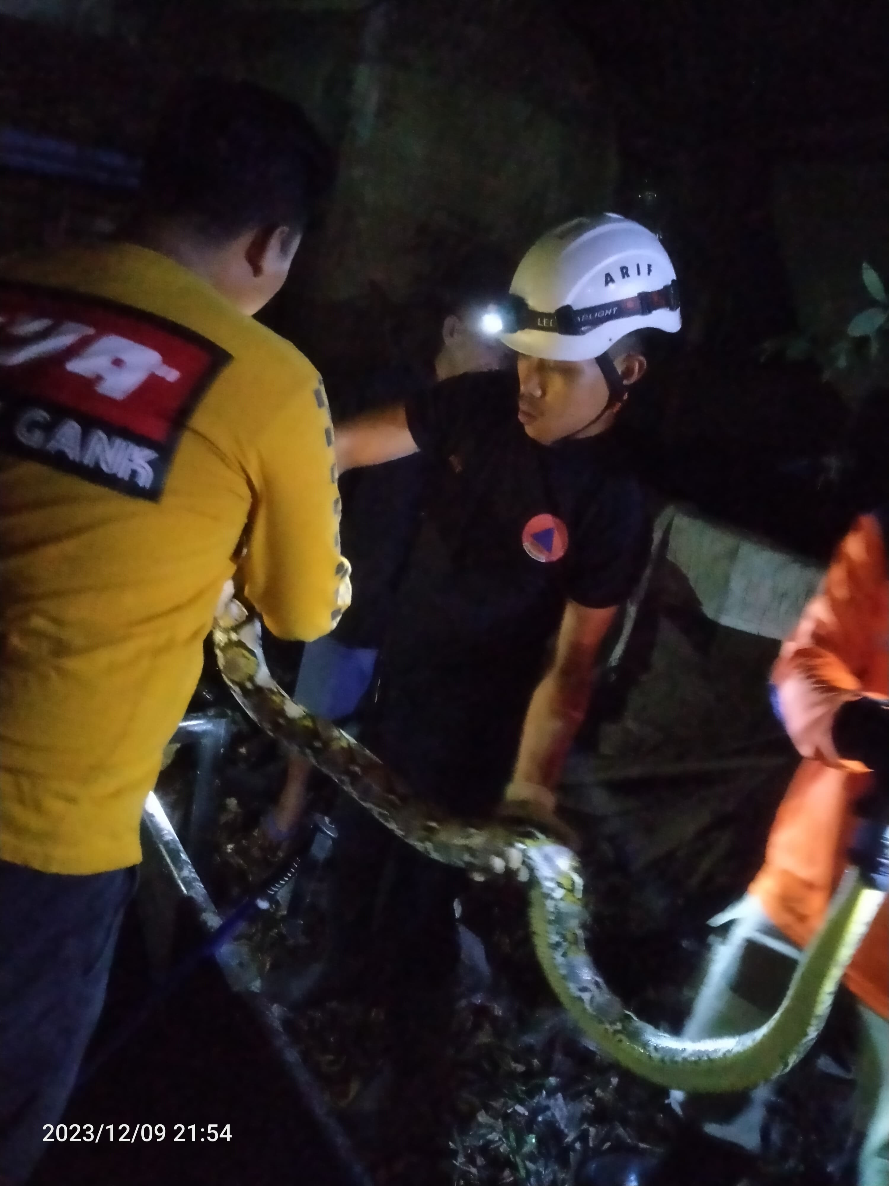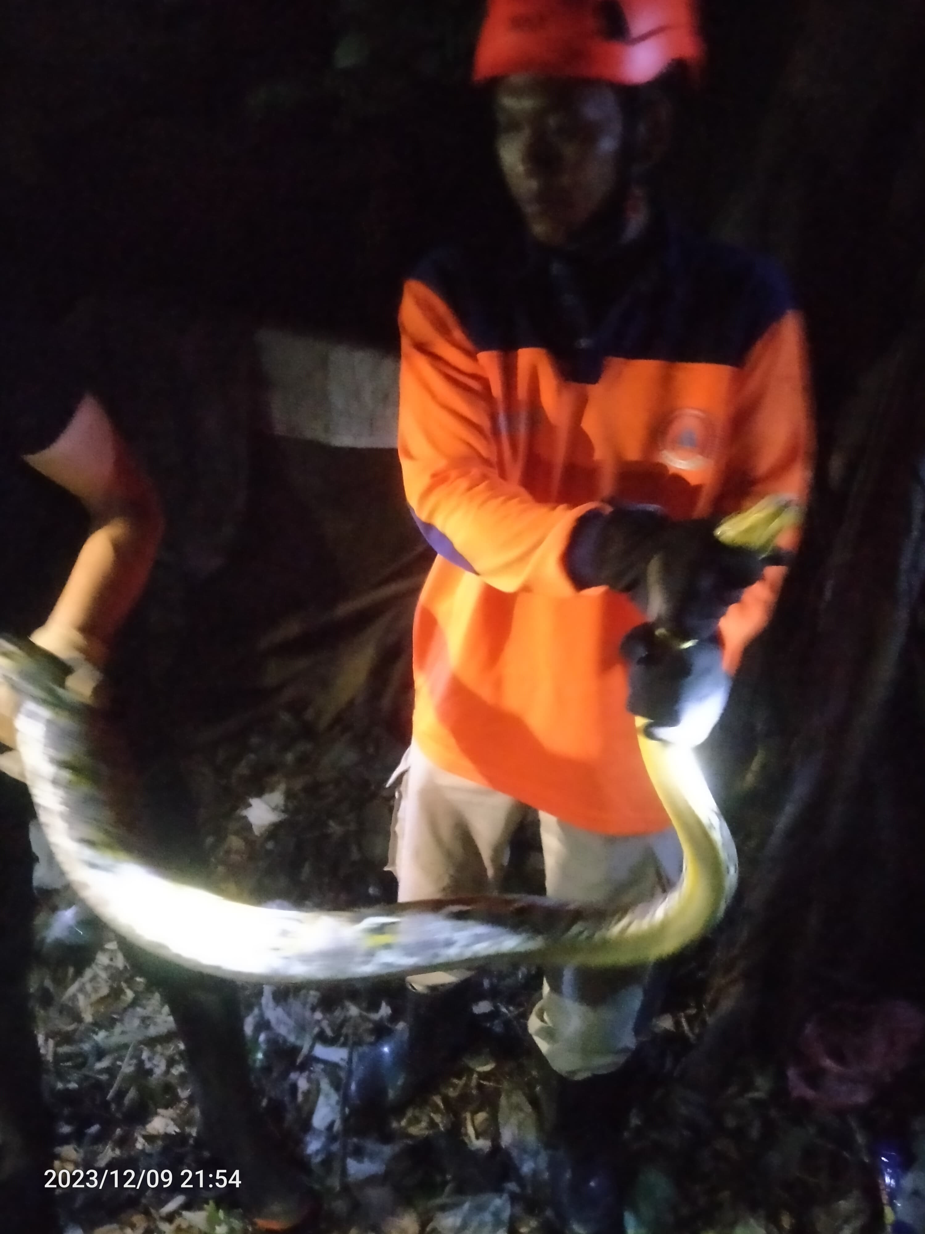 PusdalOps BPBD Kabupaten Jombang melakukan evakuasi ular di Jalan Panglima Sudirman, Tunggorono, Denanyar, Kecamatan Tunggorono, Kabupaten Jombang (-7.546906, 112.214110) pada Sabtu, 09 Desember 2023, jam 22.18 - 23.10 WIB.