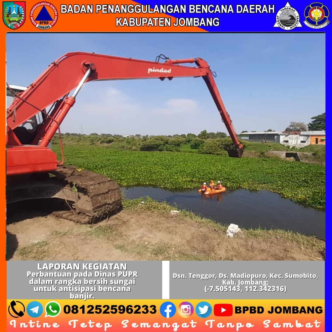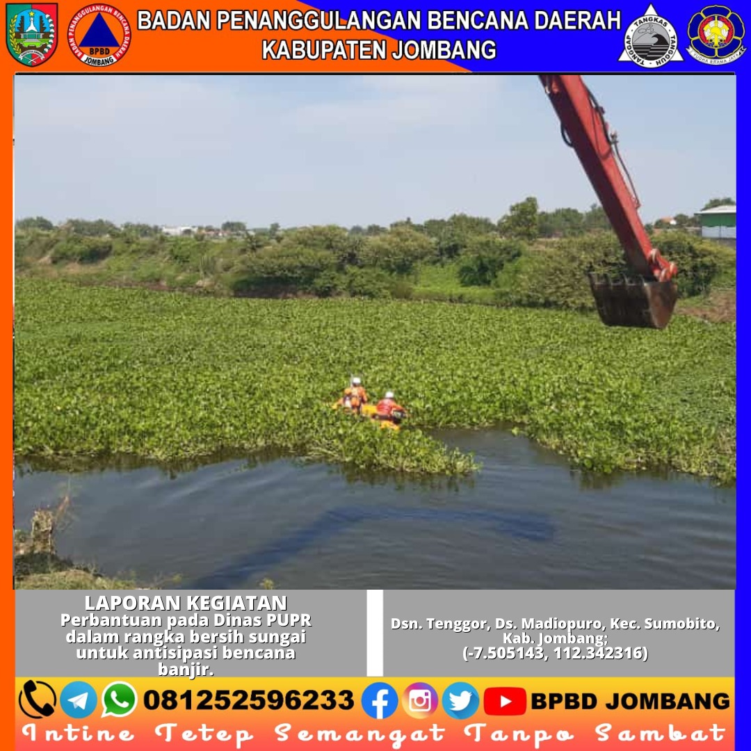 Kabupaten Jombang melakukan upaya antisipasi bencana banjir dengan membantu Dinas PUPR membersihkan sungai. Dalam upaya tersebut, PusdalOps BPBD Kabupaten Jombang melakukan kegiatan membersihkan sungai di Dsn. Tenggor, Desa Madiopuro, Kec. Sumobito, Kab. Jombang.