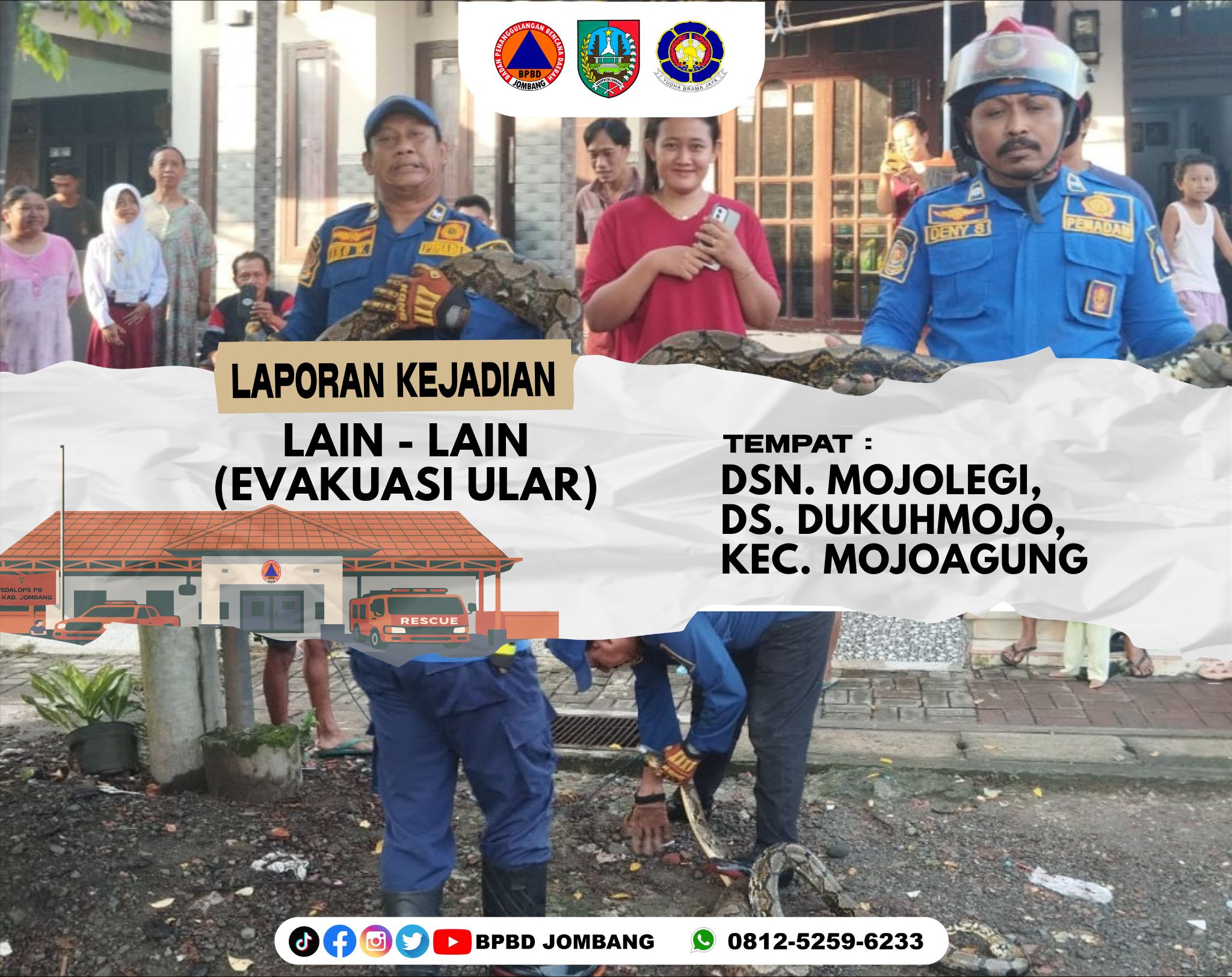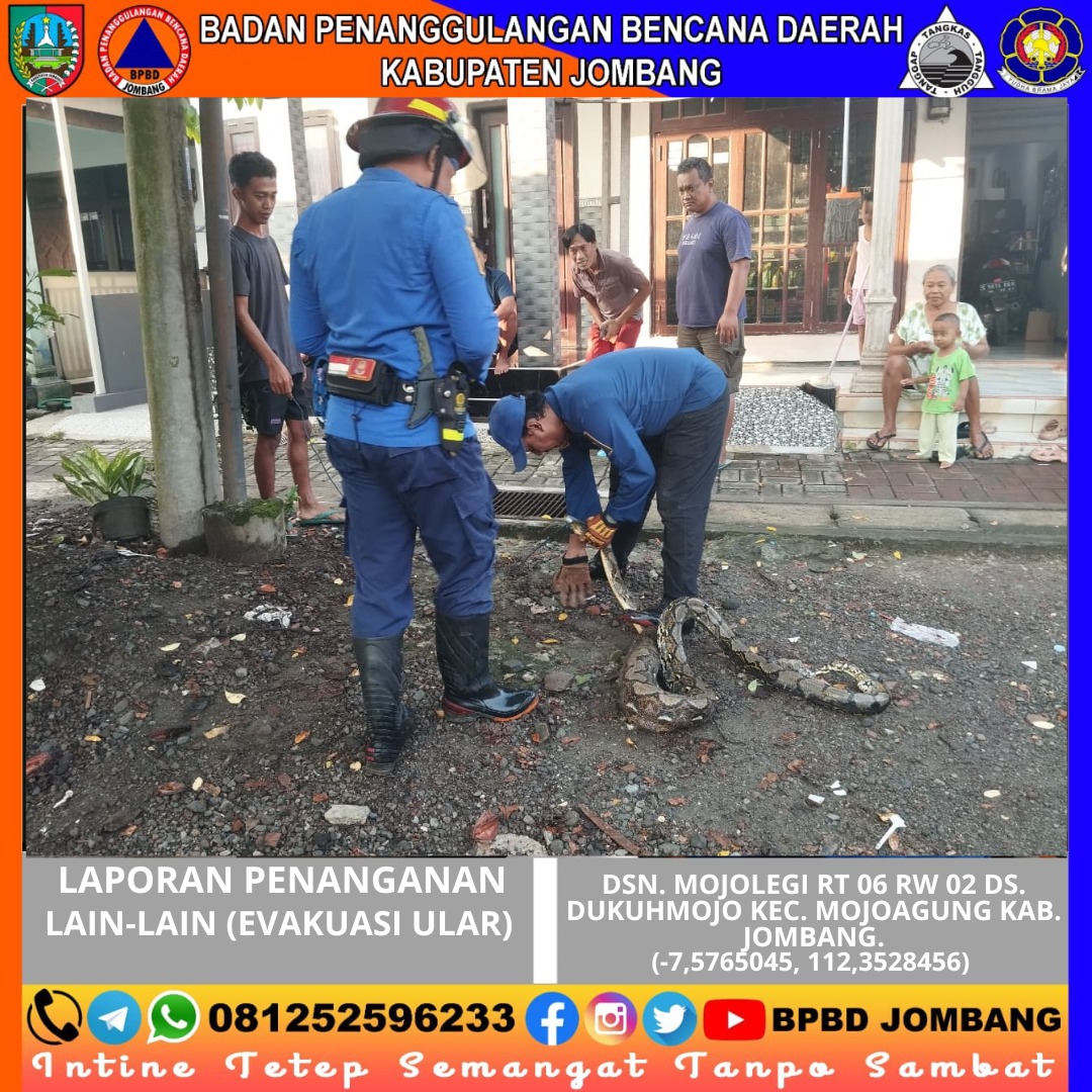 Menindaklanjuti laporan tersebut, tim dari Pos Damkar Mojoagung di bawah koordinasi Badan Penanggulangan Bencana Daerah Kabupaten Jombang bergerak cepat menuju lokasi dengan membawa peralatan evakuasi. Setibanya di lokasi, petugas langsung melakukan penanganan secara hati-hati guna menghindari risiko bagi warga sekitar.