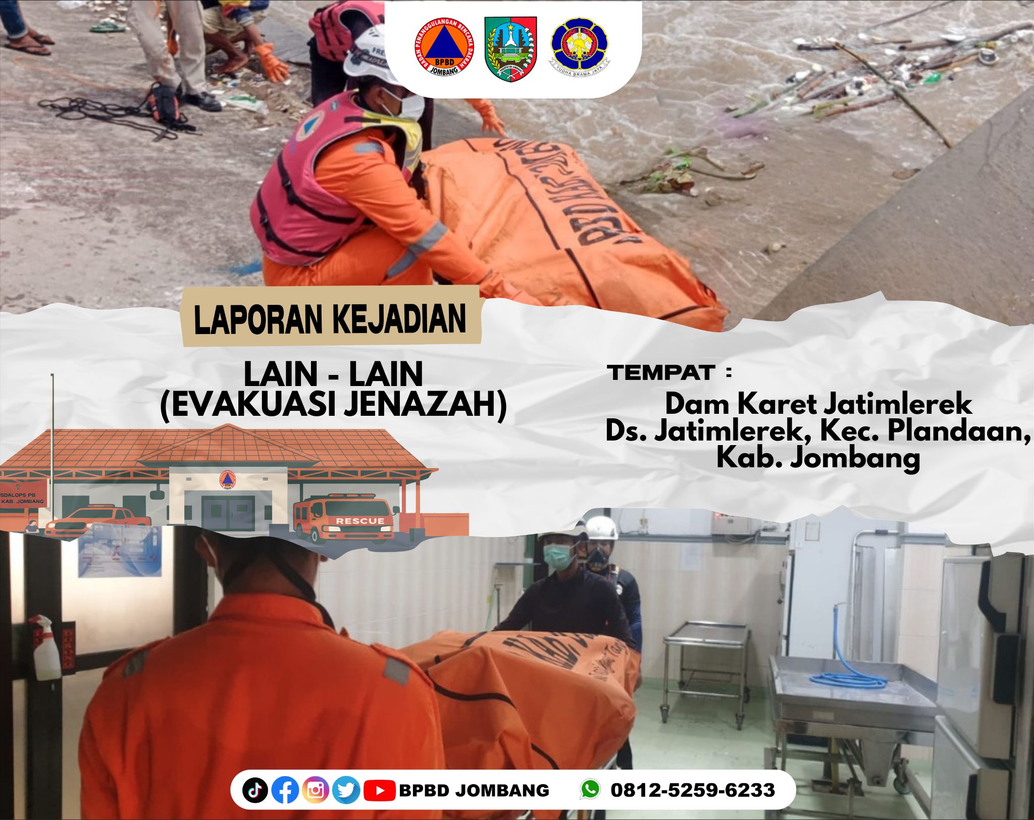 Peristiwa bermula saat warga sekitar mengetahui adanya jenazah yang mengapung di area pintu air sungai pada pagi hari. Mengingat lokasi berada di kawasan bendung dengan kondisi arus yang berpotensi membahayakan, warga segera melaporkan temuan tersebut kepada perangkat desa dan Polsek setempat guna mendapatkan penanganan lebih lanjut. Laporan tersebut kemudian diteruskan kepada Pusdalops PB BPBD Kabupaten Jombang sebagai instansi yang memiliki tugas dan fungsi dalam penanganan kedaruratan.