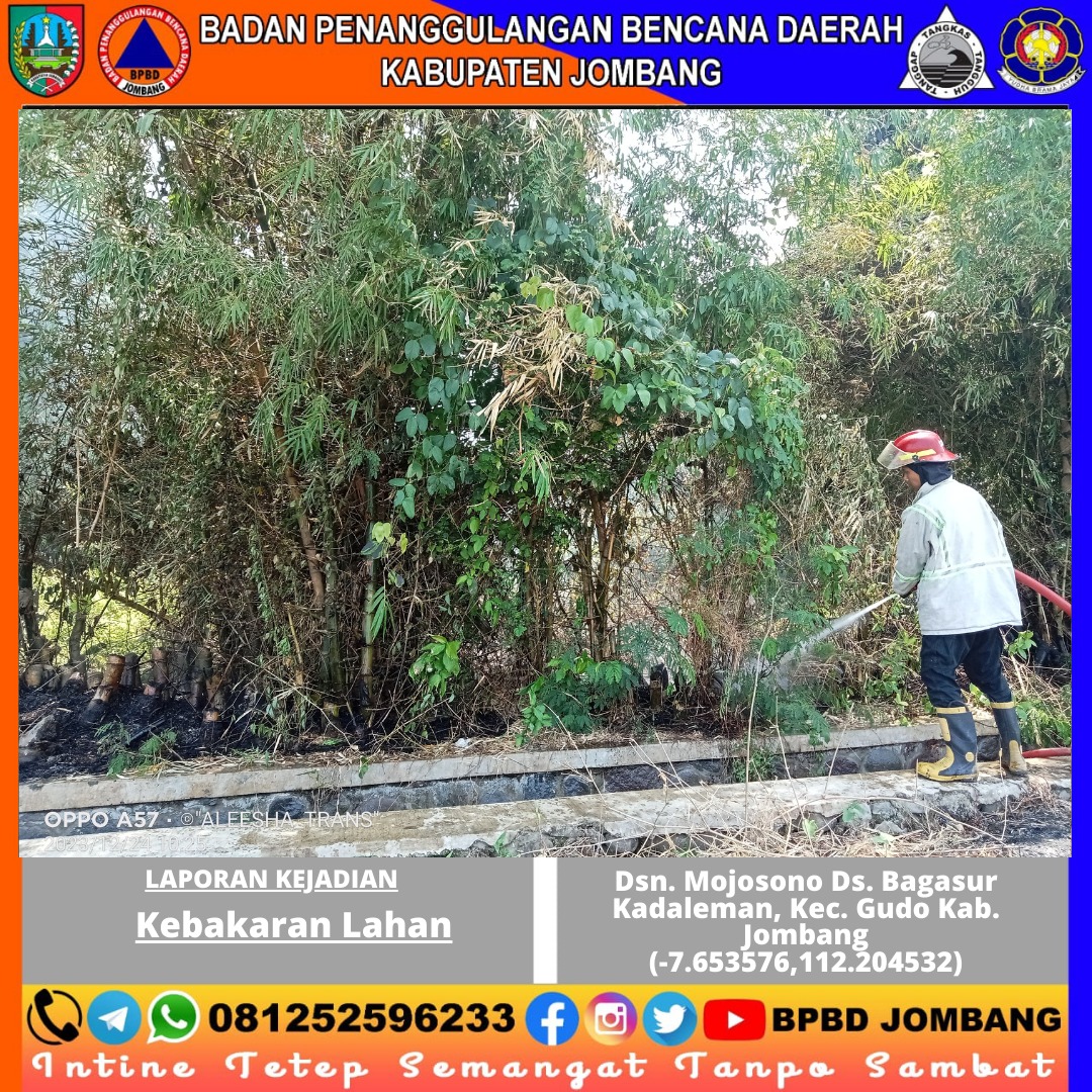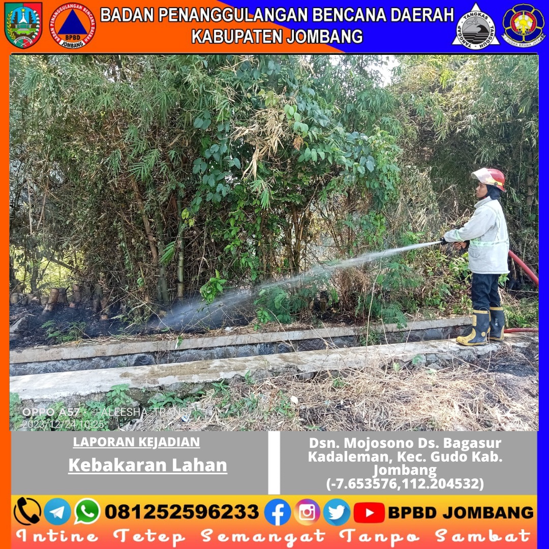 PadaMinggu, 24 Desember 2023, pukul 09.53 WIB, warga di Dsn. Mojosono Ds. Bagasur Kadaleman, Kec. Gudo, Jombang menyaksikan kebakaran lahan yang berasal dari lokasi rumpun bambu. Penyebab kebakaran diduga akibat sisa pembakaran sebelumnya.