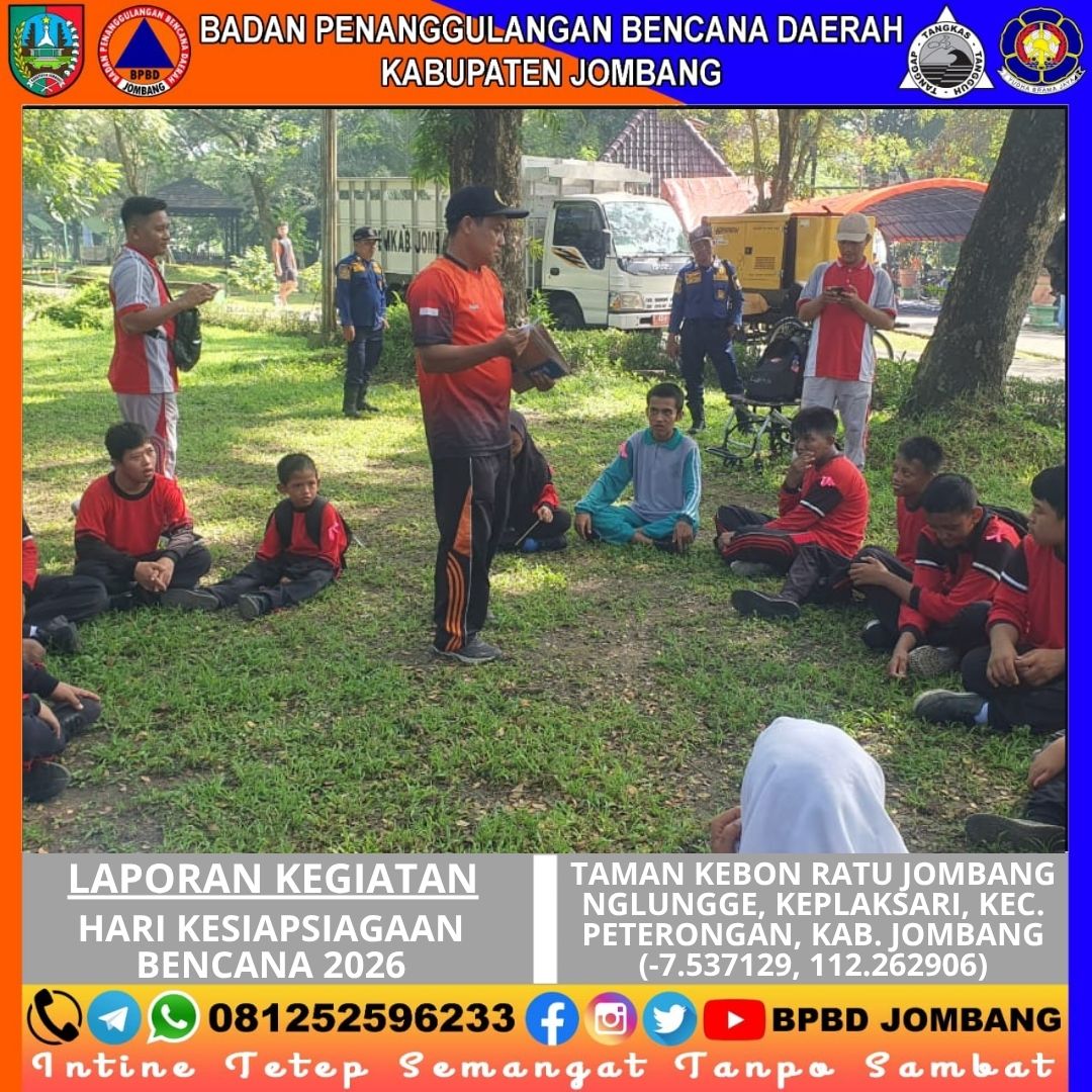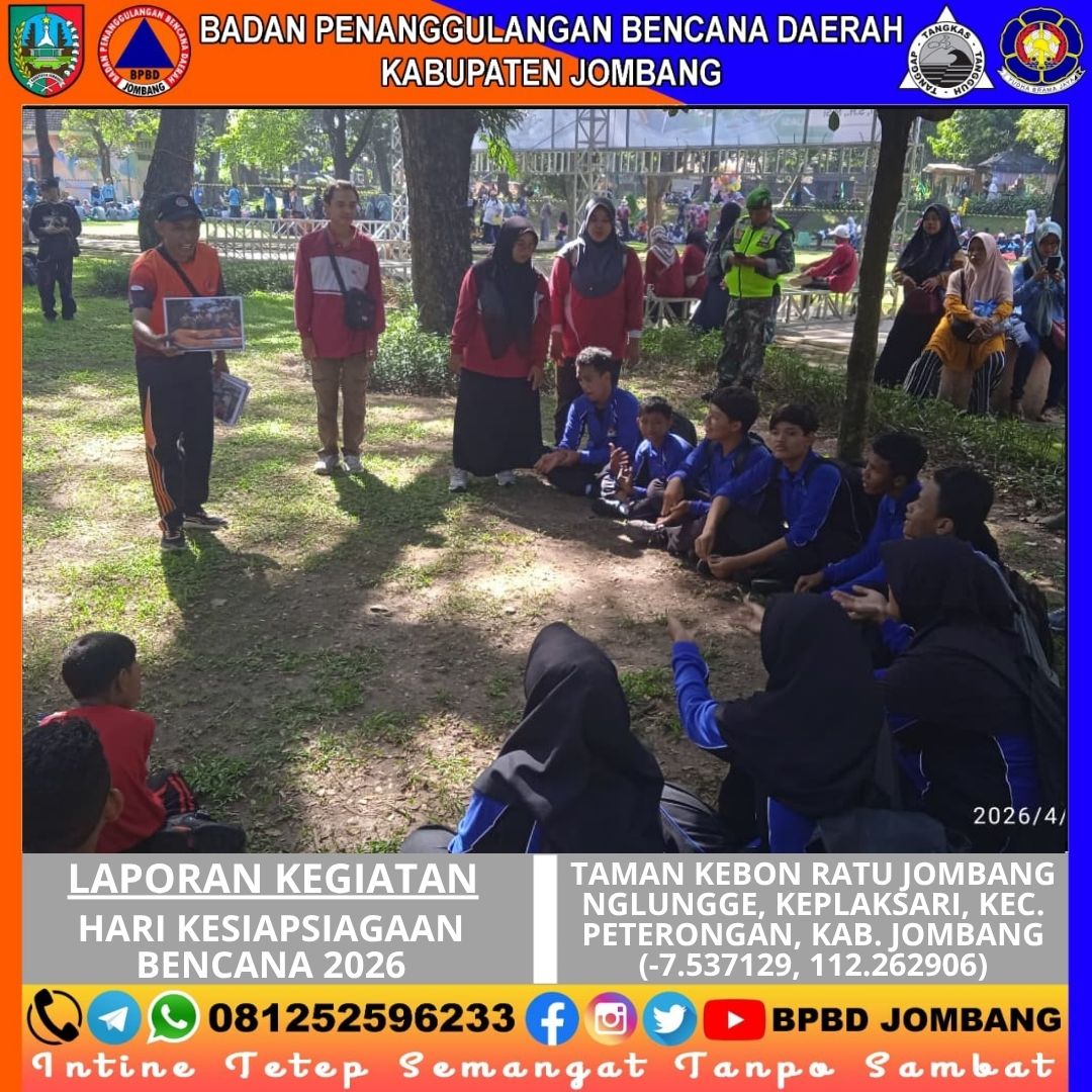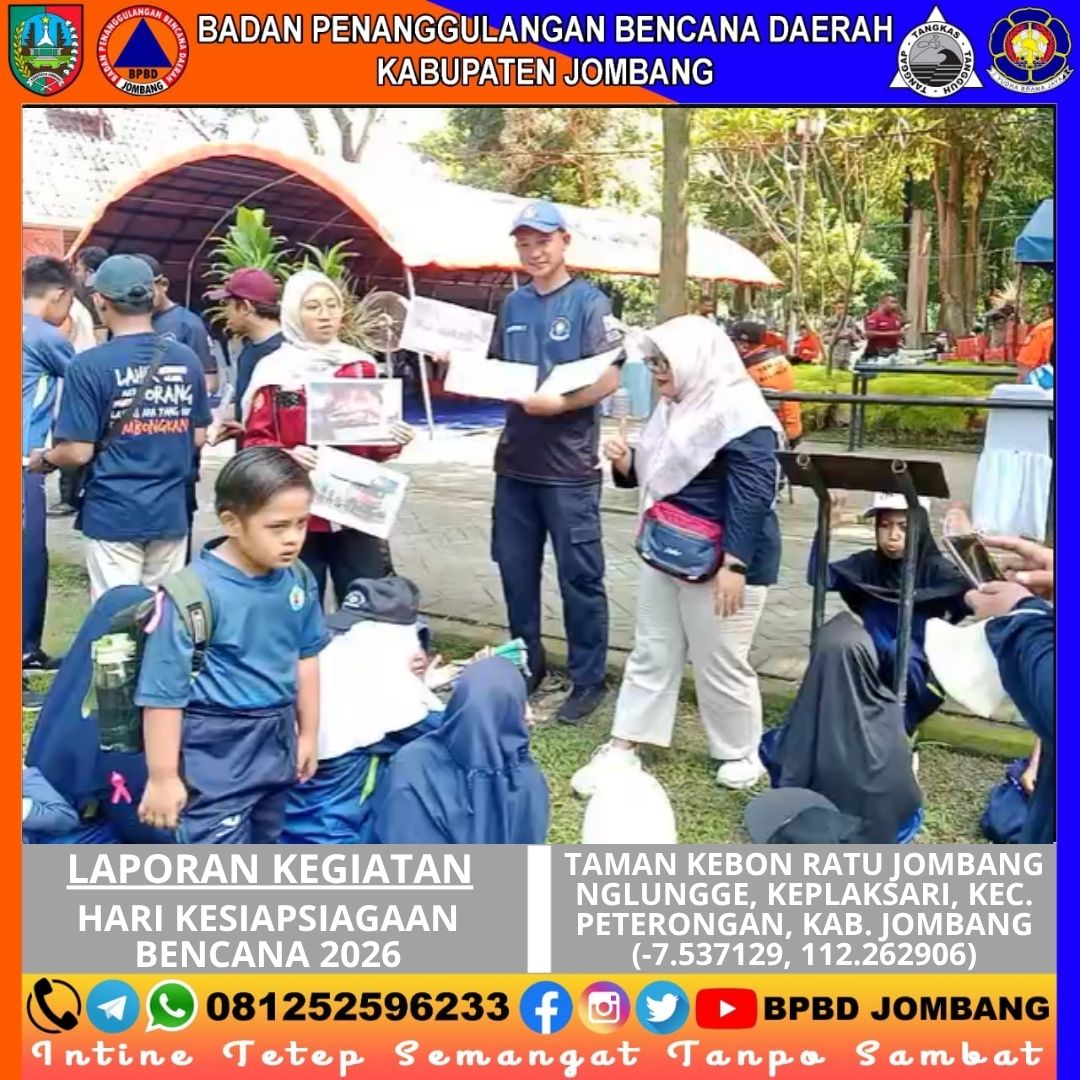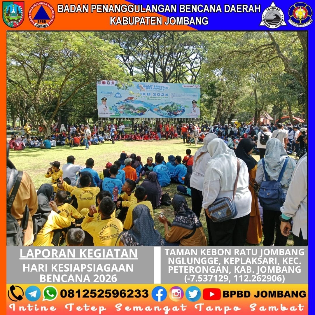 Dalam rangka meningkatkan kesadaran dan kesiapsiagaan masyarakat terhadap potensi bencana, Badan Penanggulangan Bencana Daerah Kabupaten Jombang bersama tim Pemadam Kebakaran Kabupaten Jombang turut ambil bagian dalam peringatan Hari Kesiapsiagaan Bencana (HKB) 2026. Kegiatan ini dilaksanakan pada Minggu, 26 April 2026, bertempat di Taman Kebon Ratu.
