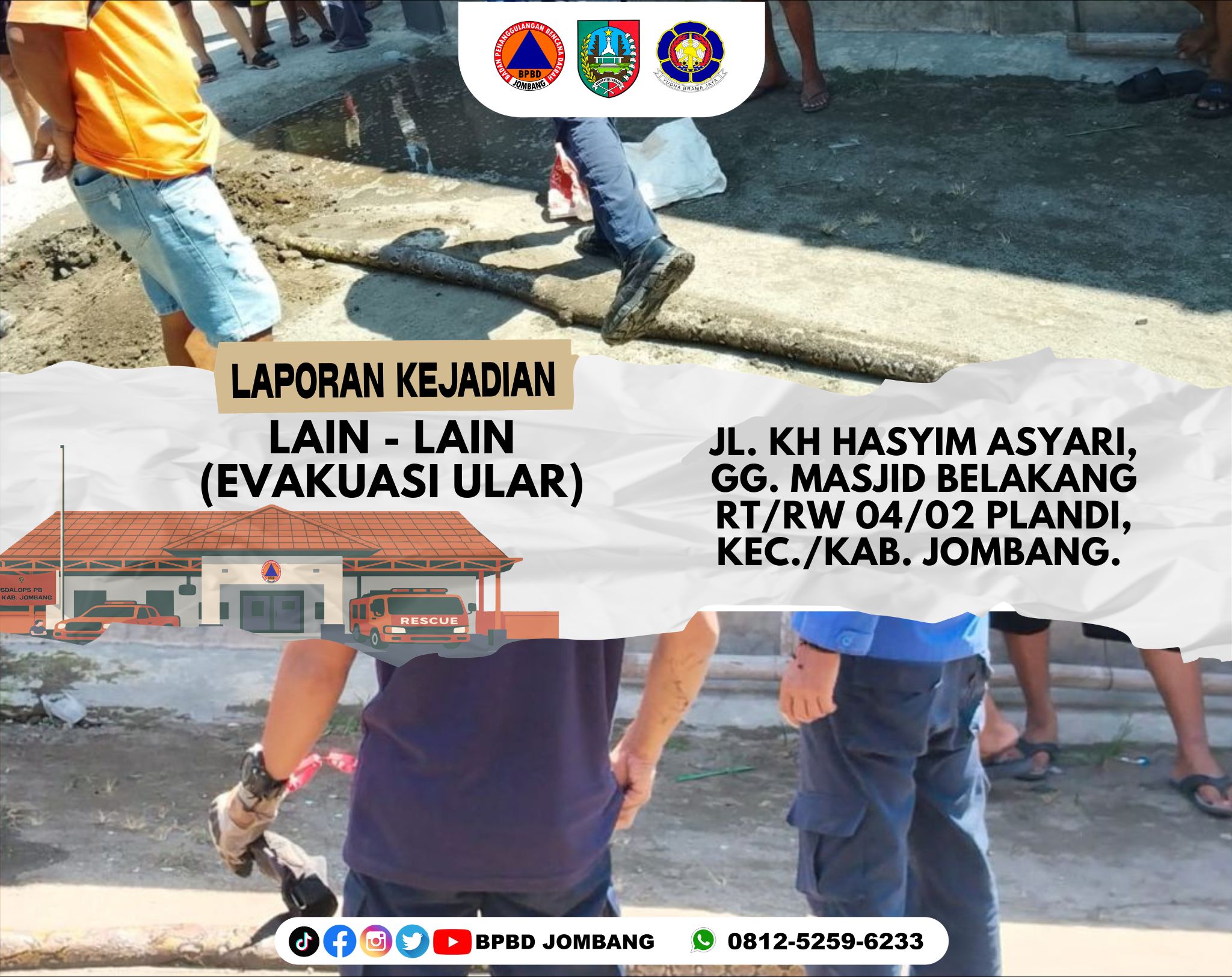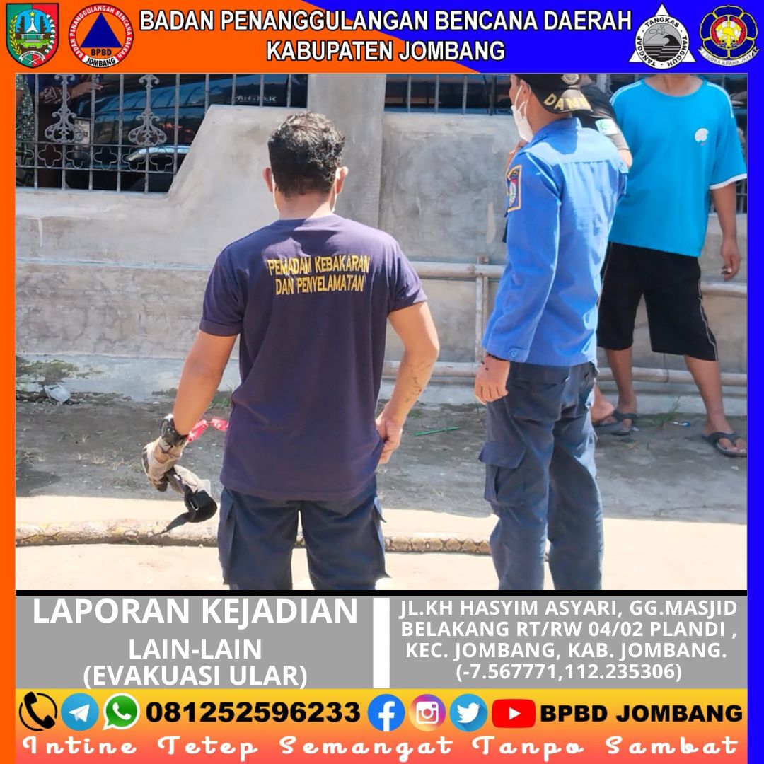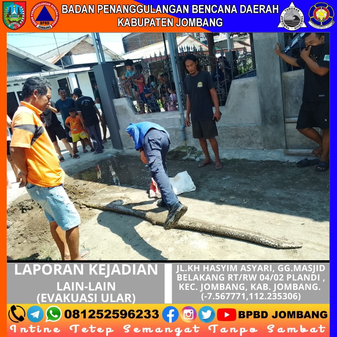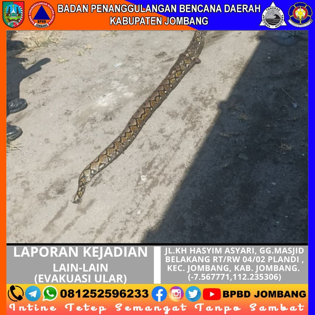 Kejadian yang sempat meresahkan warga terjadi di kawasan Plandi, Kecamatan Jombang, pada Minggu, 26 April 2026. Seekor ular ditemukan berada di dalam saluran air (gorong-gorong) tepat di depan rumah warga, sehingga menimbulkan kekhawatiran akan keselamatan lingkungan sekitar.
