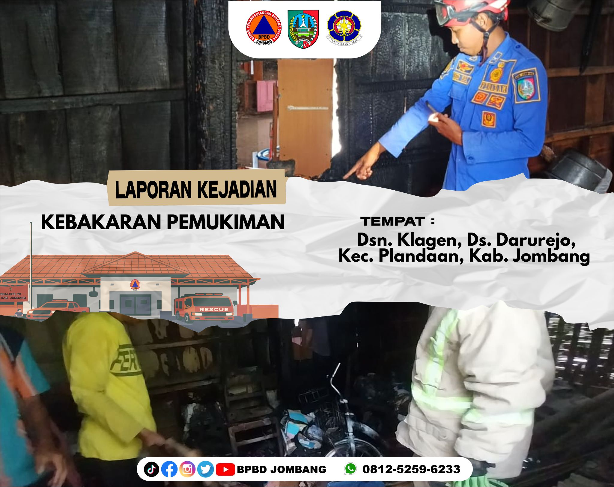 Peristiwa kebakaran pemukiman kembali terjadi di wilayah Kabupaten Jombang. Kali ini, kebakaran menimpa rumah milik Bapak Supa’at yang berlokasi di Dusun Klagen, RT 07/RW 02, Desa Darurejo, Kecamatan Plandaan, pada Sabtu (14/02/2026). Insiden tersebut menyebabkan ruang dapur berukuran kurang lebih 4 x 6 meter mengalami kerusakan akibat terbakar.