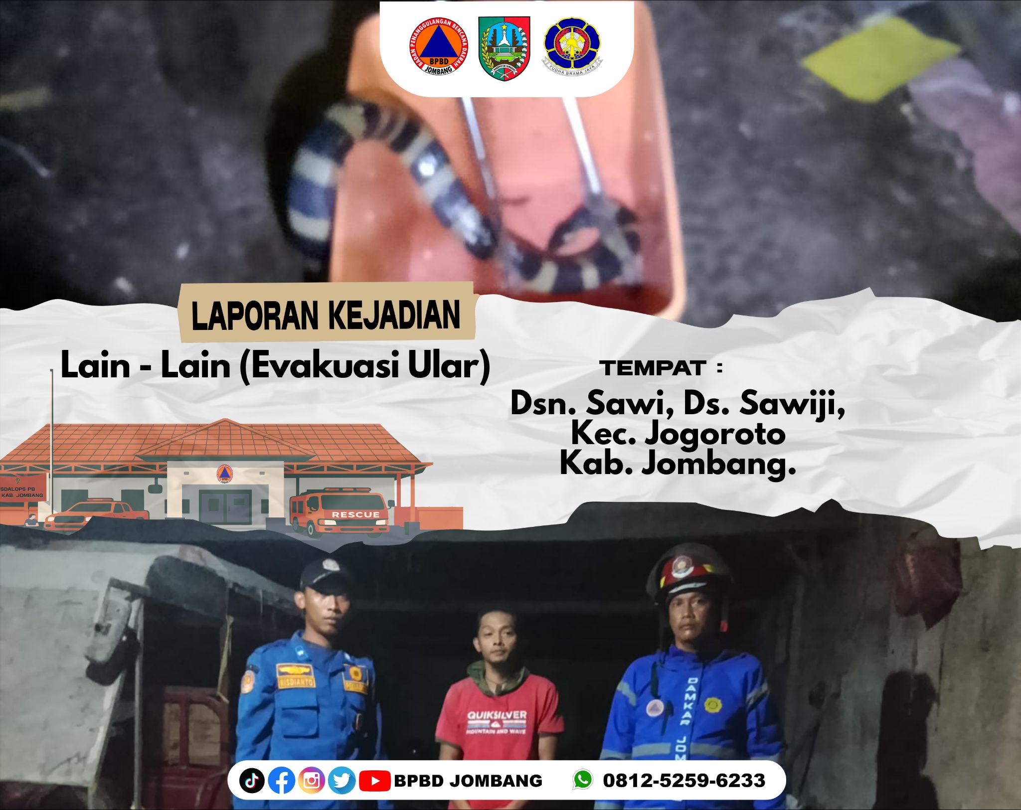 Respons cepat kembali ditunjukkan oleh unsur penyelamatan di bawah koordinasi penanganan darurat Kabupaten Jombang pada Senin malam, 9 Februari 2026, saat menerima laporan adanya ular yang masuk ke area rumah warga di Dusun Sawi RT 06 RW 02, Desa Sawiji, Kecamatan Jogoroto. Keberadaan satwa liar tersebut menimbulkan keresahan sekaligus potensi bahaya bagi penghuni rumah.