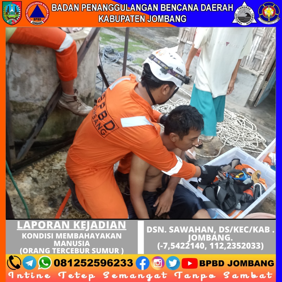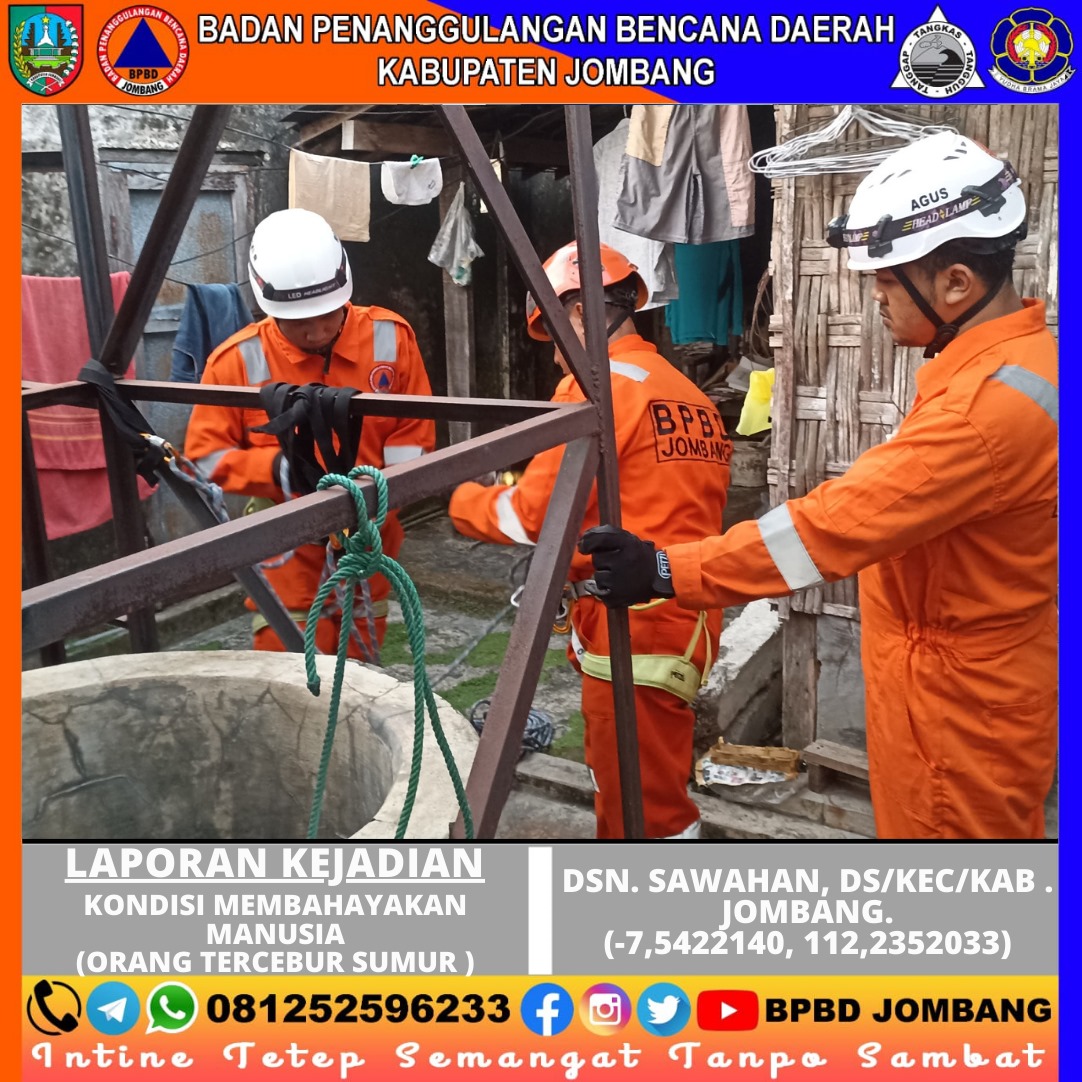 Jum'at, 24 Mei 2024 pukul 05.10 WIB terdapat seorang warga mendatangi kantor BPBD Kab. Jombang dan melaporkan adanya kejadian Orang tercebur dalam sumur. Kronologi singkatnya seorang ibu (orang tua korban) yang hendak melaksanakan sholat subuh mencari anaknya, tetapi setelah dicari cukup lama anaknya masih tidak ditemukan. Selang begitu lama terdengar suara anaknya yang terdapat masuk dalam sebuah sumur tua di dekat rumahnya.