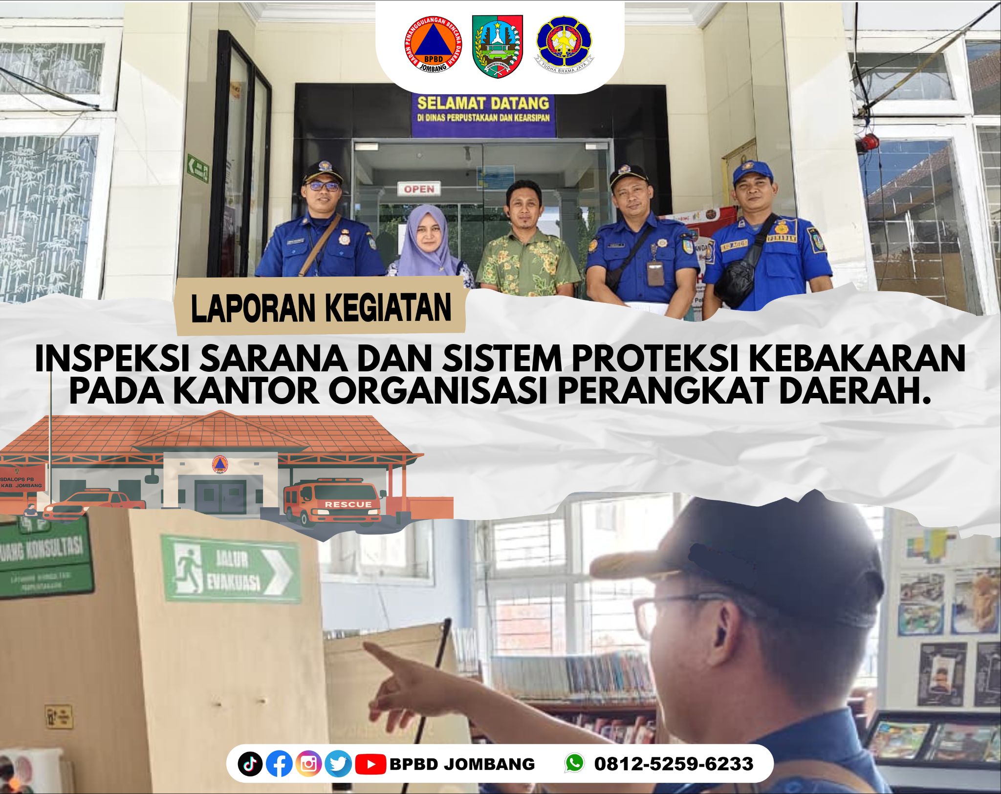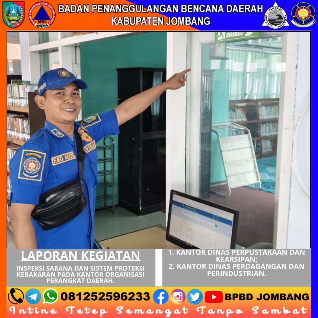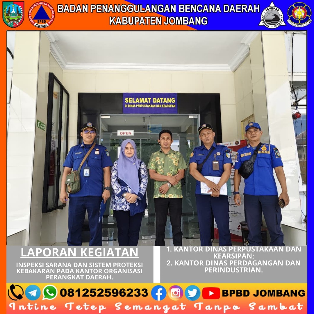 Inspeksi dilakukan di dua lokasi, yaitu Kantor Dinas Perpustakaan dan Kearsipan Kabupaten Jombang serta Kantor Dinas Perdagangan dan Perindustrian Kabupaten Jombang. Kegiatan tersebut dilaksanakan oleh Tim Inspektur Pemadam Kebakaran dan Penyelamatan BPBD Kabupaten Jombang bersama personel dari Pos Damkar Jombang sebagai bagian dari upaya preventif untuk memastikan sarana proteksi kebakaran di lingkungan perkantoran pemerintah dapat berfungsi dengan baik.