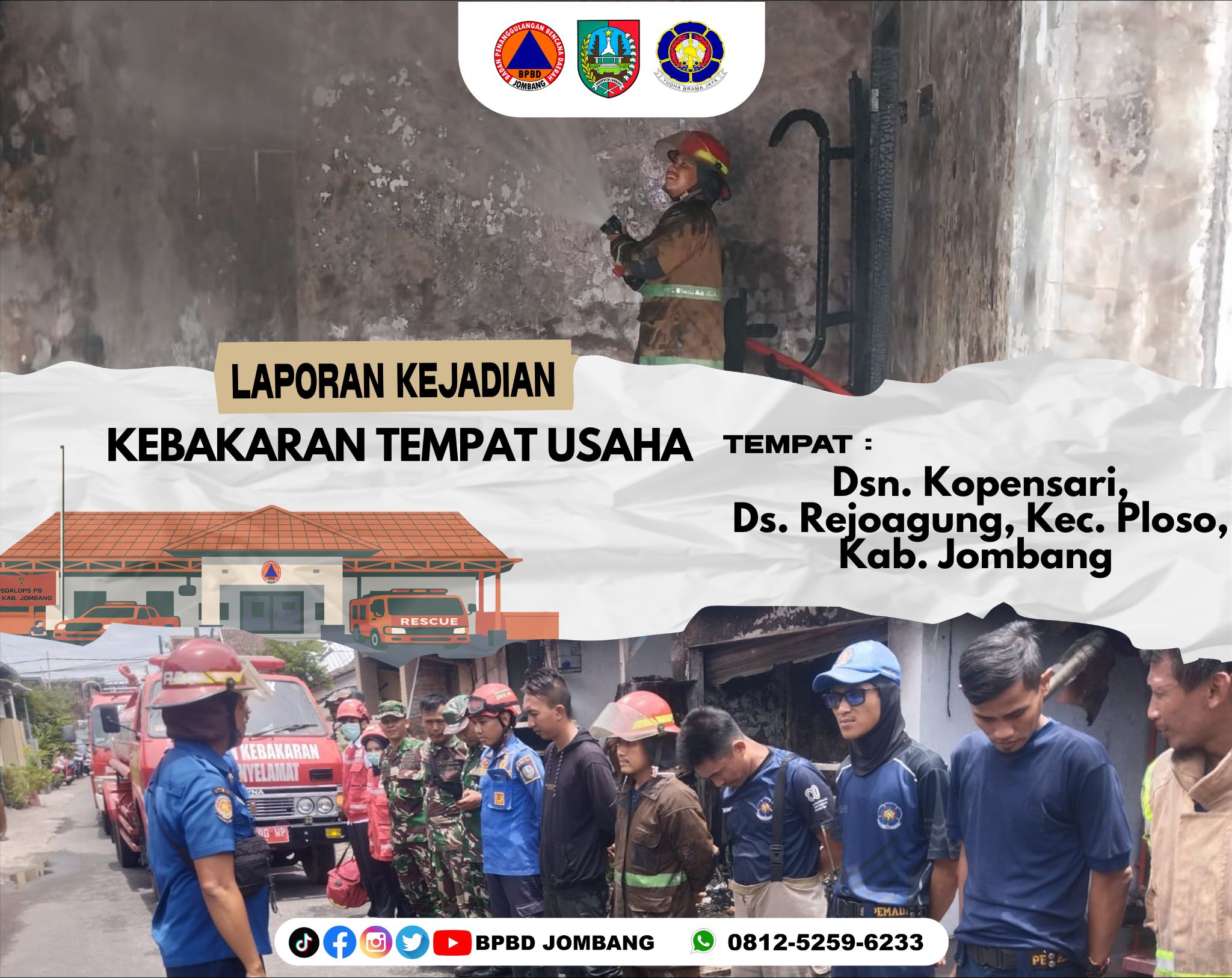 Jombang, 26 Februari 2026 — Kebakaran tempat usaha terjadi di Dusun Kopensari RT 02/RW 04, Desa Rejoagung, Kecamatan Ploso, Kabupaten Jombang, pada Kamis siang. Insiden ini menghanguskan sebuah toko berukuran sekitar 6 x 4 meter beserta isinya dan mengakibatkan satu orang mengalami luka bakar.