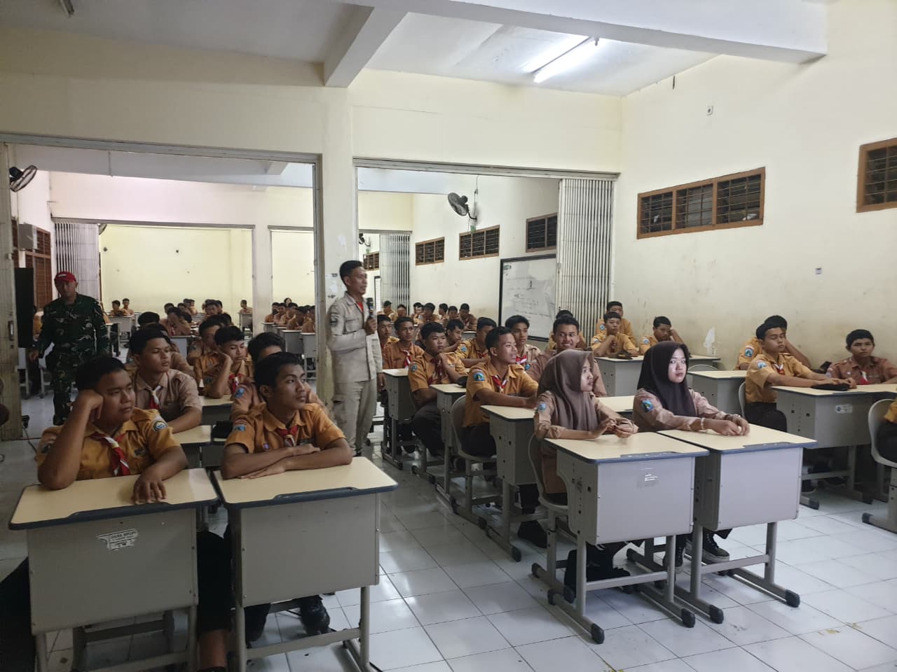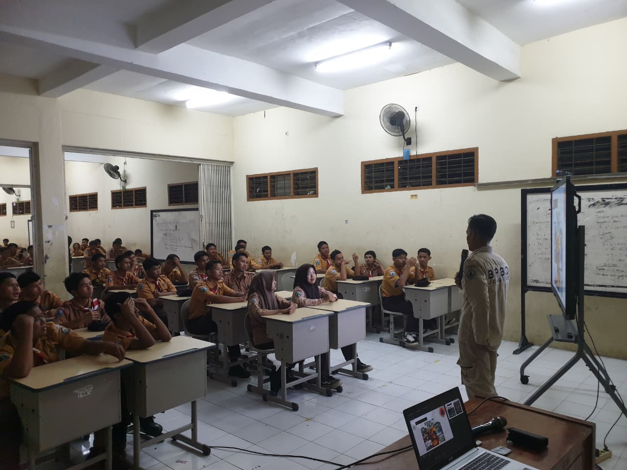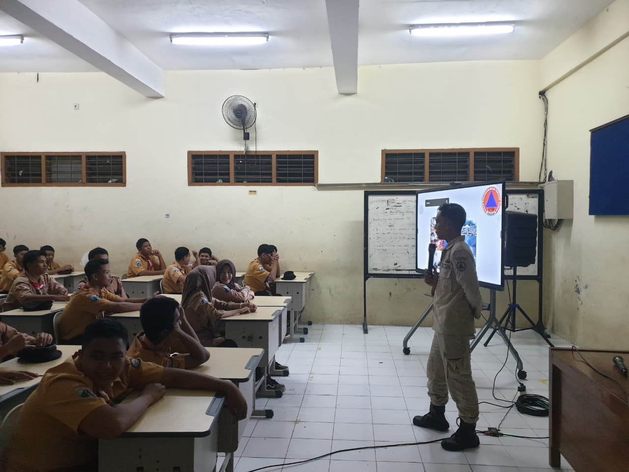 Suasana kegiatan berlangsung interaktif, di mana para kadet aktif bertanya dan berdiskusi mengenai berbagai potensi risiko bencana di sekitar mereka. Hal ini menunjukkan tingginya minat dan kesadaran pelajar terhadap isu kebencanaan.