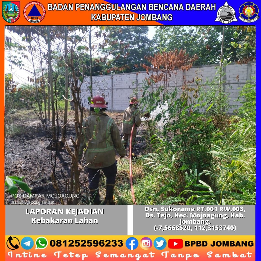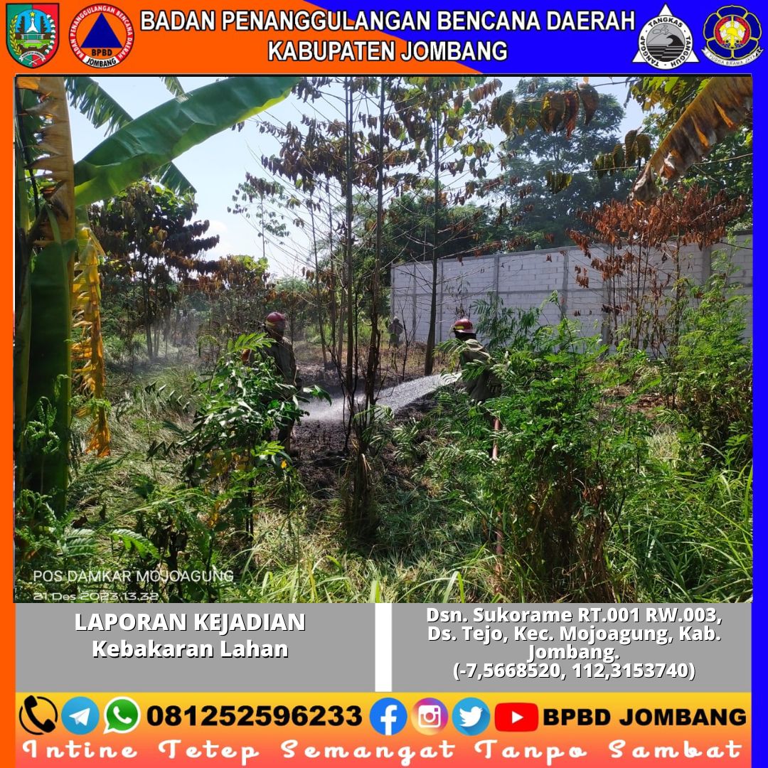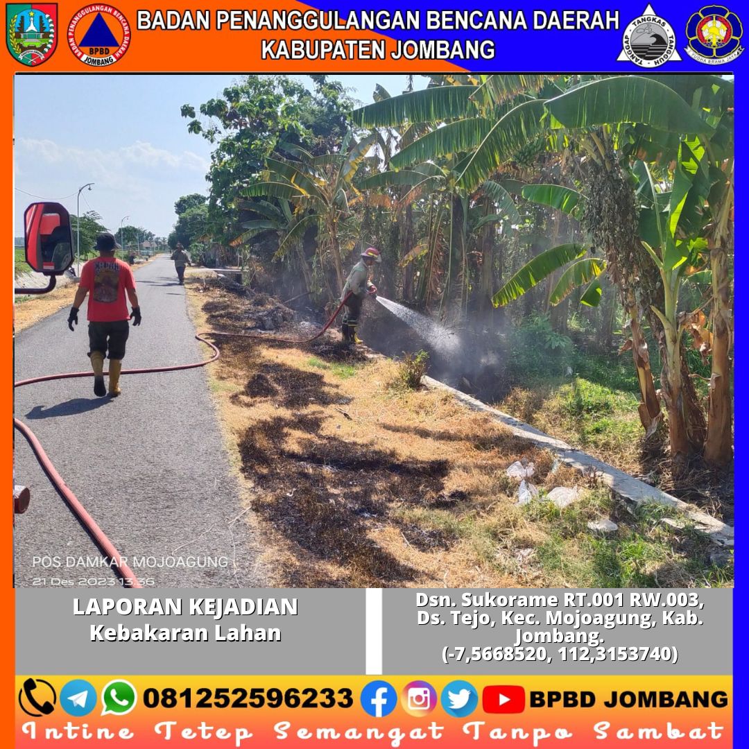 Pemadam Kebakaran Kabupaten Jombang melakukan upaya menangani kasus kebakaran lahan di Dsn. Sukorame RT.001 RW.003, Ds. Tejo, Kec. Mojoagung, Kab. Jombang (-7,5668520, 112,3153740). Acara ini dilaksanakan pada Kamis, 21 Desember 2023, Pukul 13.24 WIB.