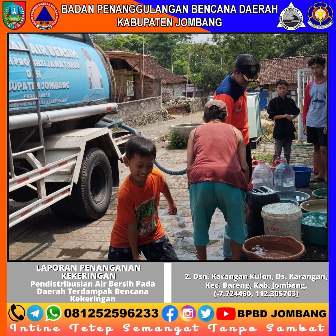 PusdalOps BPBD Kabupaten Jombang melakukan pendistribusian air bersih untuk masyarakat terdampak kekeringan di dua tempat yakni Dsn. Serning, Ds. Banjaragung, Kec. Bareng, Kab. Jombang dan Dsn. Karangan Kulon, Ds. Karangan, Kec. Bareng, Kab. Jombang. (-7.724460, 112.305703). Pendistribusian air bersih ini dilaksanakan pada Minggu, 31 Desember 2023, Pukul 07.30 – 16.30 WIB